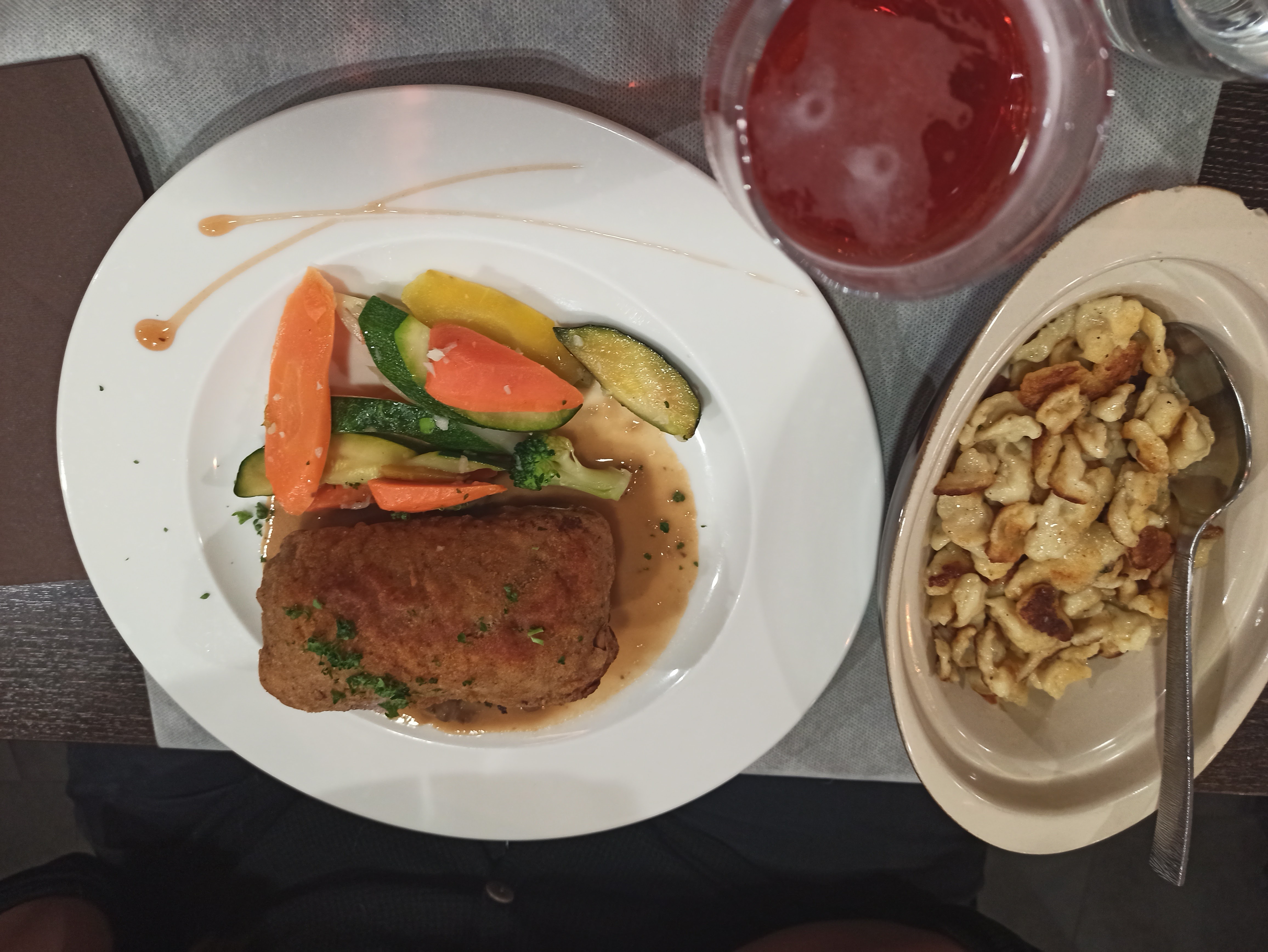 Bonne ambiance, bon prix. Nous avons eu l'escalope de veau qui était bonne mais pas spéciale. Nos vins Riesling étaient excellents. Le service était très bon, accommodant notre pauvre allemand.