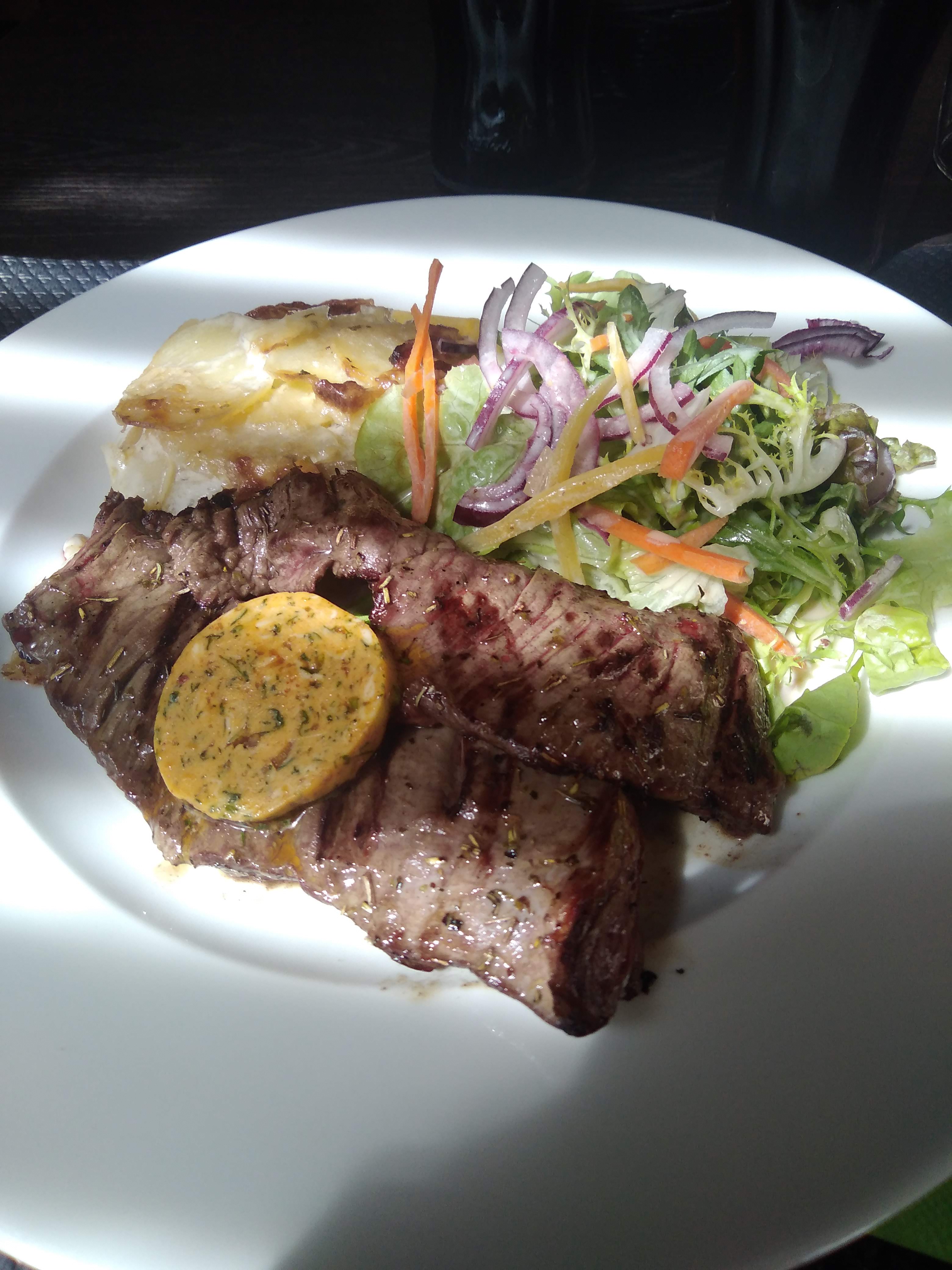Très bon restaurant. La bavette était très bonne. J'ai été surprise par la présentation du dessert j'ai commandé un duo de mousse chocolat blanc et lait il m'on ramener le dessert sous forme de boule de glace ..