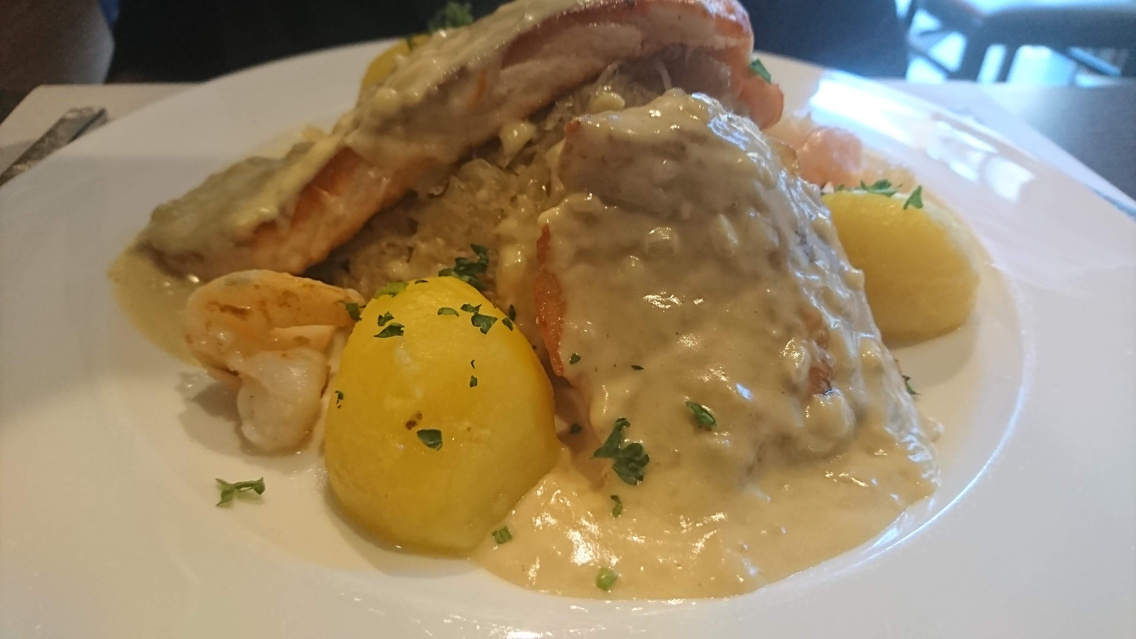 1er restaurant à Strasbourg. J’ai pu manger une délicieuse choucroute de poisson ainsi qu’un très bon fondant au chocolat choisi parmi une liste de desserts fait maison 😋
