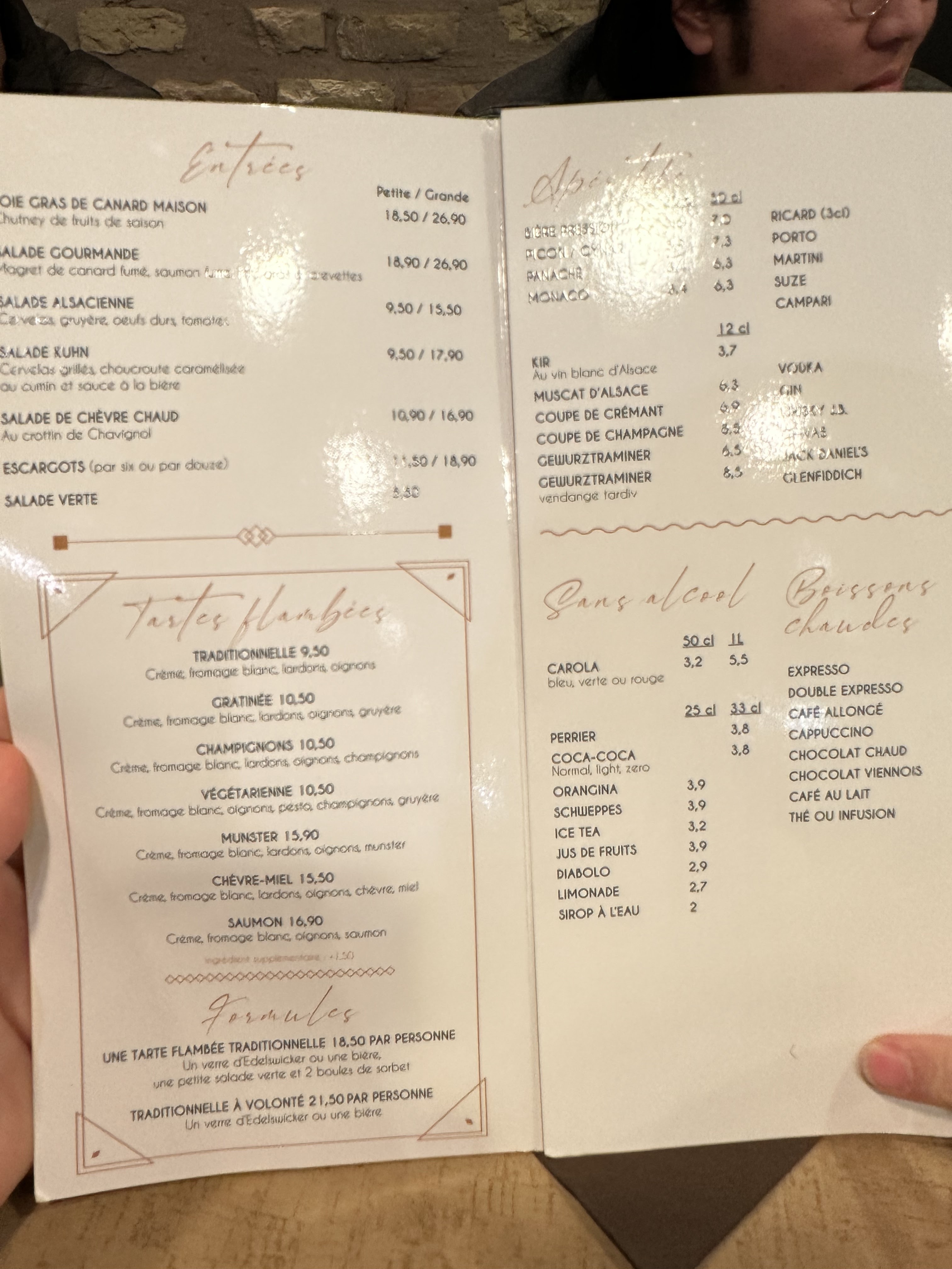 Nous avons appelé au dernier moment pour réserver et le serveur nous a gentiment garanti qu’il nous trouverait une place même s’ils étaient complets. A l’arrivée effectivement la salle était remplie mais comme promis nous avons eu une table au bout de 2 minutes, en plus compte tenu du monde nous avons été servis très vite. La suggestion du jour (tataki de canard) était à tomber et la tarte flambée au munster était un vrai régal. Merci aux serveurs pour leur gentillesse et leur humeur agréable qui nous ont fait passer un excellent moment !