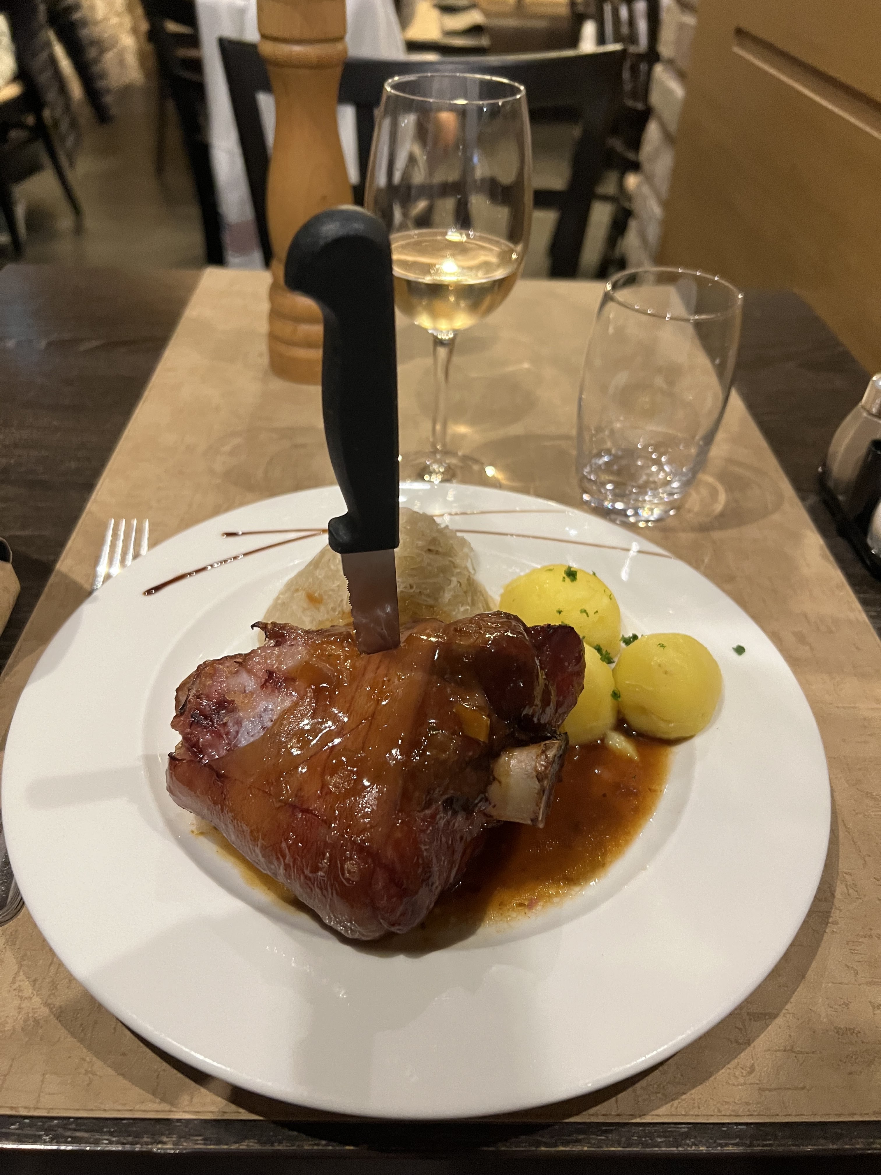 La nourriture était vraiment authentique mais il était assez difficile de convaincre le personnel de nous servir de l'eau. Il nous a fallu 4 essais pour enfin nous apporter une carafe d'eau. Essayez le jambonneau mijoté au pinot noir accompagné de choucroute !