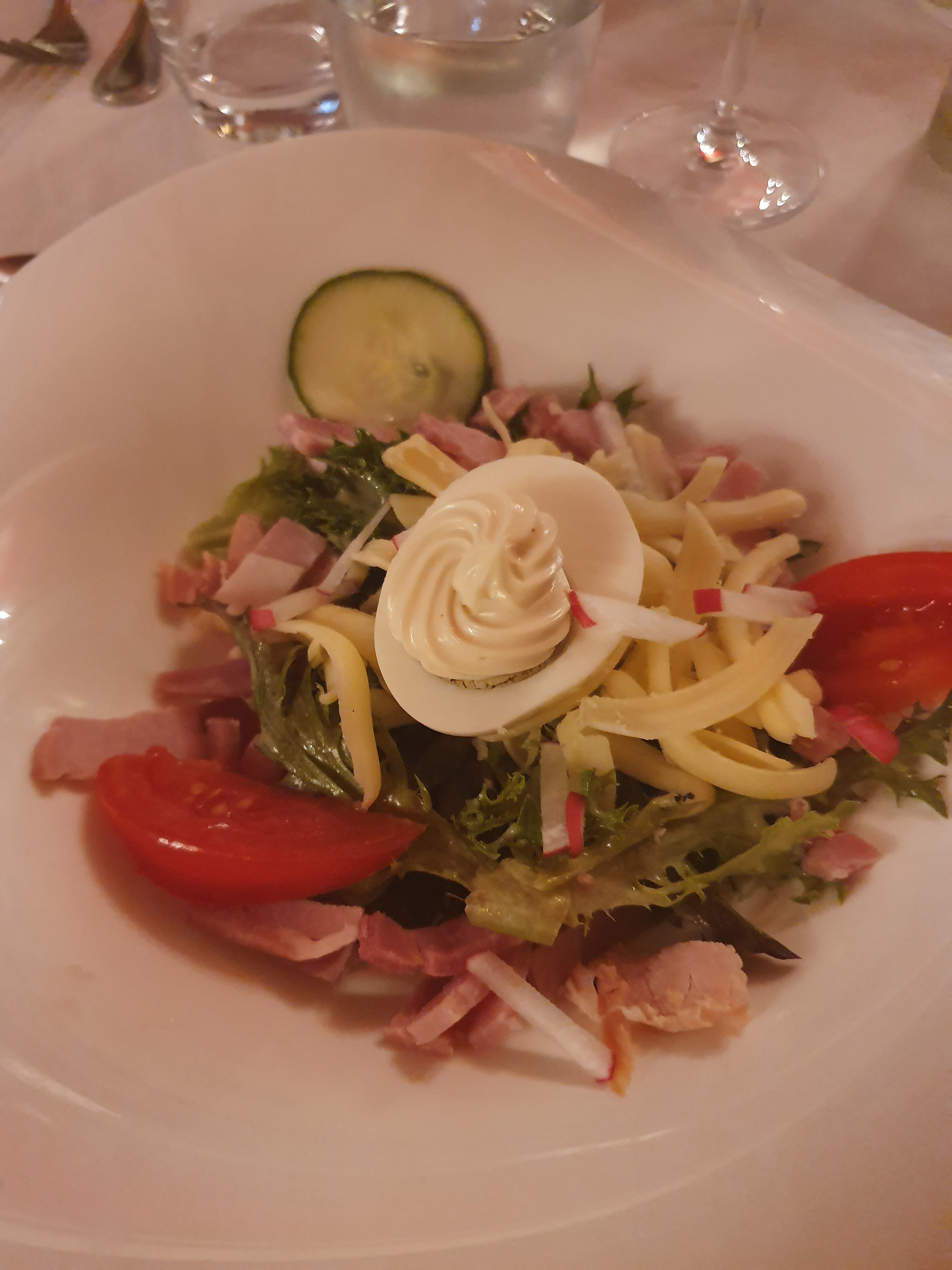 Moyen pas de chips a l' apéro bizarrement d autre table en avait.l accompnement avec le poulet était minimaliste et pensez à mettre du savon dans le lave main des toilettes sinon sur la carte des vins il y avait du vin en pichet et quand vous en demander il n'y en a pas ( pas très correct) pour ma part c'était passable