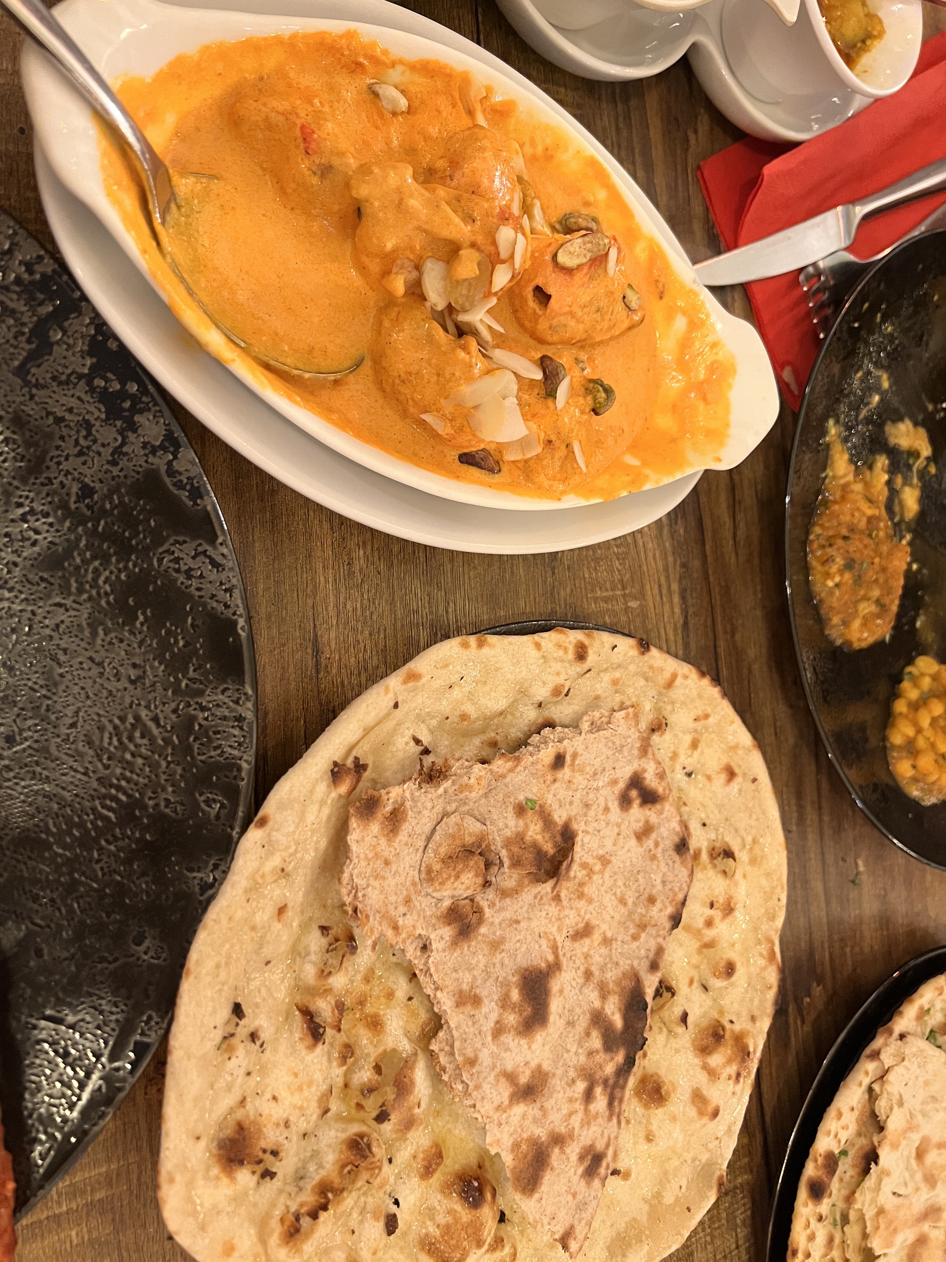 Bon restaurant mais sans plus. Nous avons beaucoup apprécié les plats, notamment le butter chicken. Cependant nous avons l’impression de ne pas avoir eu la même expérience que les autres clients: pas d’apéritif offert, on ne nous as pas demandé si nous voulions notre naan en entrée ou avec le plat pour saucé (ce qui me semble le plus logique), résultat un naan qui arrive avant tous les plats et qui fini froid le temps que le plat arrive, et riz qui arrive froid. Et un prix relativement élevé comparé à d’autres indiens que nous avons pu faire. Mais bon point pour l’amabilité des serveurs !