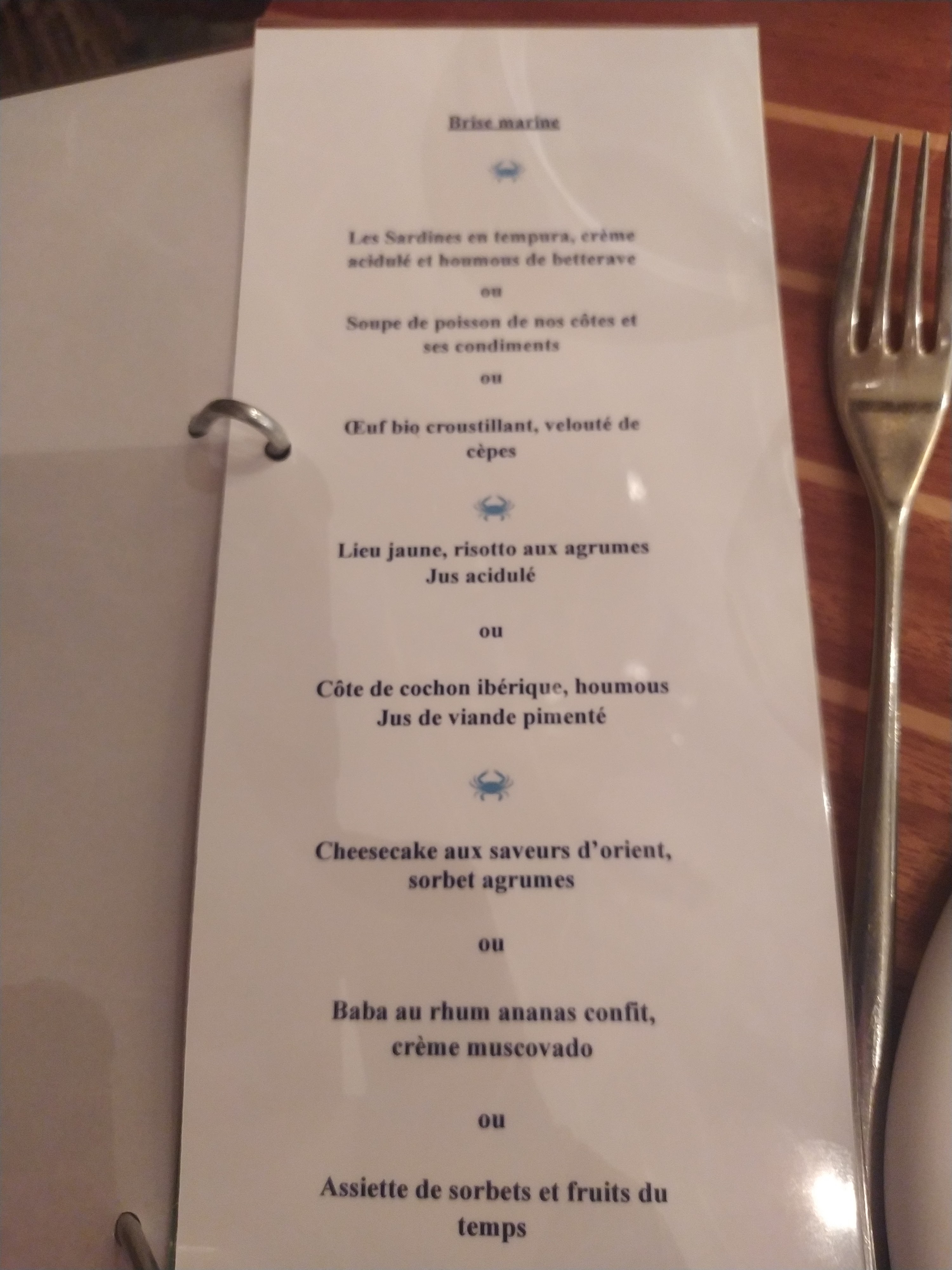 Menu du jour avec très bons plats avec cuisine raffinée avec produits simples mais sublimés par le chef. Ambiance marin et accueil chaleureux, adresse à conserver.