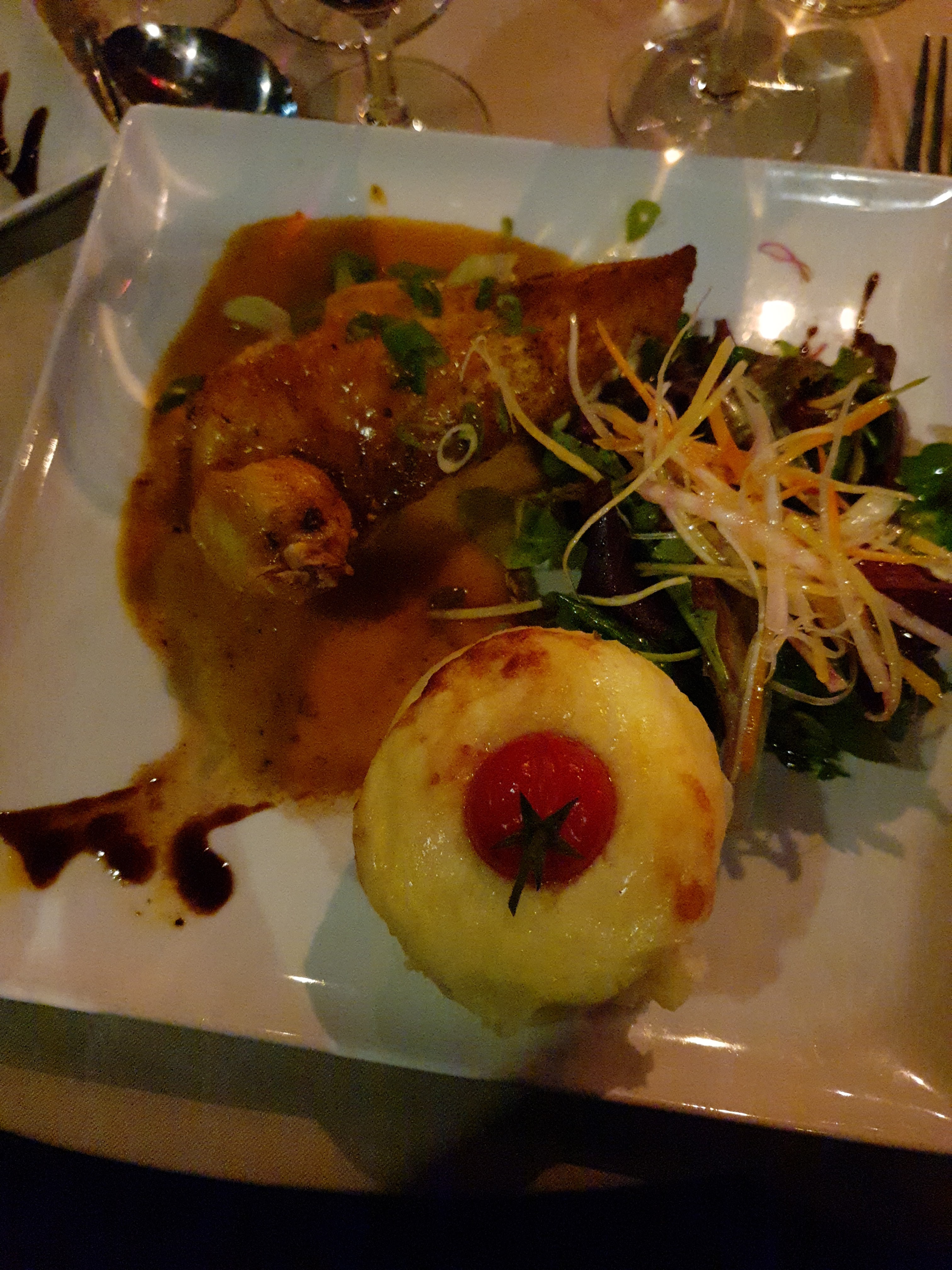 le repas etait tres bien 3 choix entree plat dessert, vous composez. Moi j ai testé carpaccio de chevre , cuisse de poulet farci ( la farce tres bonne) , salade de fruits revisitée. le tout tres bon , une chanteuse tres jolie voix, un peu de karaoke et de gros fous rires.... super ambiance et boite de night...pour finir tres bien. le tout pour 45 euros apéro et une coupe de champagne compris. rien a dire sauf d'y aller.