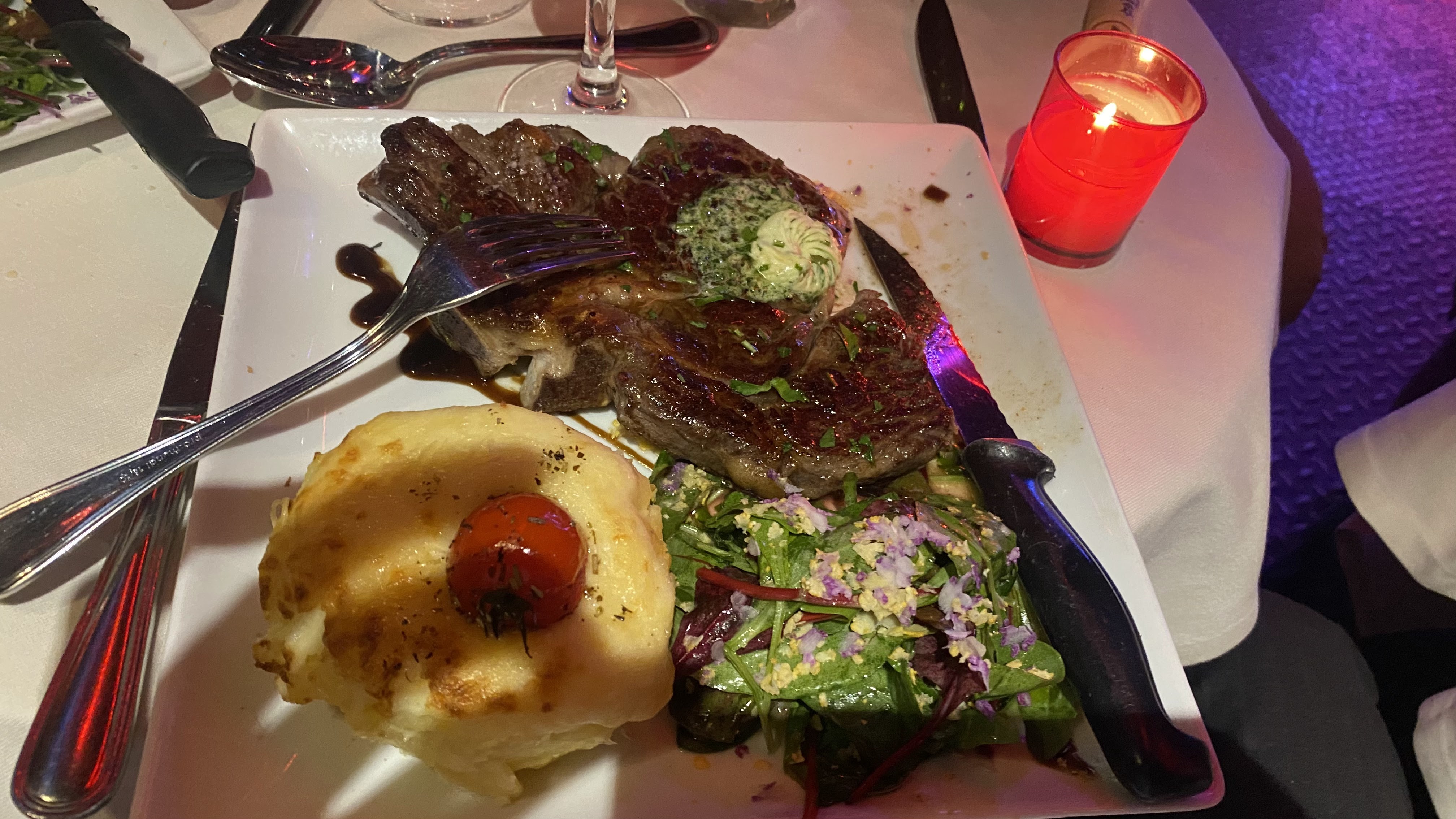 46€ c'est vraiment excessif, la qualité des plats n'est pas du tout à la hauteur de ce prix.. Viande Angus pleine de nerfs, gâteau sans goût... La soirée Karaoké + Magicien était bien drôle, on a bien rigolé, par contre le DJ pour la soirée club était un peu nul !! On se serait cru dans un camping !! Sans oublier : Mon amie à été malade toute la nuit après avoir mangé le saumon....