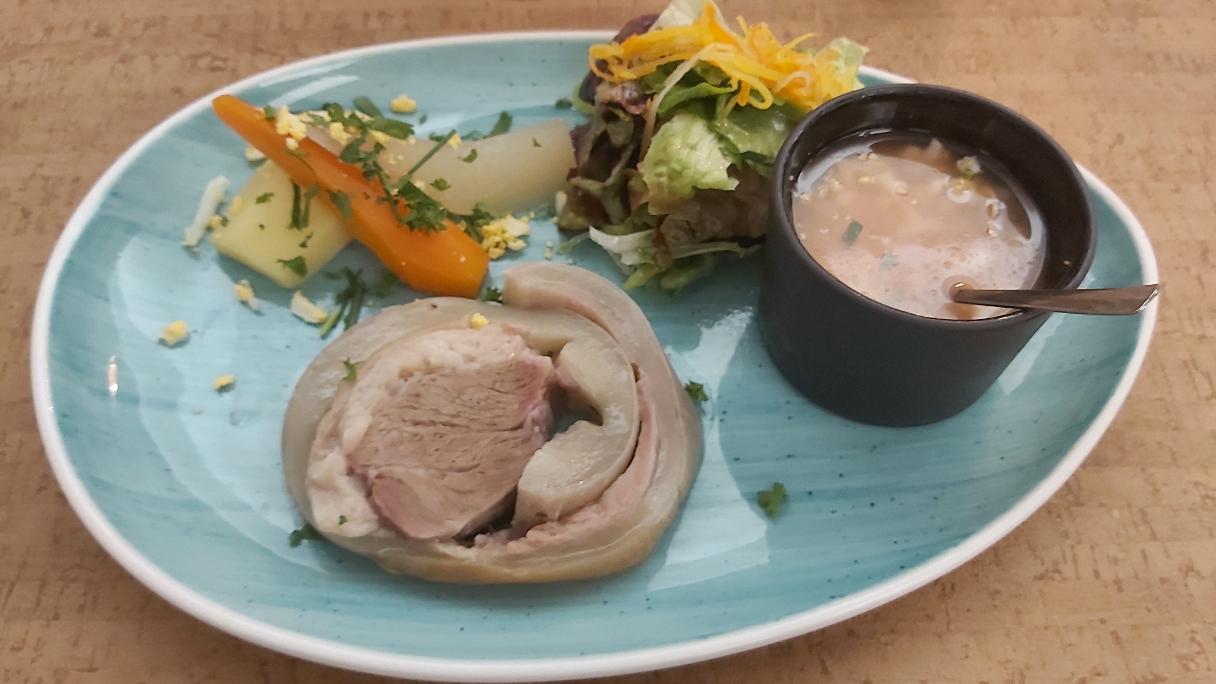 Tres bonne cuisine traditionnelle . Petit potage maison servi gracieusement le temps de la commande . Service agréable .