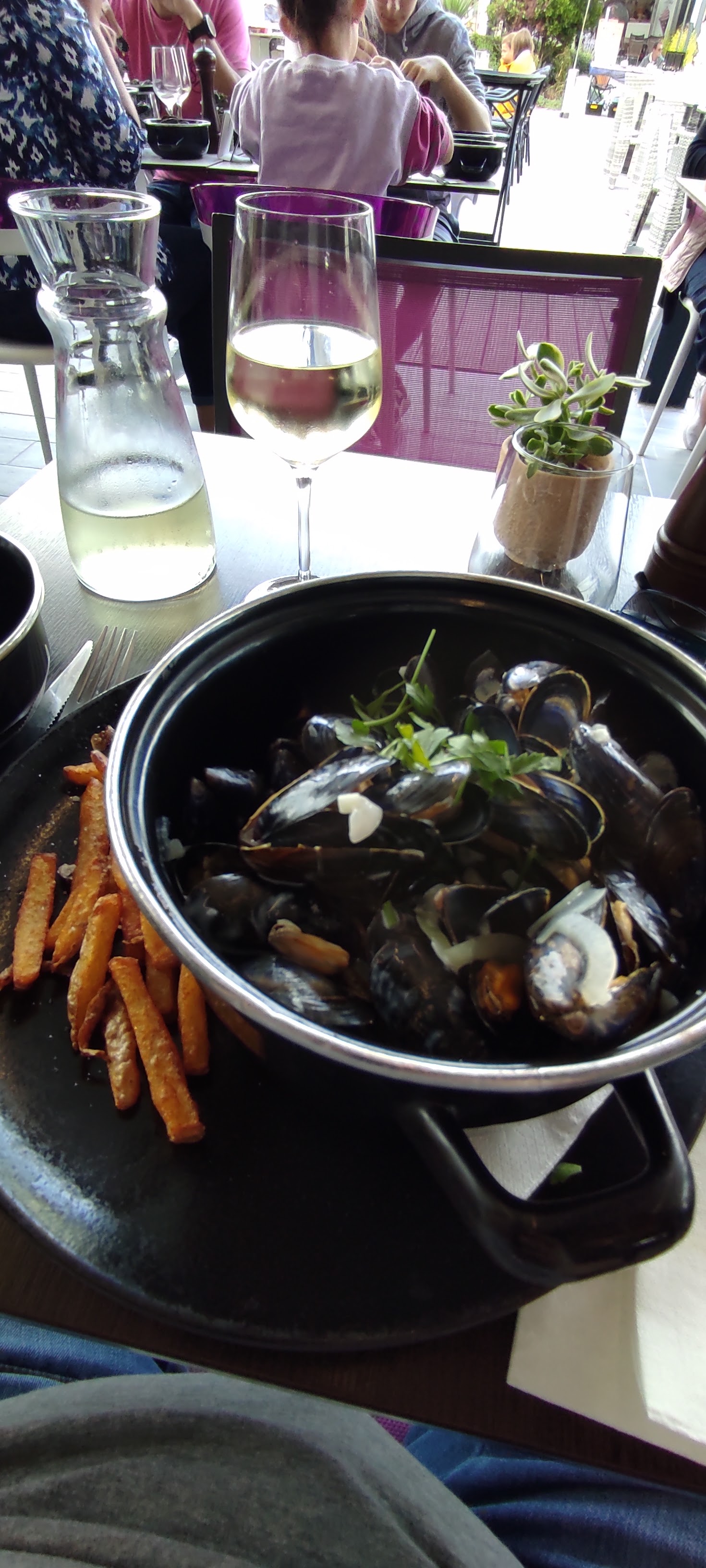 Petites moules, et un peut de frites, équivalent de la petite frites de macdo et le pain il faut le demander, personnel peut aimable, je ne recommande pas cet endroit, je suis sortie de table pas rassasier, on a pris le dessert ailleur, passer votre chemin merci