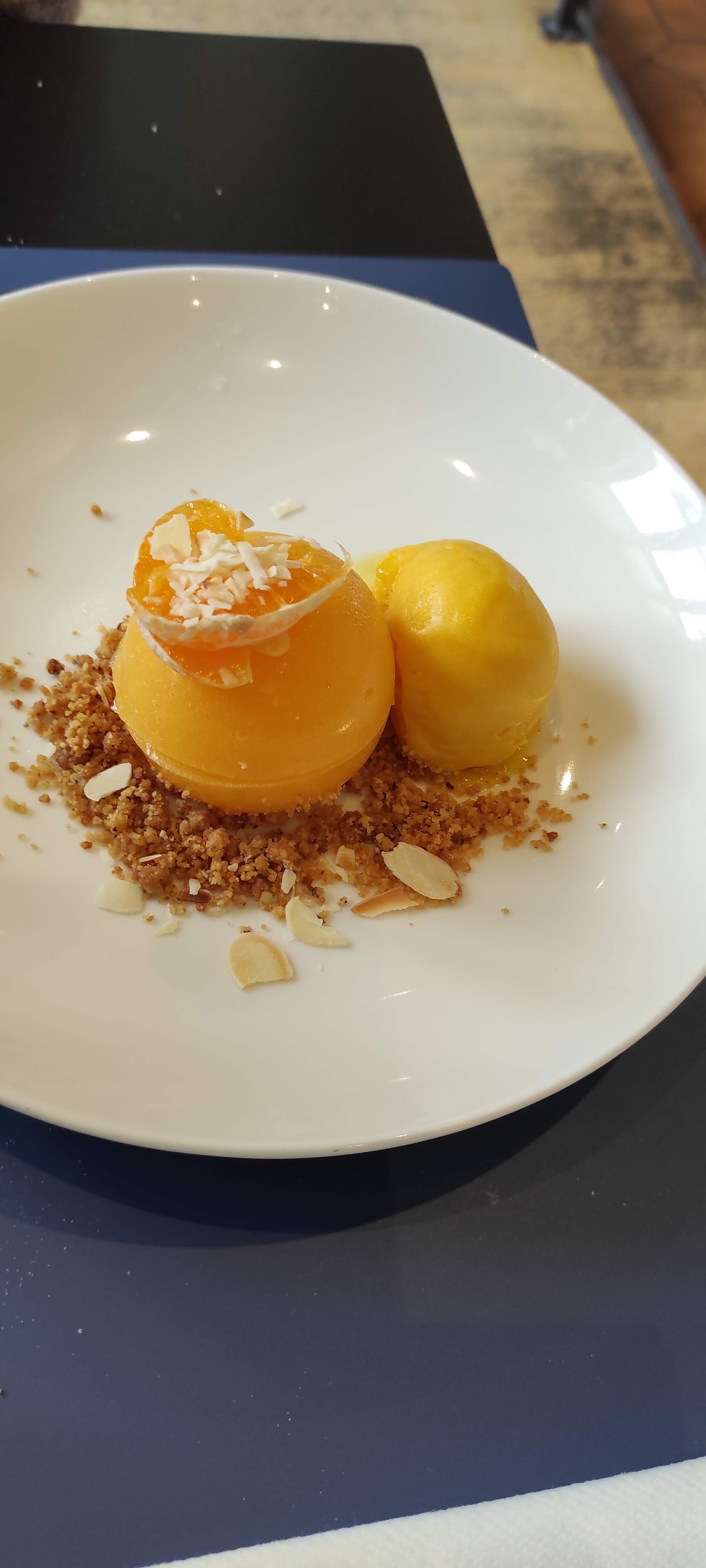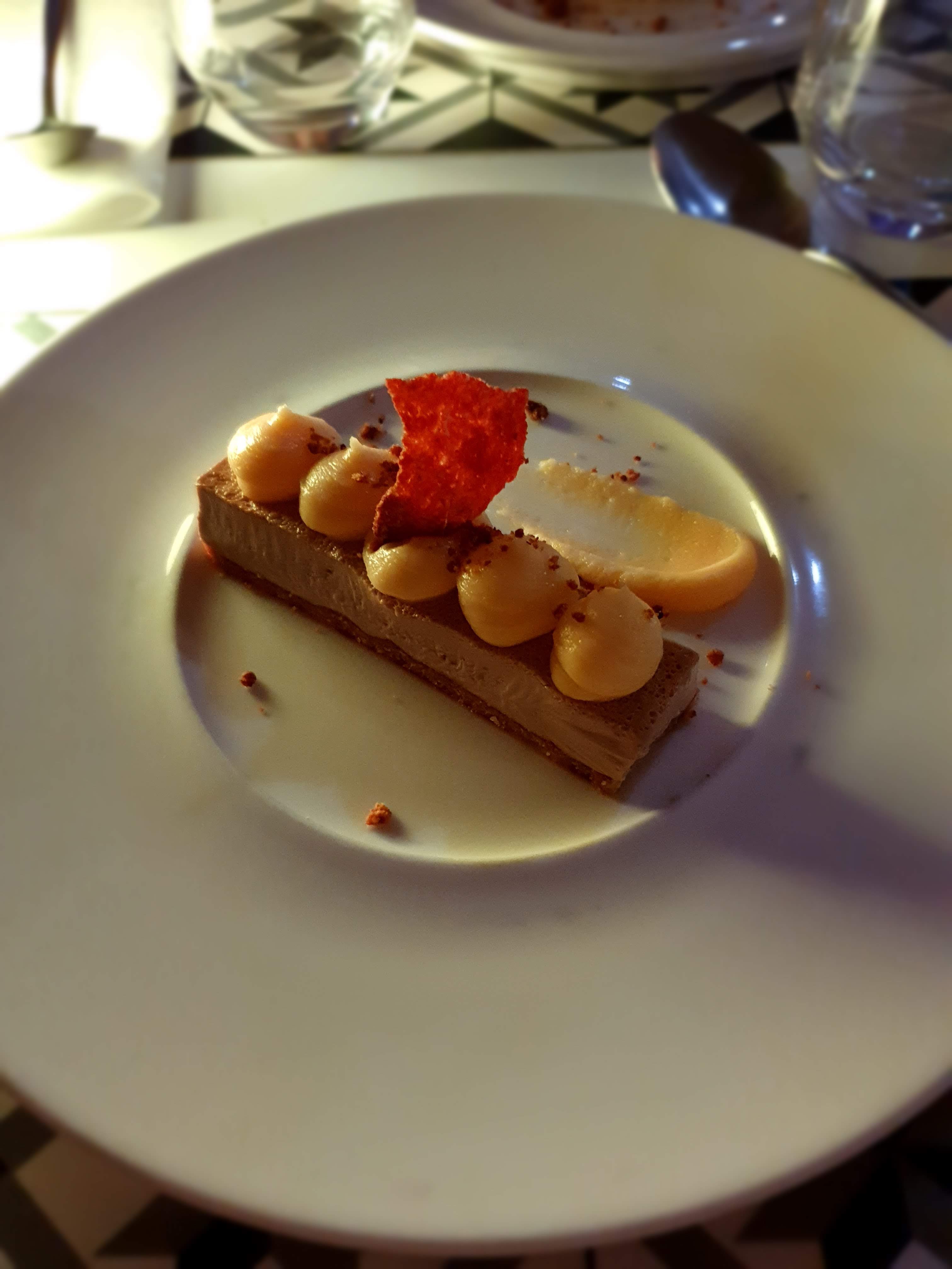 L'assiette ne correspond pas à l'intitulé de la carte Pour l'entrée la crème de basilic était du fromage blanc et il y avait du fenouil et de l'aneth non annoncé au menu. Dans mon plat des pois chiches en surprise. Quand au dessert la sphère au chocolat était au caramel. Nous n'avons pas pris le menu à l'aveugle mais c'était tout comme.