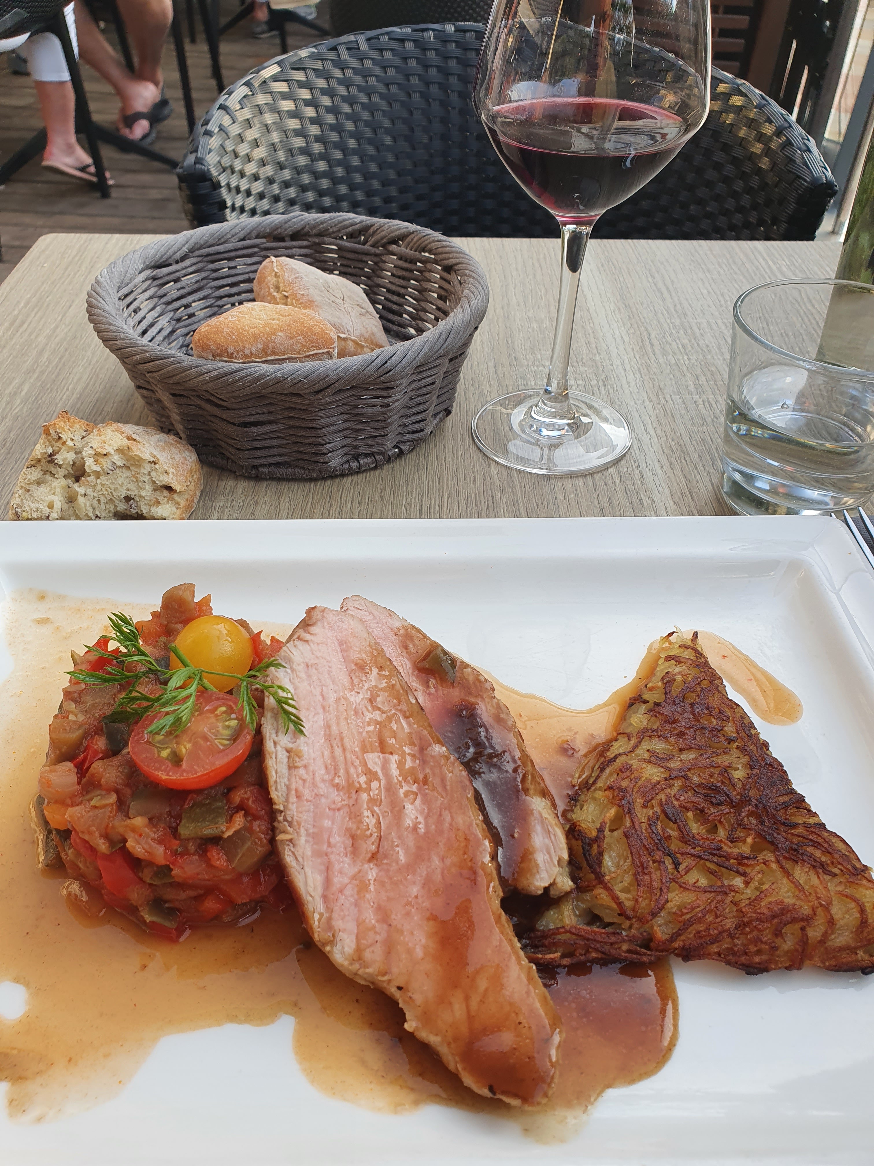 Sur une petite place sympathique ou nous avons eu droit a un concert. Le restaurant propose des plats très savoureux. Nous nous sommes régalés avec le thon minute et la lotte. Les serveurs sont très serviables et souriants. Un très bon accueil et un très bon moment. Nous recommandons.