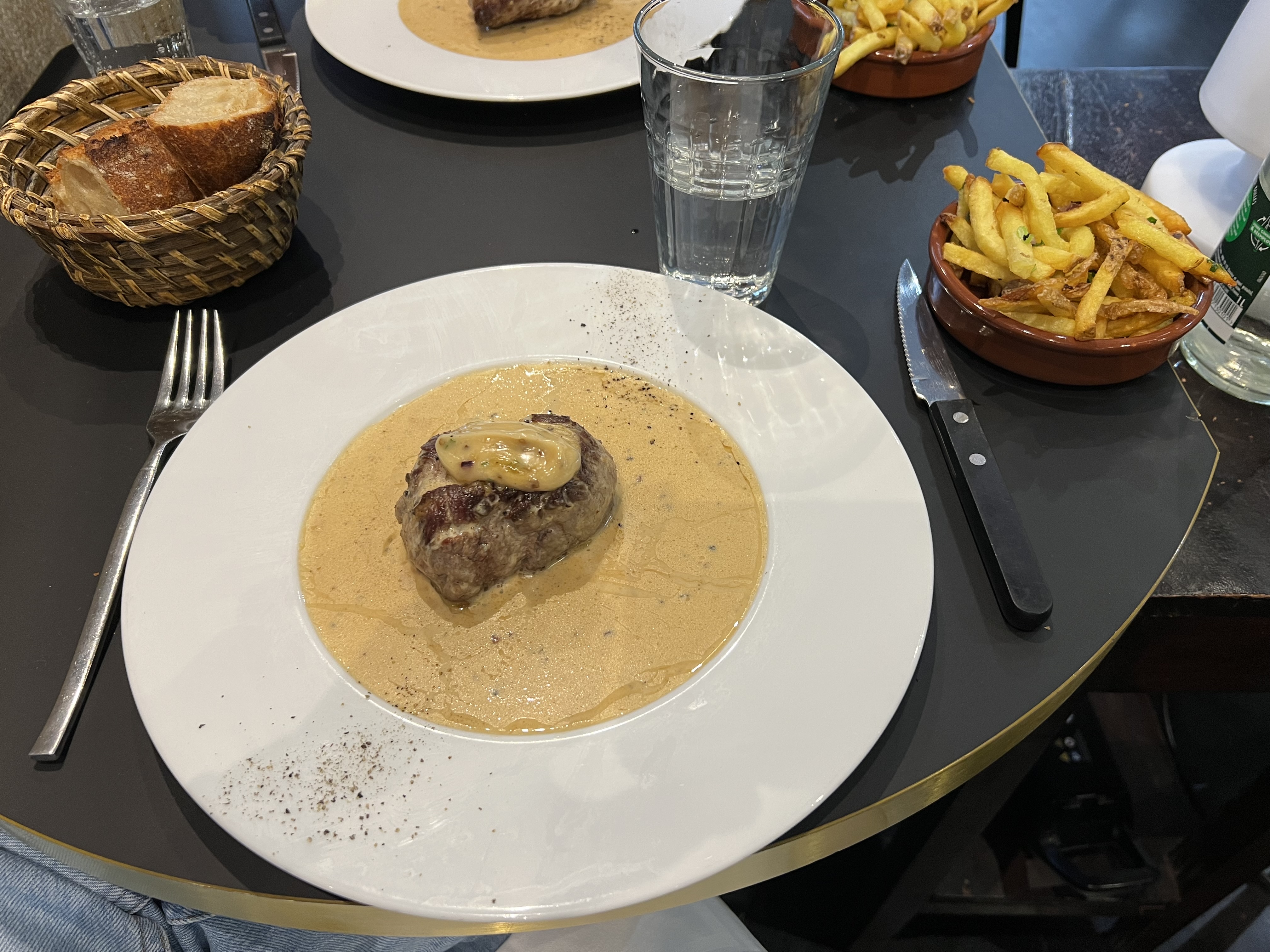 Ouah! Juste wow! J'ai pris le temps d'écrire cette critique pour laisser mes pensées mijoter un peu. Il y a peu de choses auxquelles j'aspire et encore moins dont je rêve après des vacances, mais cet endroit entre dans ces deux catégories. Ma femme et moi avons fait une simple recherche de restaurants à Paris sur Google après avoir visité la Galleria Lafayette et ce petit restaurant merveilleusement pittoresque avec une ambiance des années 40 est apparu. Ce fut une véritable chute pour nous deux. Nous avons commandé Escargot pour commencer, un steak avec une sauce aux truffes et une truffe au chocolat pour le dessert. Mon Dieu, j'aimerais pouvoir avoir un steak comme celui-là aux États-Unis. C'était TELLEMENT bien que nous sommes revenus une seconde fois après être allés au Printemps quatre jours plus tard. C'était la quintessence de ce que j'appellerais aujourd'hui la cuisine française. Le service est incomparable et même s'ils ne parlent pas beaucoup anglais, ils vous traiteront comme un invité d'honneur. Lorsque vous êtes dans le quartier de la Galleria Lafayette/Printemps, je vous recommande vivement de vous y arrêter pour vivre une expérience véritablement française.