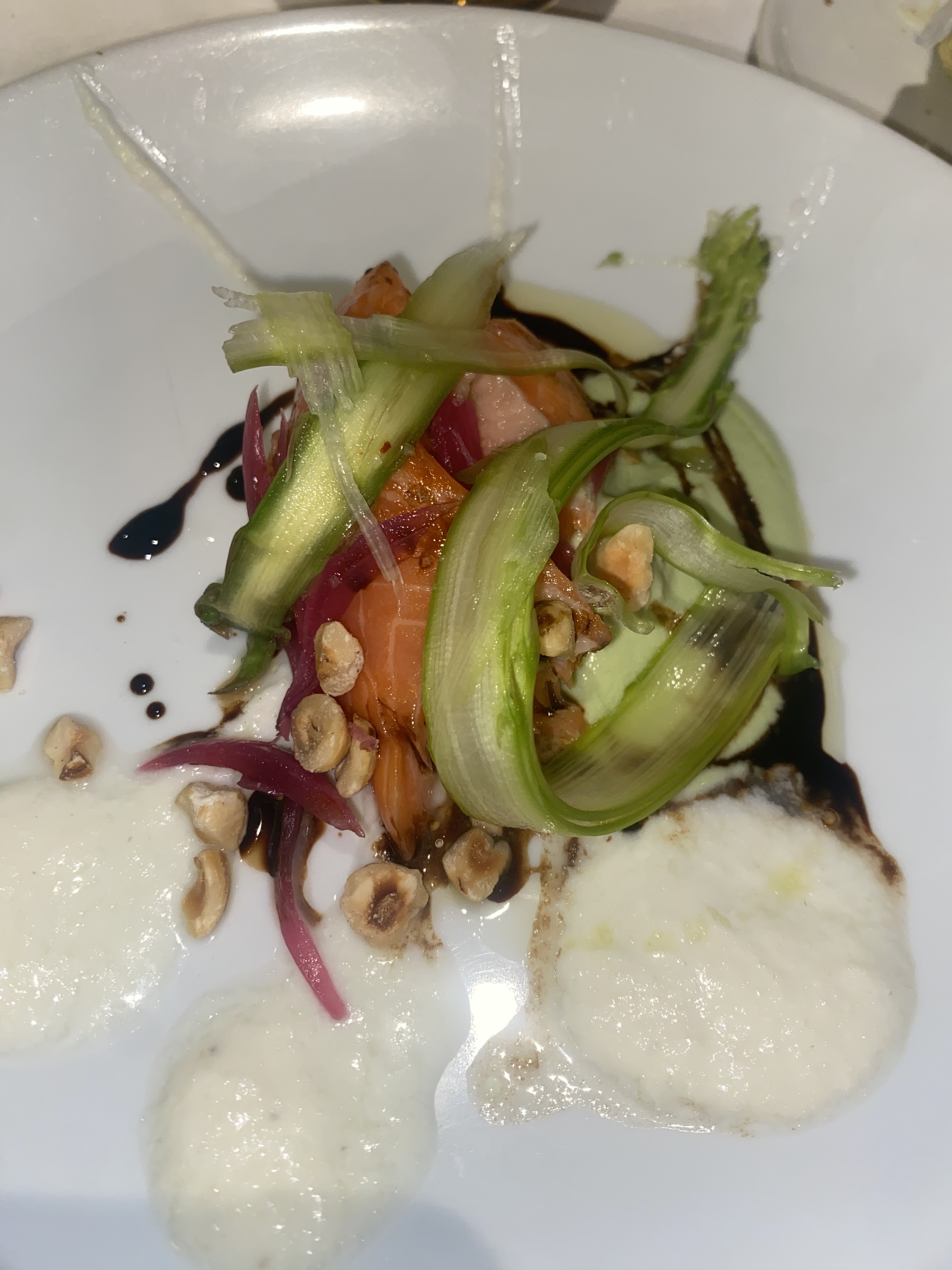 En couple, j'ai regretté l'absence du saumon gravelax. Au niveau du menu pour le foie gras la brioche manquait de moelleux, le shutney un peu trop sucré, le foie gras un peu fade. Le plat du lieu jaune cuisson parfaite l'accompagnement original purée de petit pois agrémenter de fèves peut-être d'épinard c'était inhabituel pour moi mais il y avait un ingrédients qui gâchais le tout à mon goût personnel. Le riz de veau de mon mari était excellent même si ce n'est pas un plat que j'apprécie à sa juste valeur mais je goûte toujours. En dessert une pavlova de fruit exotique bonne mais léger déséquilibre entre meringue et se panaché de fruits exotiques. Le service était très agréable attentionnée parfait. La salle est bien décorée, elle n était pas pleine, et malgré 2 grandes tablées autour de nous, nous n'étions pas gêné par le bruit. Le menu est toute fois un peu plus chère que certains bon restaurant en ville. Une soirée toutefois très agréable. Cordialement Mme Naud