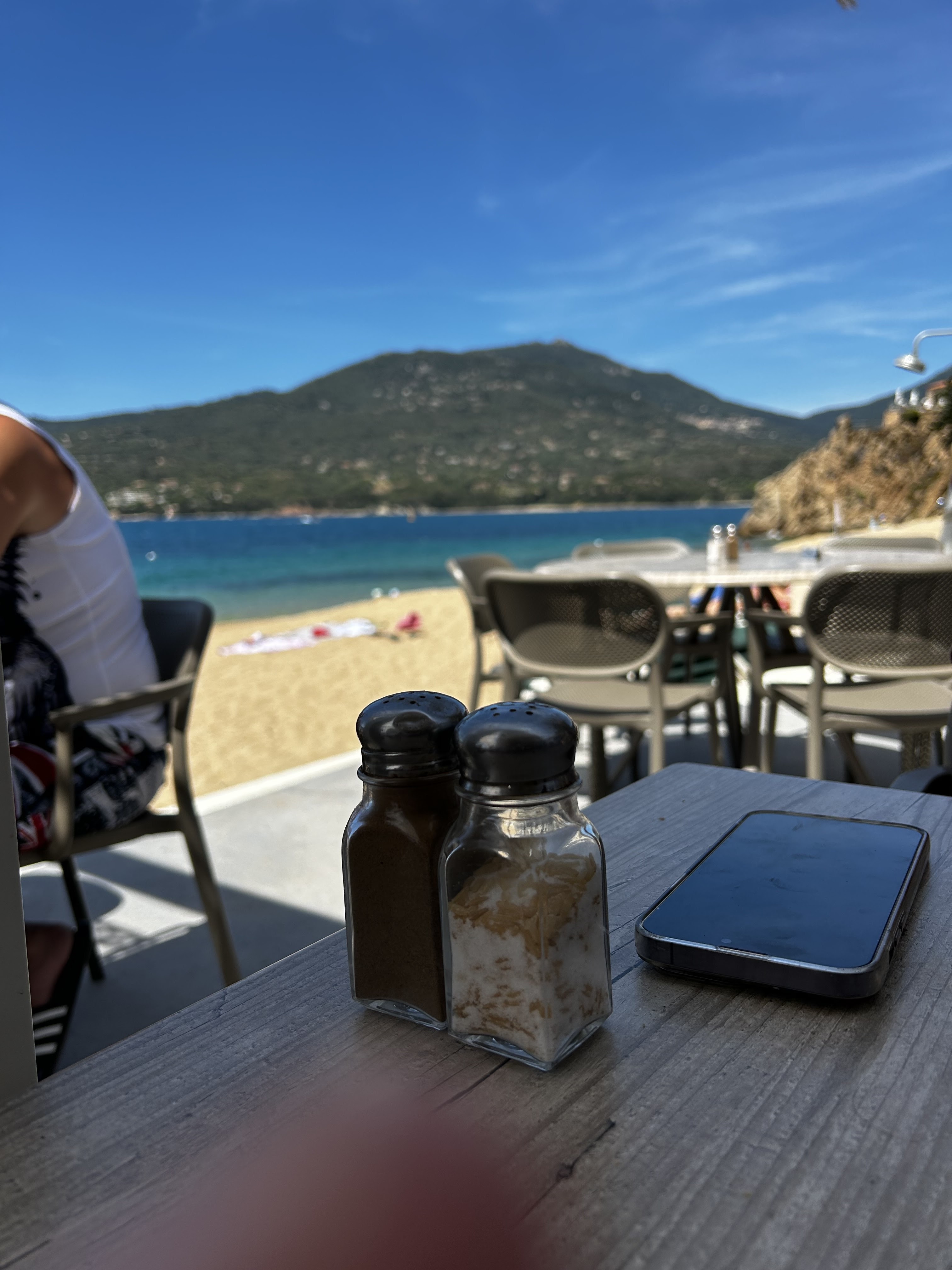 Arrivé tardivement vers 13h30 ,recommandé par Paul ( canonyne Corse), reçu par une serveuse souriante et un patron atypique Corse, nous nous sommes régalés avec les suggestions du jour ( cochon braisé et des cannellonis au brocciu). Rien à dire juste parfait. Vue sur mer magnifique.