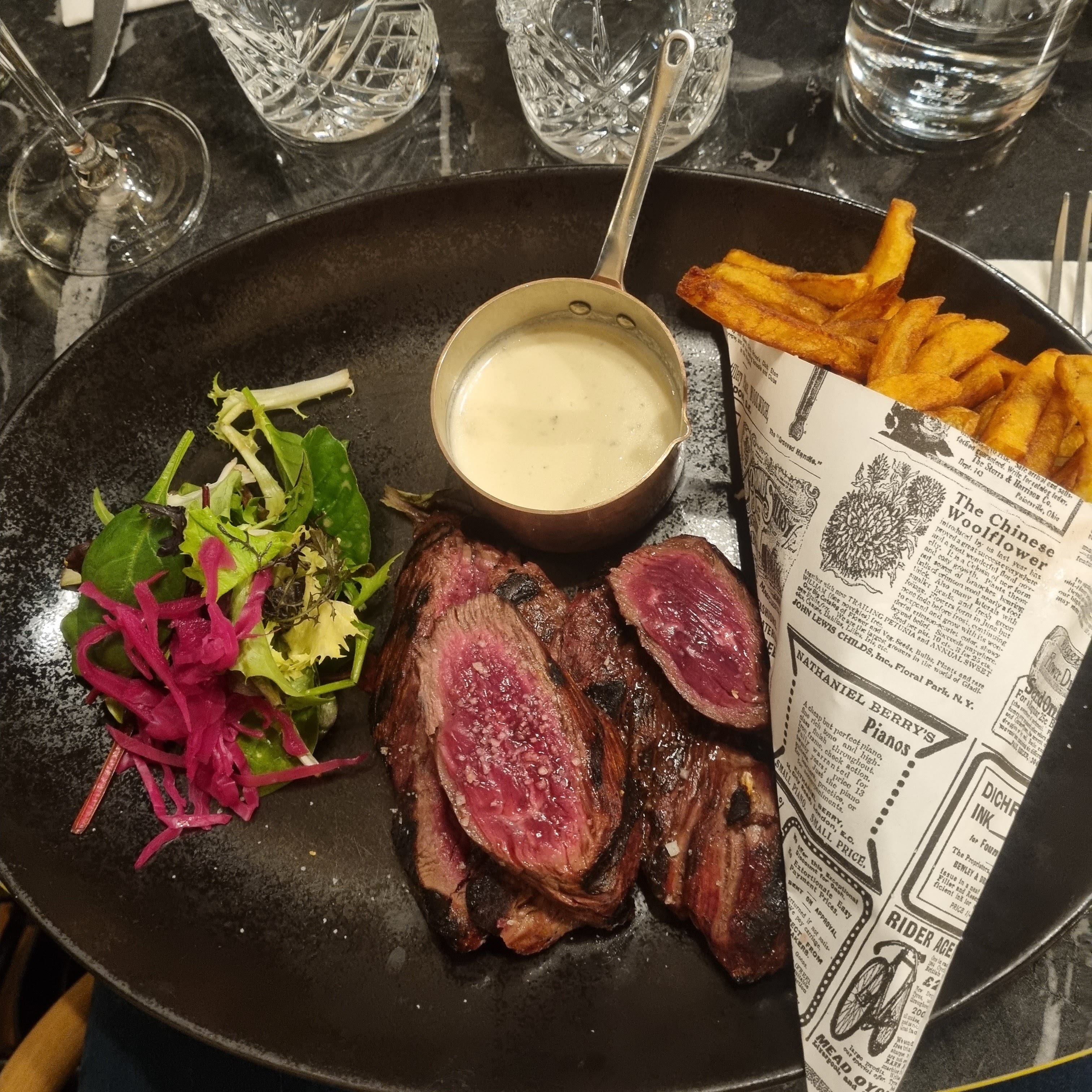 Côté+: Excellent cadre ! L'ambiance est agréable, on s'y sent bien, le personnel est très sympa et les frites un délices sans oublier les viandes. Bonne musique ! Service très rapide comparé à la plupart des restaurants. Côté-: Trop de vis à vis, quelques plantes pour séparer les tables seraient bien venues. L'accompagnement n'est pas suffisant comme les légumes ou les frites dans l'assiette. Ils ne sont malheureusement pas à volonté comme au Buffalo Grill, sinon il faut rajouter +3€. Au prix que coûte le repas je pense qu'un petit effort ne ruinerait pas le restaurant. Je suis sortis de table avec un petit creux. En conclusion : Je recommande ce lieu mais n'allez pas le ventre vide !