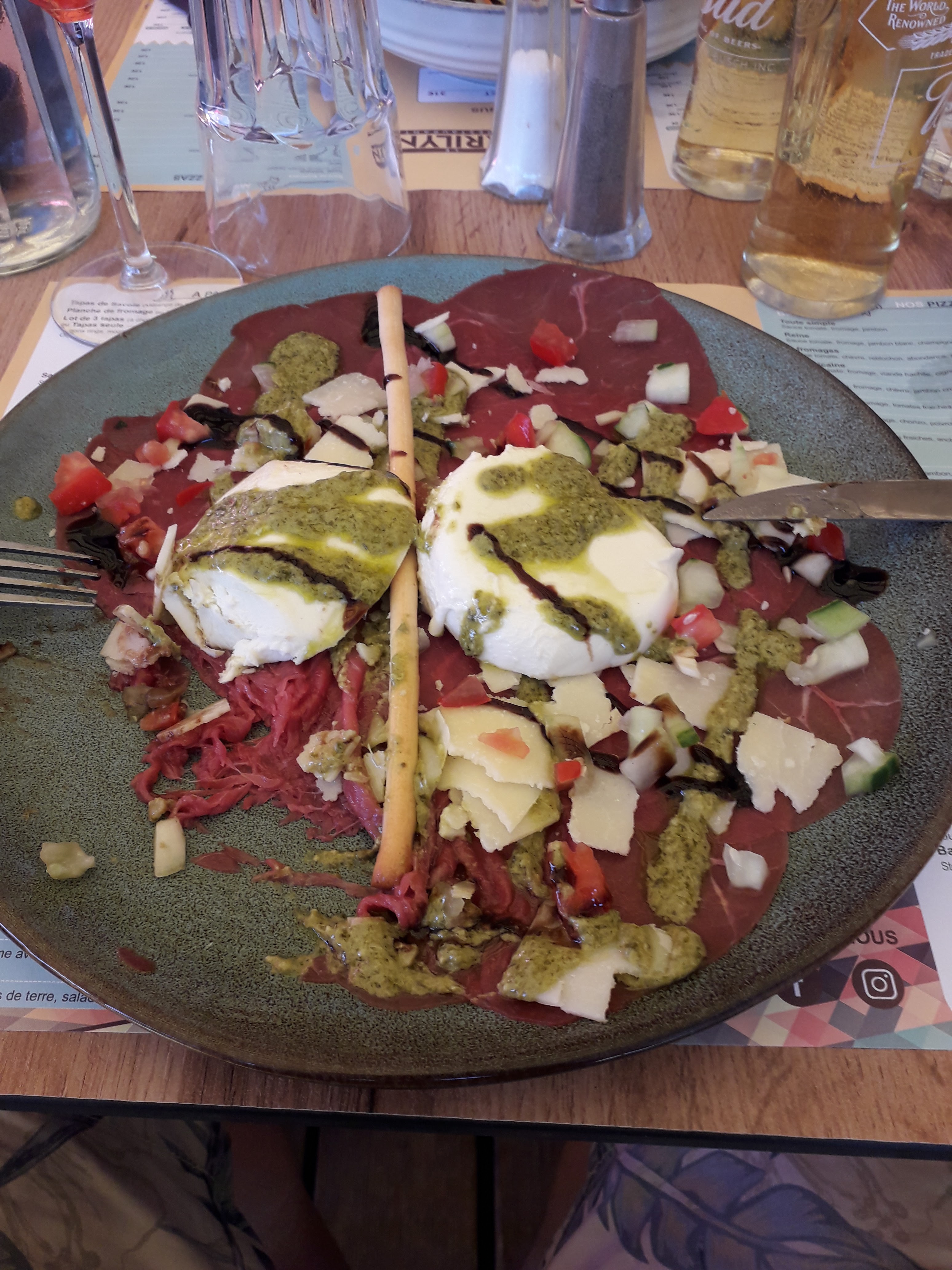 Problème communication avec le service Resto pour campeurs et touristes ... Vous n avez que la terrasse ok mais que de fumeurs impossible de les fuir Menu 3 plats 16.5 ok très bien 1 plat du jour pas 2 ! Pour un menu complet !? Aucune alternative... Choisi burger classique pas grand chose 2 feuilles salade cuite 1 rondelle tomate 1 fromage ridicule et un bon steak haché seul point positif Les frites j ai eu droit le fond du bac cuite recuite et un prix de 15 € ça pique un peu La personne qui dirige estun peu m en foutiste sourire narquois aucun état d ame Des ouvriers m avaient averti pour ce resto et préféraient manger un peu plus loin en ville.. j aurais dû les écouter...