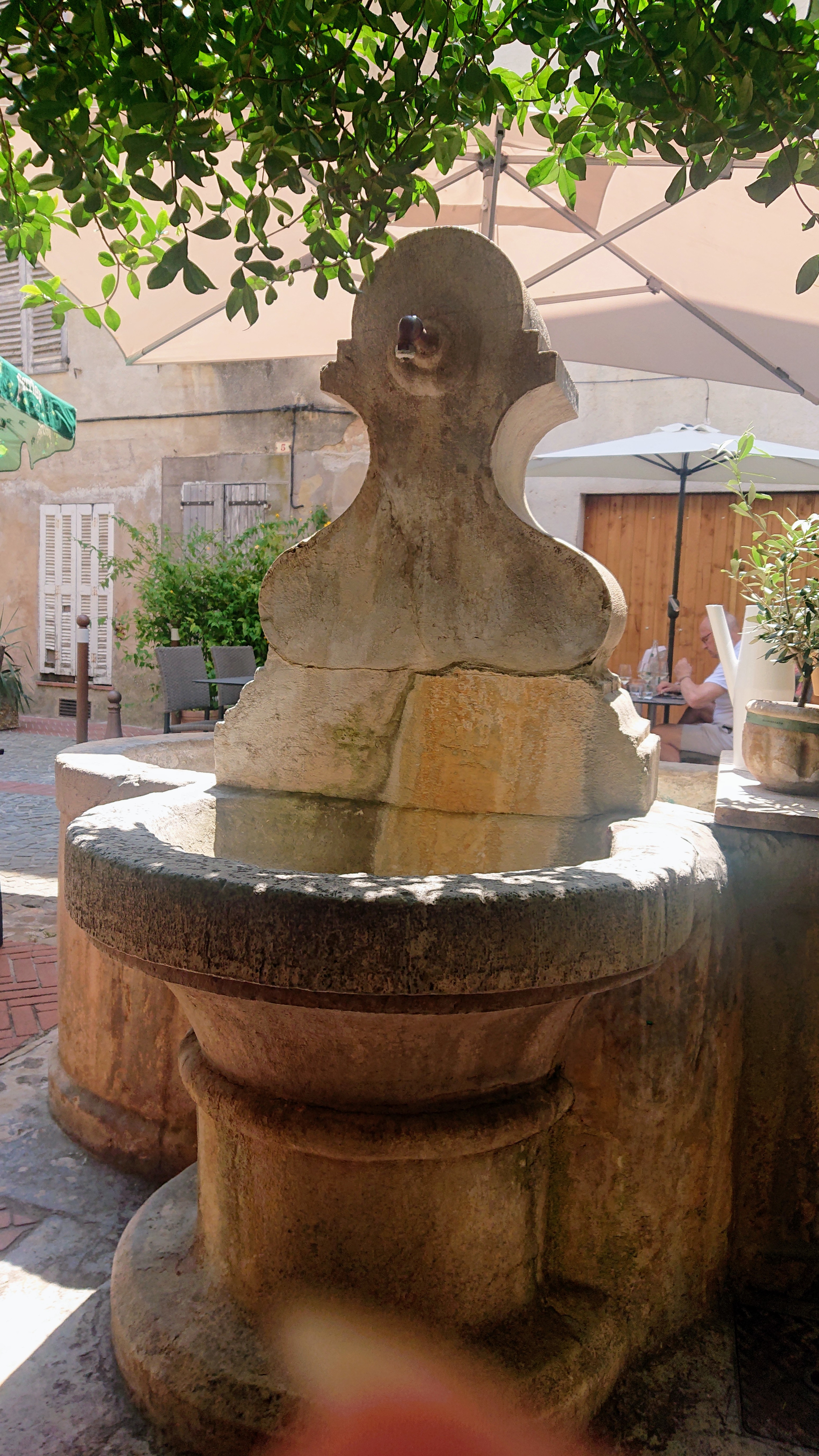 Idéal lorsqu'il faut chaud. Le restaurant est protégé par les hauts murs de la vieille ville et vous serez à l'ombre d'une pergola, près de la fontaine. Menu à 40 € ou 33€ pour un plat et un dessert. Nous avons choisi une tranche de foie de veau et une d'agneau. Délicieux. Service discret et doux. Merci