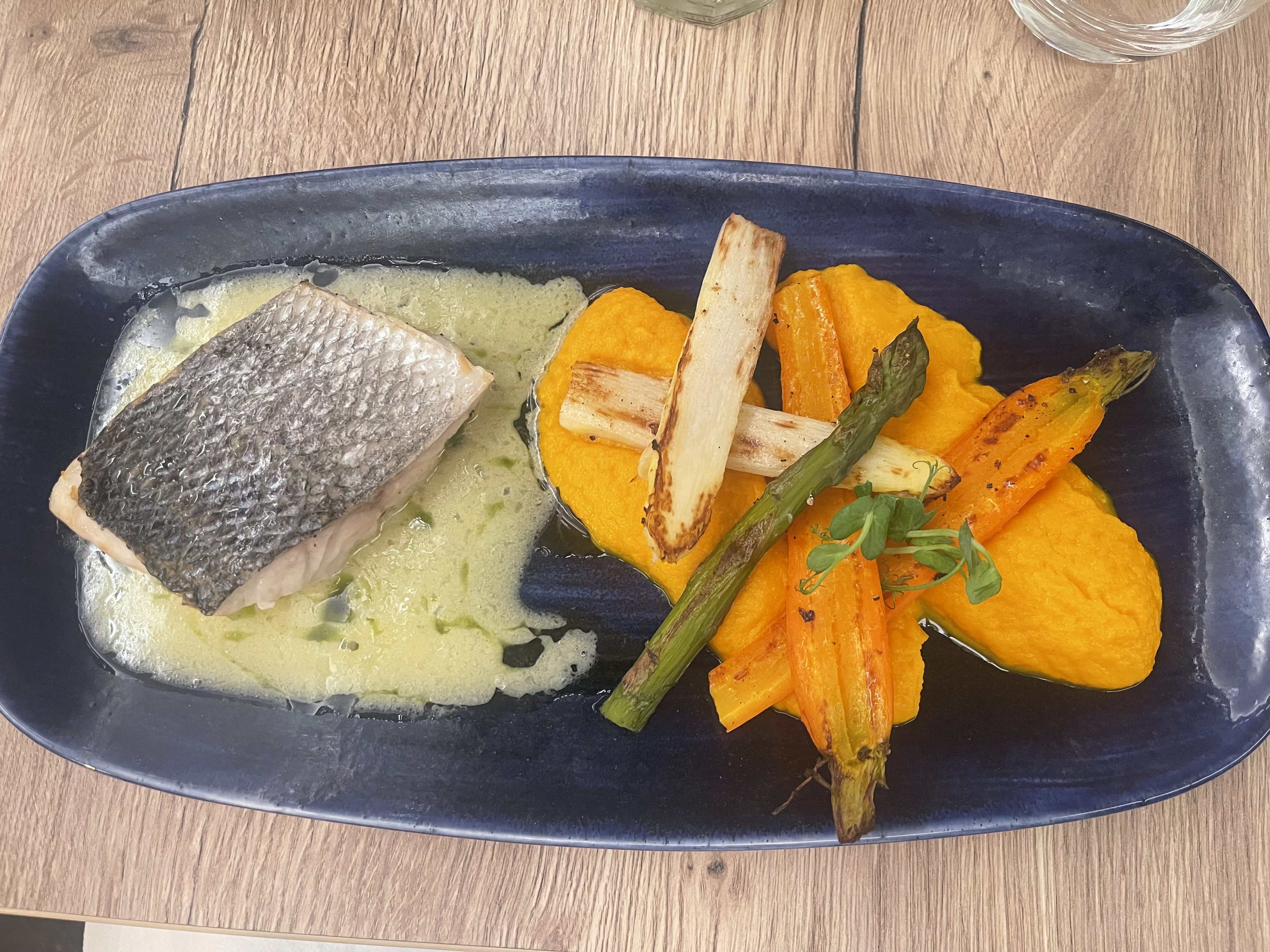 Plat très bien préparé, avec de bon arôme, juste un peu déçu par la quantité, notamment le bar ,on aurait bien vu le poisson entier ,ou les deux filets ,juste en relation avec le prix du plat. Très bonne cuisine tout de même ,et très bon accueil et service
