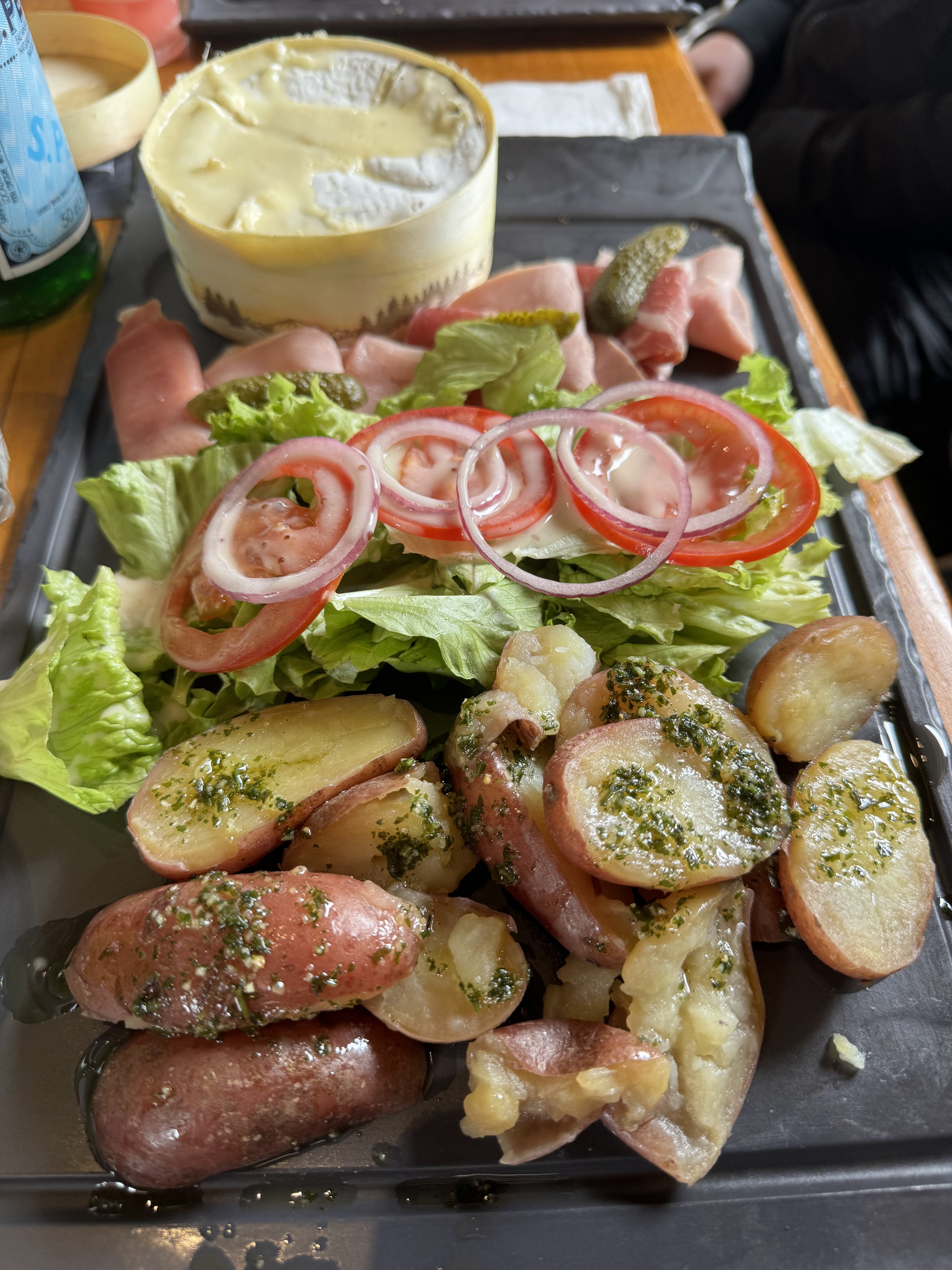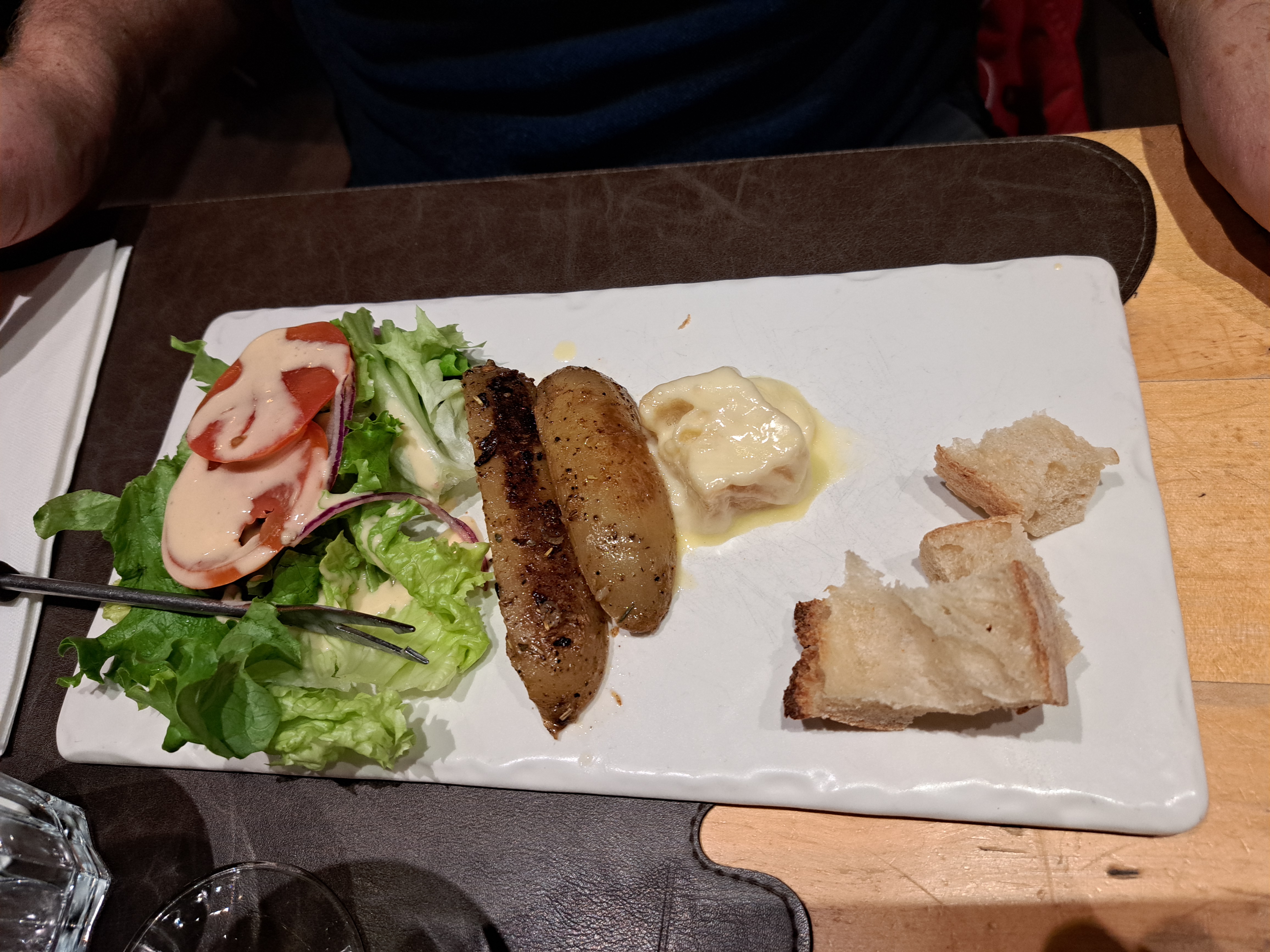 Serveur un peu trop présent et donne un peu trop son avis sur la cuisson des viandes (une personne voulait prendre une viande « bien cuite » mais d’après le serveur ce n’est pas respectueux de prendre une viande « bien cuite » elle doit se manger forcément bleue ou saignante). Et ensuite deuxième problème, une personne prend « un reblochon avec du miel » donc très bien servi, mais lorsque la personne commence a manger le fromage, un bout de céramique (du plat) ce retrouve dans sa bouche. Nous appelons donc le serveur, et il nous demande si on souhaite garder le plat ainsi (donc avec des bouts de céramique) ou qu’on veut le changer. La réponse est donc évidente mais pas tellement pour lui… Ensuite il revient quelques minutes plus tard pour me demander si la personne voulait changer de plat car je cite « peut être que cela vous a dégoûté donc vous voulez autre chose ». La personne insiste et dit qu’elle veut le plat qu’elle a choisi depuis le début. Pour qu’au final le serveur rectifie et dit « en réalité nous n’avons plus de reblochon ». Cela est donc un manque d’honnêteté et de professionnalisme. Et enfin, la personne a eu le malheur de dire « je vais seulement manger alors que les autres ont fini » quand le serveur arrive. La personne sait donc pris une réflection par le serveur, « il faut quand même que la viande cuise ». Alors qu’en réalité s’il n’y avait pas eu de bout de céramique dans l’assiette depuis le début, alors la personne aurait commencé de manger en même temps que tout le monde. Sinon service rapide et viande de qualité.