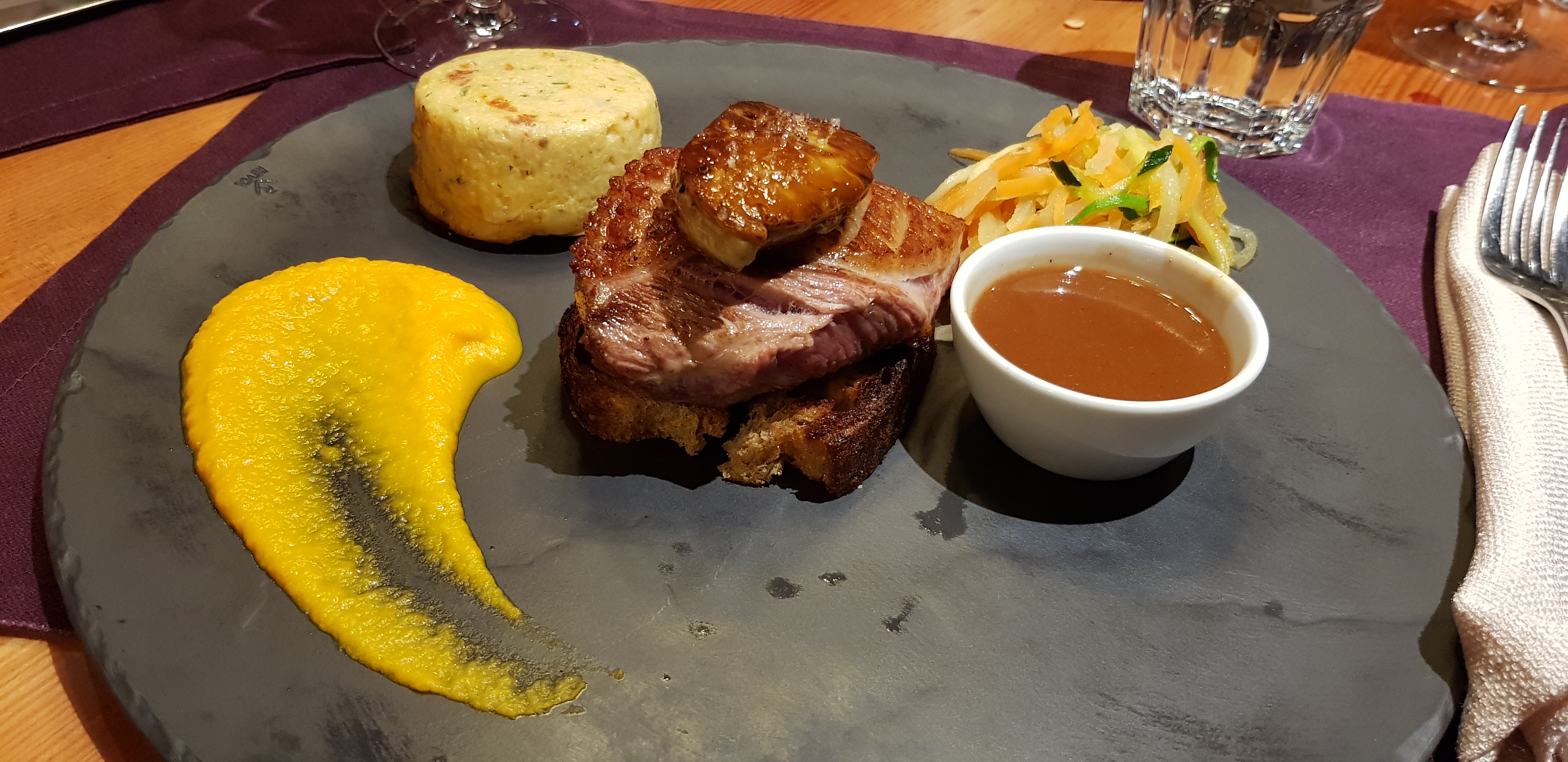 L'expérience a été détruite par le service grossier. Le directeur nous parlait comme s'il nous rendait service en nous servant à manger. Nous avons commandé plusieurs plats et avec chacun d'eux, quelque chose n'allait pas, totalement incompatible avec les ingrédients mentionnés dans le menu. Par exemple, au lieu d'un gratin de pommes de terre, nous avons eu des frites normales. J'ai dû demander plusieurs fois pour recevoir réellement les plats que nous avions commandés. Le directeur s'est comporté comme si c'était normal et de notre faute. Pour être honnête, la nourriture était bonne mais le service a détruit l'ambiance. Je n'y retournerais pas et je recommanderais aux autres de chercher un meilleur endroit.