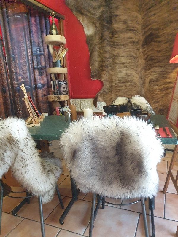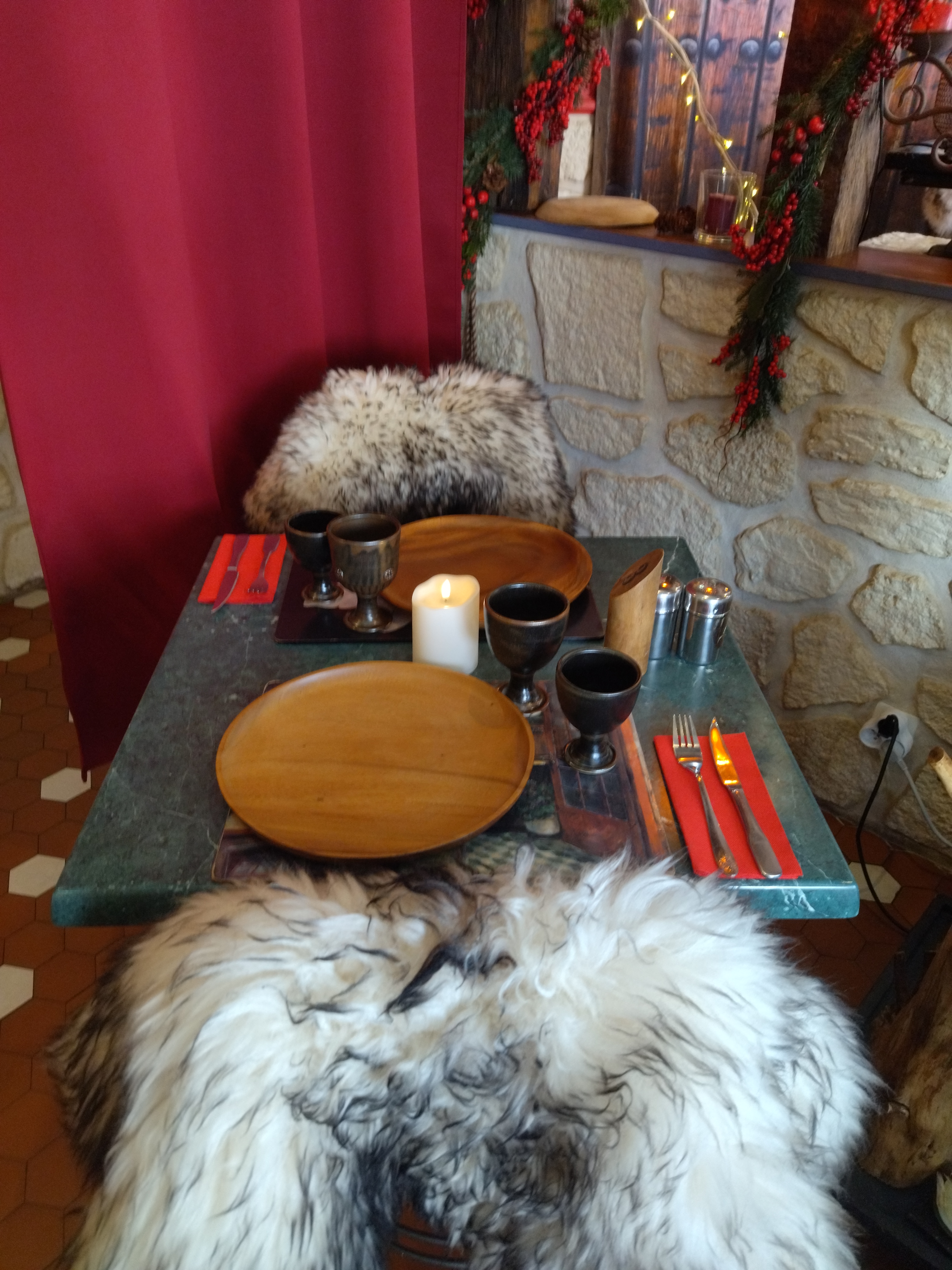 Petit restaurant à la décoration originale (une peau de bête accrochée au mur et quelques oriflammes en font un endroit médiéval Dès le début du repas, les assiettes en bois sont enlevées et ensuite vous mangez dans des assiettes normales donc rien d'extraordinaire ! Les plats ont un goût insipide. La température de la salle de restaurant est froide et n'incite pas à rester à table après le café, bien que nous étions entre amis, l'endroit n'est pas très chaleureux.
