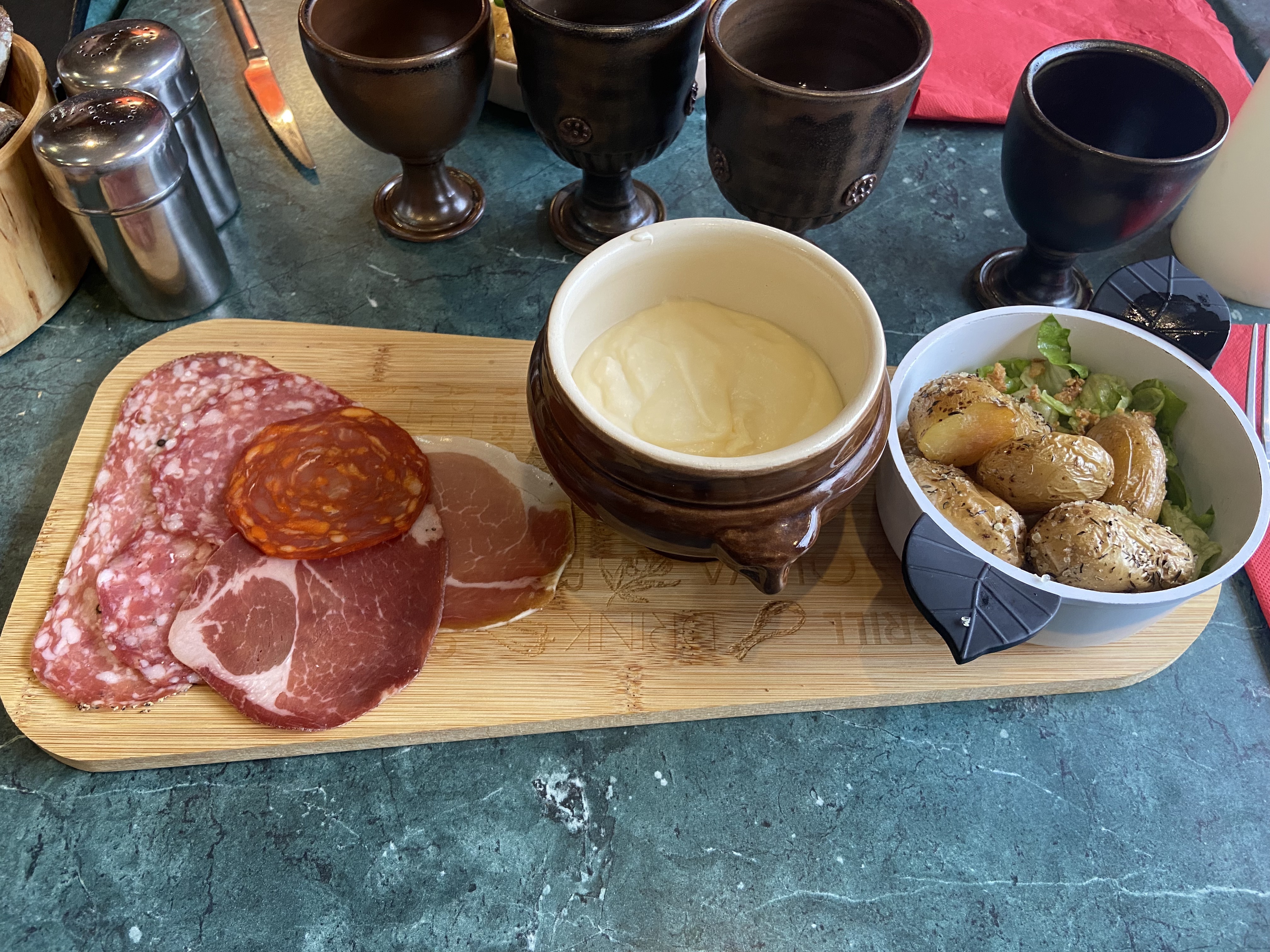 Accueil chaleureux et agréable Déco sortant de l'ordinaire Restaurant calme Repas copieux Partager a deux une fondue savoyarde qui nous a bien rempli l'estomac