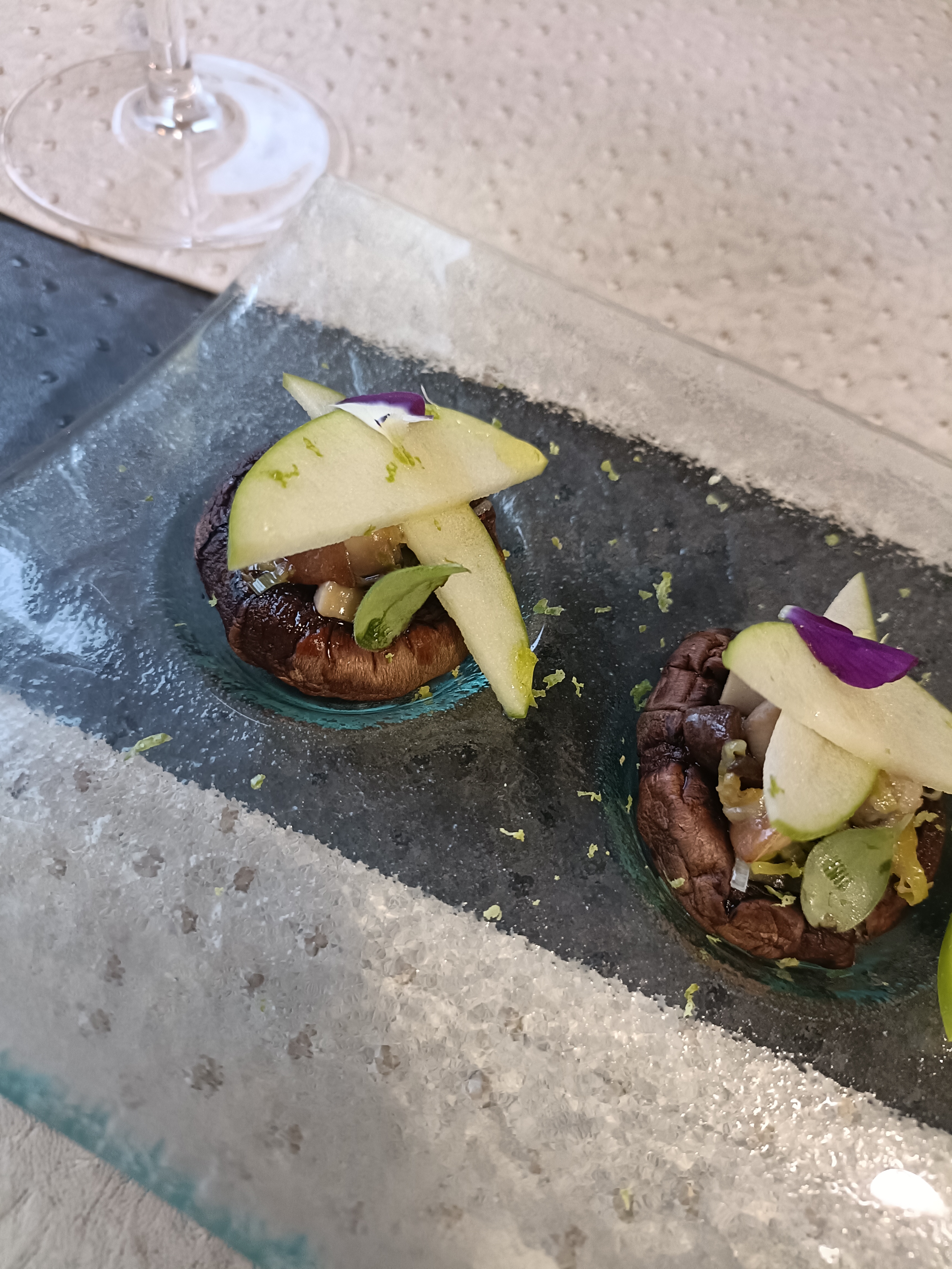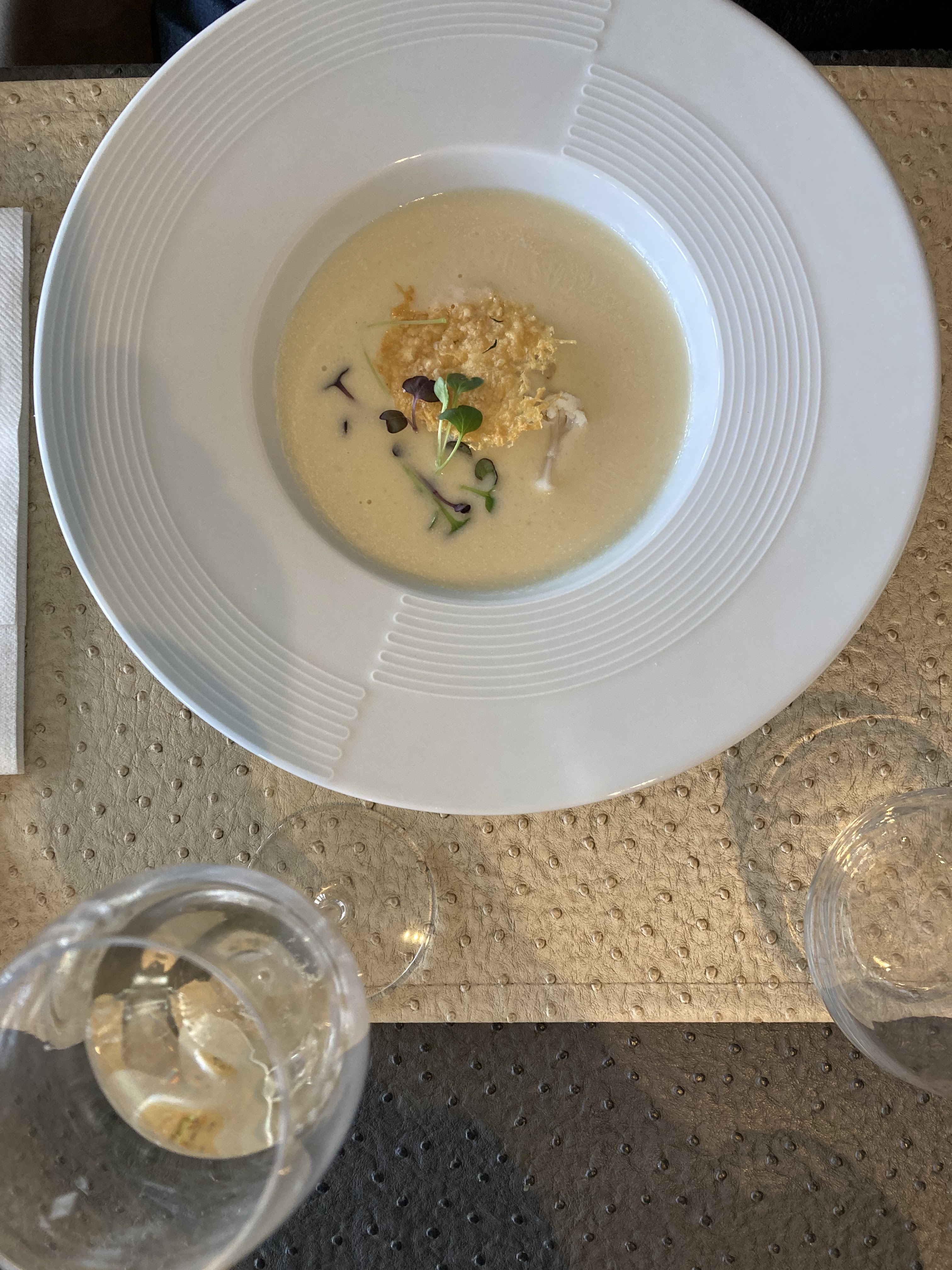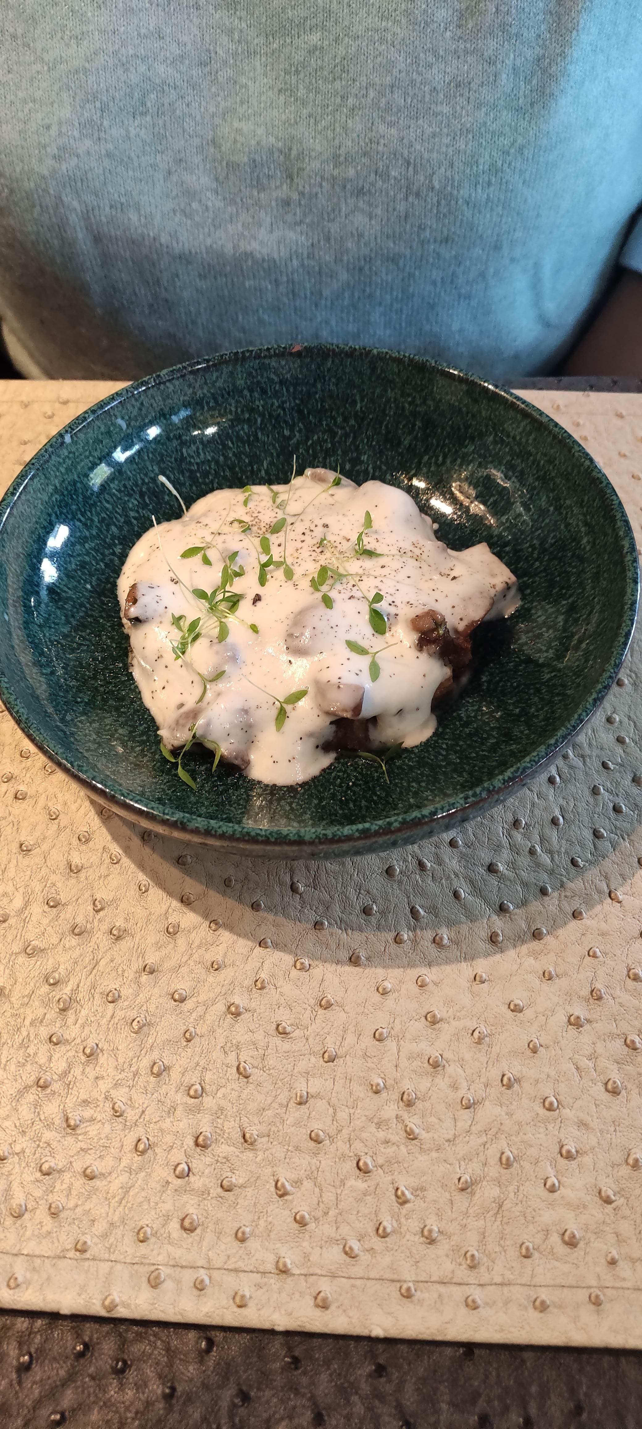 Beaucoup de fromages, de crème, de sel... L'exécution des recettes est très intéressante, la quantité servie adaptée, mais le tout manque de finesse en bouche. J'ai peu apprécié les nappes et sets de table en sky, la serveuse en claquettes, le froid...