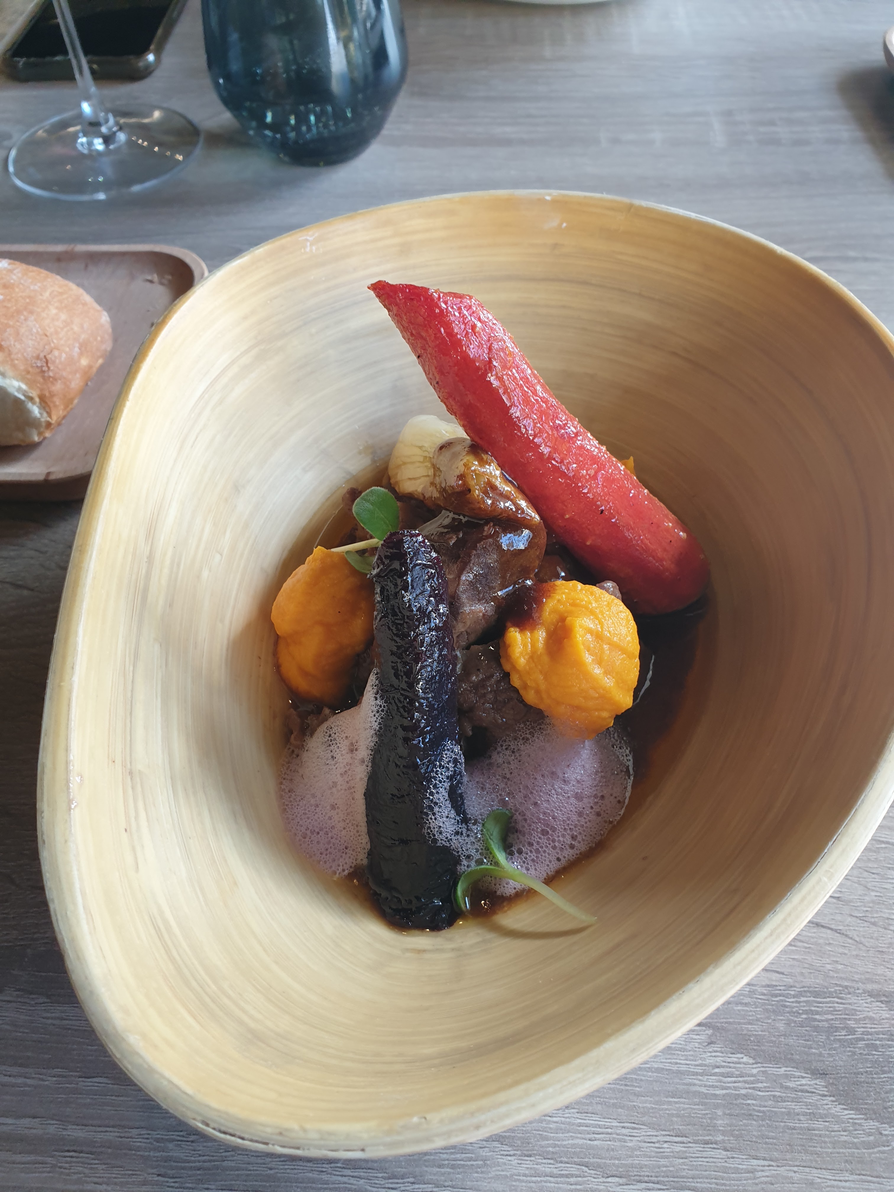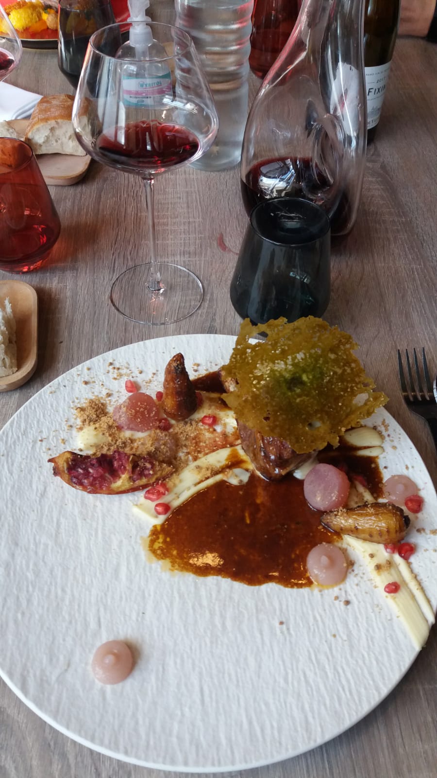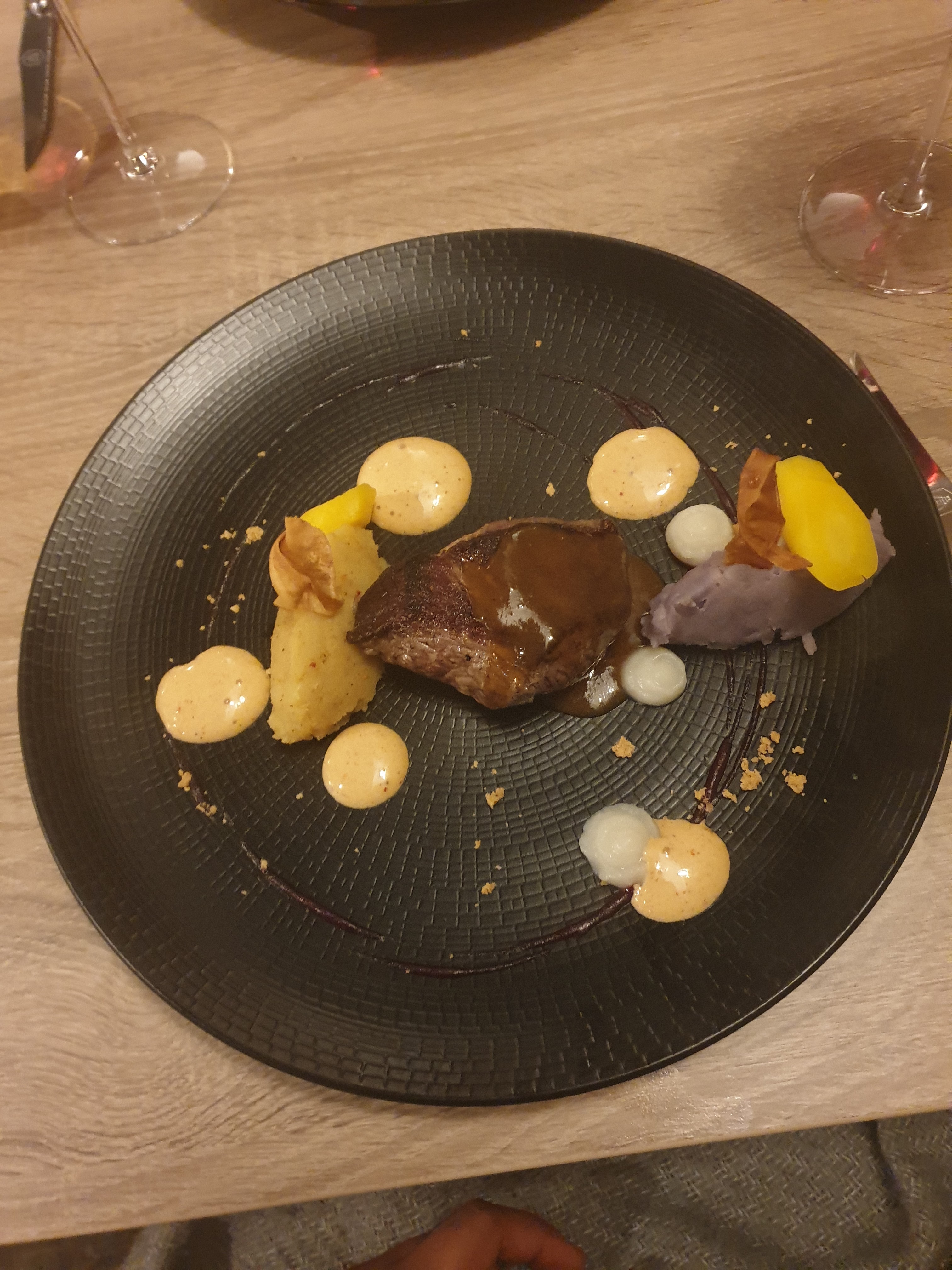 Une merveilleuse découverte !! Dès l 'entrée, on est éblouis!! Il y a un sol en verre,on découvre la cave à vins dessous, inédit! La déco du restau est superbe, il y a une vraie recherche entre les tons, les couleurs, les matières. C'est magnifique. Même les toilettes sont décorées avec goût. Passons à la nourriture, l'amuse bouche à base de graines de chia vous met les papilles en émoi . Nous avons choisi le veau et le boeuf. Les viandes sont succulentes, les accompagnements très bons. Le tout est tout simplement exquis. Les vins excellents. Les desserts ( chocolat à 85%, je craignais qu'il ne soit amer, loin de là),tout simplement magiques. Un grand bravo au chef cuistot, c'est une perle! Merci à l'équipe très pro, tout le monde est souriant et aux petits soins. Vraiment ravie d'avoir découvert cet endroit qui vaut réellement le détour. Rapport qualité prix vraiment raisonnable. À très bientôt