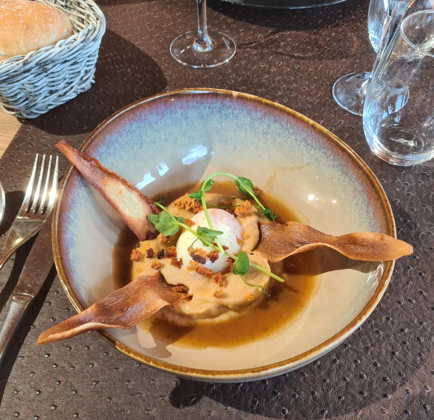 Soirée a peu agréable... malheureusement formation d un apprenti tout au long du repas installant un certain malaise. Bienveillance du serveur malgrès un oublie d eau petillante . Concernant la cuisine ; ayant visité plusieurs restaurant dit gastronomique je n ai pas été convaincu pour le rapport qualité/prix.
