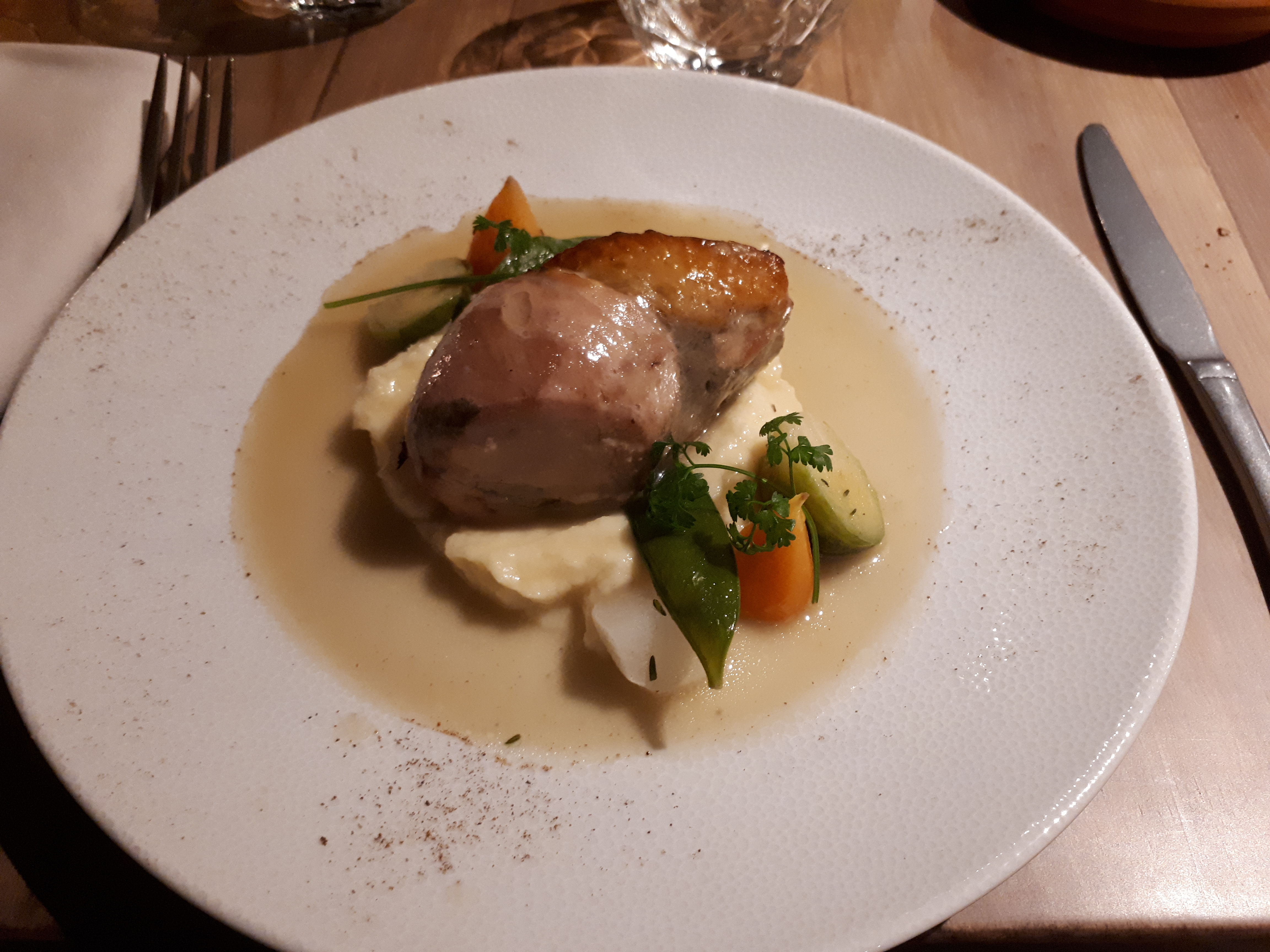 Je rentre presque par hasard dans ce restaurant ouvert le lundi. Entrée et plat du jour. Jarret confit avec purée, et très fine feuille de choux farcie...avec notamment de petits raisins secs. Un régal. Des parfums et des goûts rares. J'y retourne avec mon épouse, qui était chez...sa mère ce jour là!!! Ne l'ratez pas!