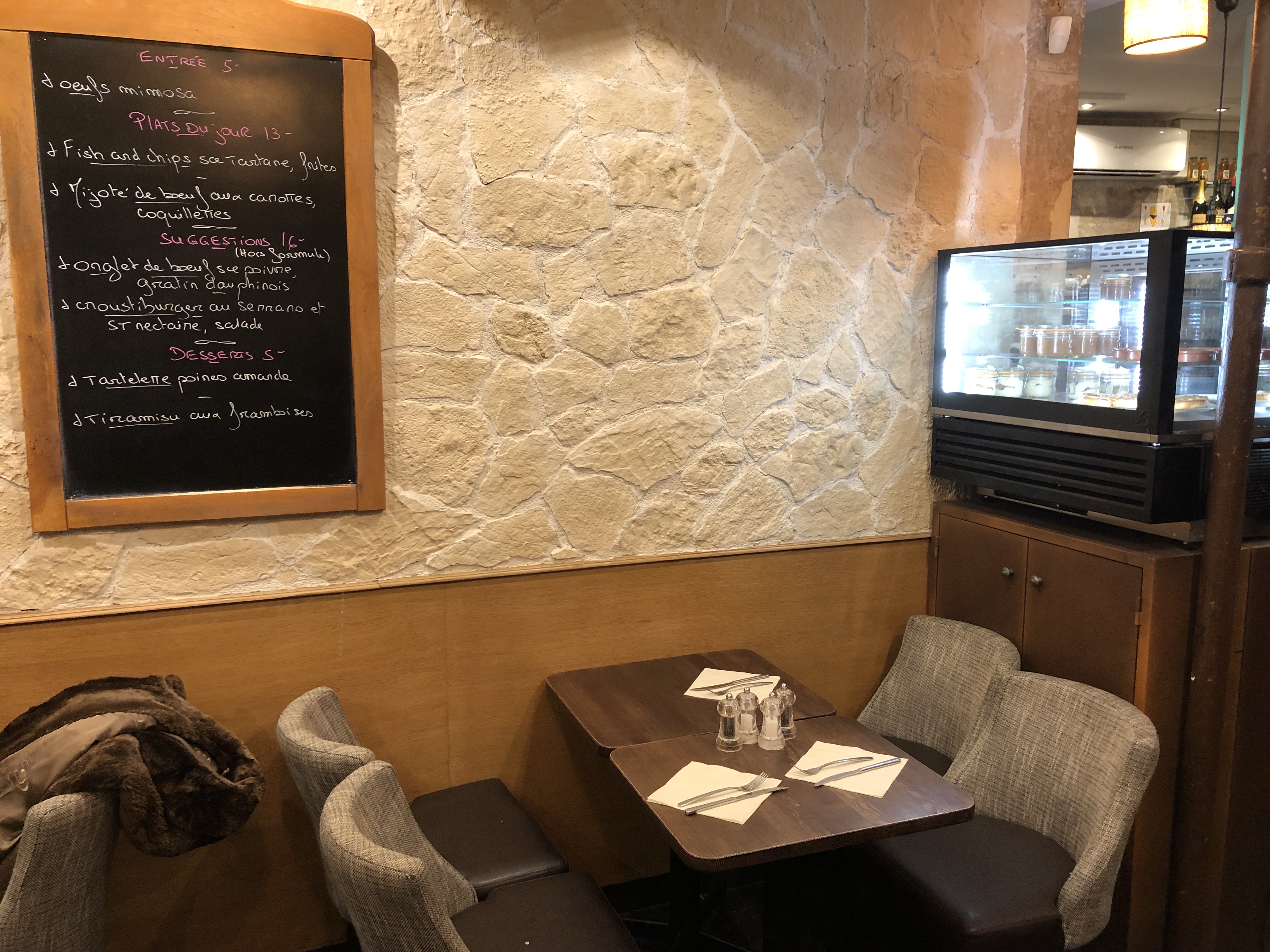 A lire jusqu’au bout: bonne cuisine, bon rapport qualité /prix pour le centre de Paris. Serveurs aimables (avec un humour un peu particulier). Notre surprise était après avoir payé. Le monsieur derrière le bar (la cinquantaine) fait tomber (côte porte des toilettes) un morceau de pain du panier. On s’attendait à ce qu’il le jette mais non! Il est anti-gaspillage: le ramasse et le remet et bien sûr n’oublie pas de bien souffler dessus pour enlever toute éventuelle poussière qui a pu le toucher. Alors petite remarque: on peut manger cru ou pas bon mais jamais après vu ça! Nous sommes prêts à enlever ce commentaire à condition de nous donner une explication convaincante (a la hauteur de notre intelligence) ou simplement de reconnaître….