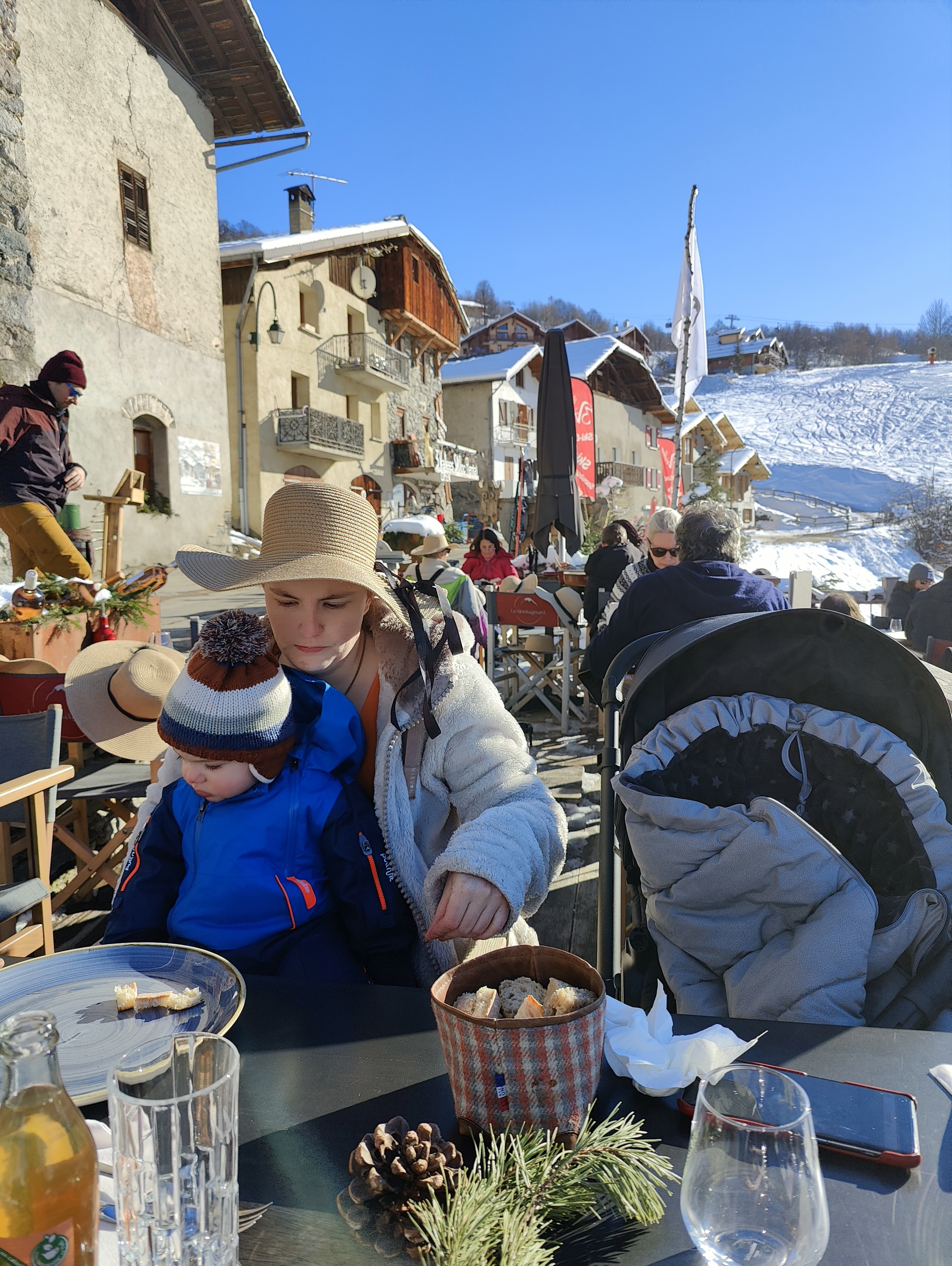 Belle terrasse ensoleillée à l'heure du déjeuner. Chapeaux de soleil et couvertures pour le rendre encore plus agréable. Pas de chaise haute pour notre bébé de 14 mois et nous y sommes effectivement habitués en France. D'abord quelques points critiques : l'eau et la salade verte ont été oubliées. La nourriture est positive : beaucoup de goût et joliment présentée. Nous avons eu un filet de pull en entrée et une fondue au fromage avec charcuterie en plat principal. Nous y dînerons en grand groupe samedi soir et nous sommes pleins d'attentes pour goûter encore plus.