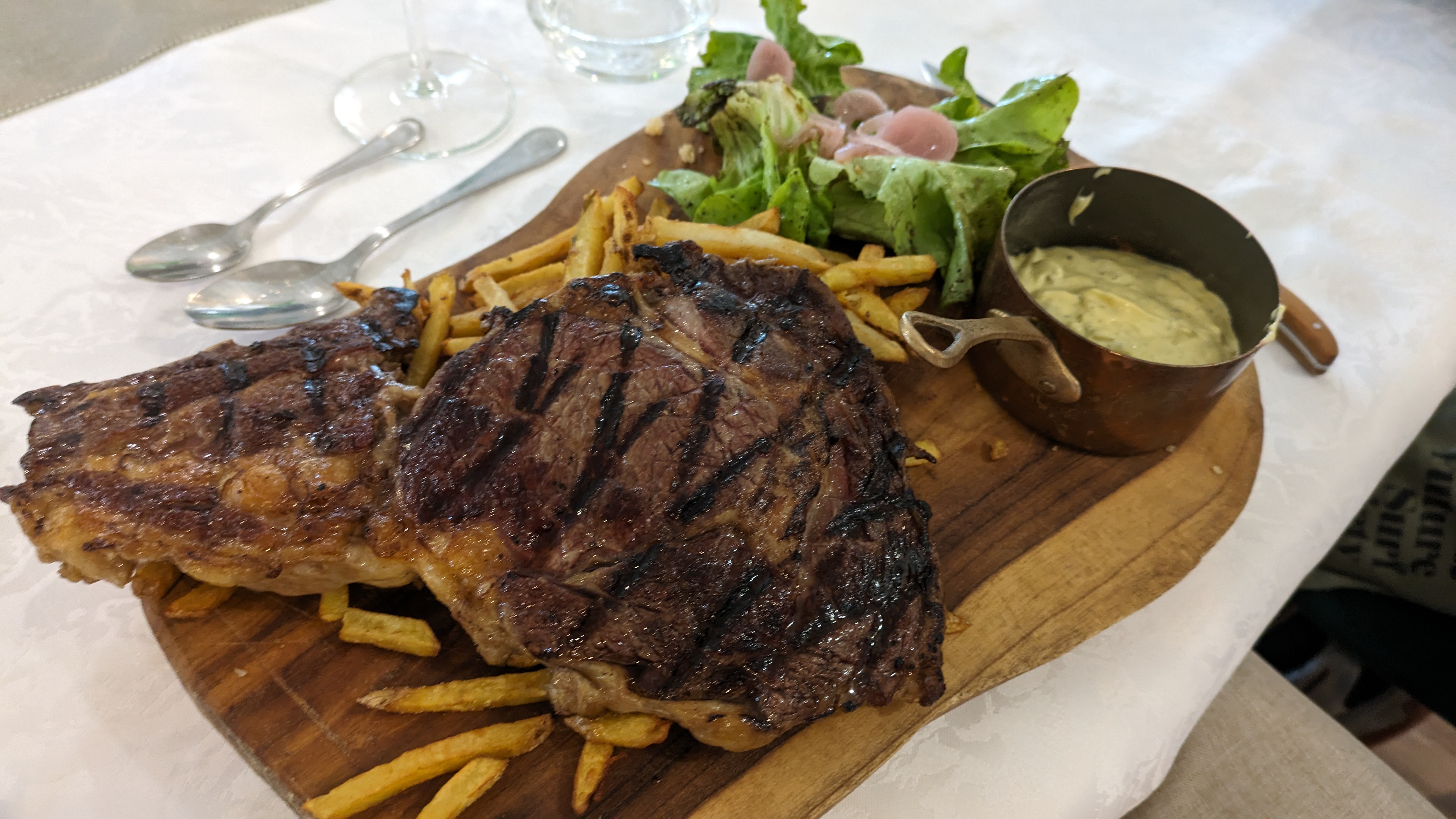 Très belle côte de bœuf frites salade Un très bon restaurant où les parts sont généreuses. Je recommande