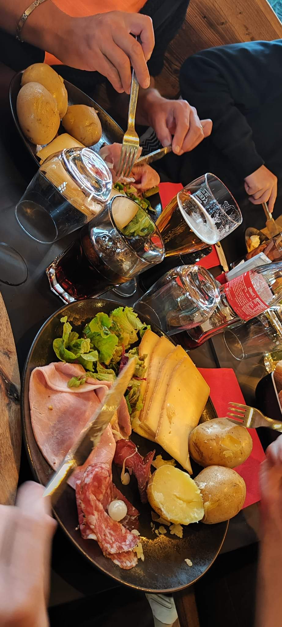 Décevant ! Vraiment ! 22€/ personne pour 3 pommes de terre 1 tranche de jambon blanc, 2 tranches de saucissons super poivré et 10cms de jambon cru qui ressemblait à des fins de chute, un petit bol de légumes cuits vraiment froids et pas de salade - quand nous avons fait remarqué à la serveuse que cela semblait peu pour 3 elle a dit que c’était suffisant puisque c’est en chiffonnade mais que si vraiment ce n’était pas assez elle pourrait éventuellement ajouter des pommes de terre et du fromage ; ce qu’elle a fait ! Pas de banana split : c’est pas de saison les bananes madame, je n’aurais pas le temps d’en cueillir de toute façon! Voilà tout est dit !