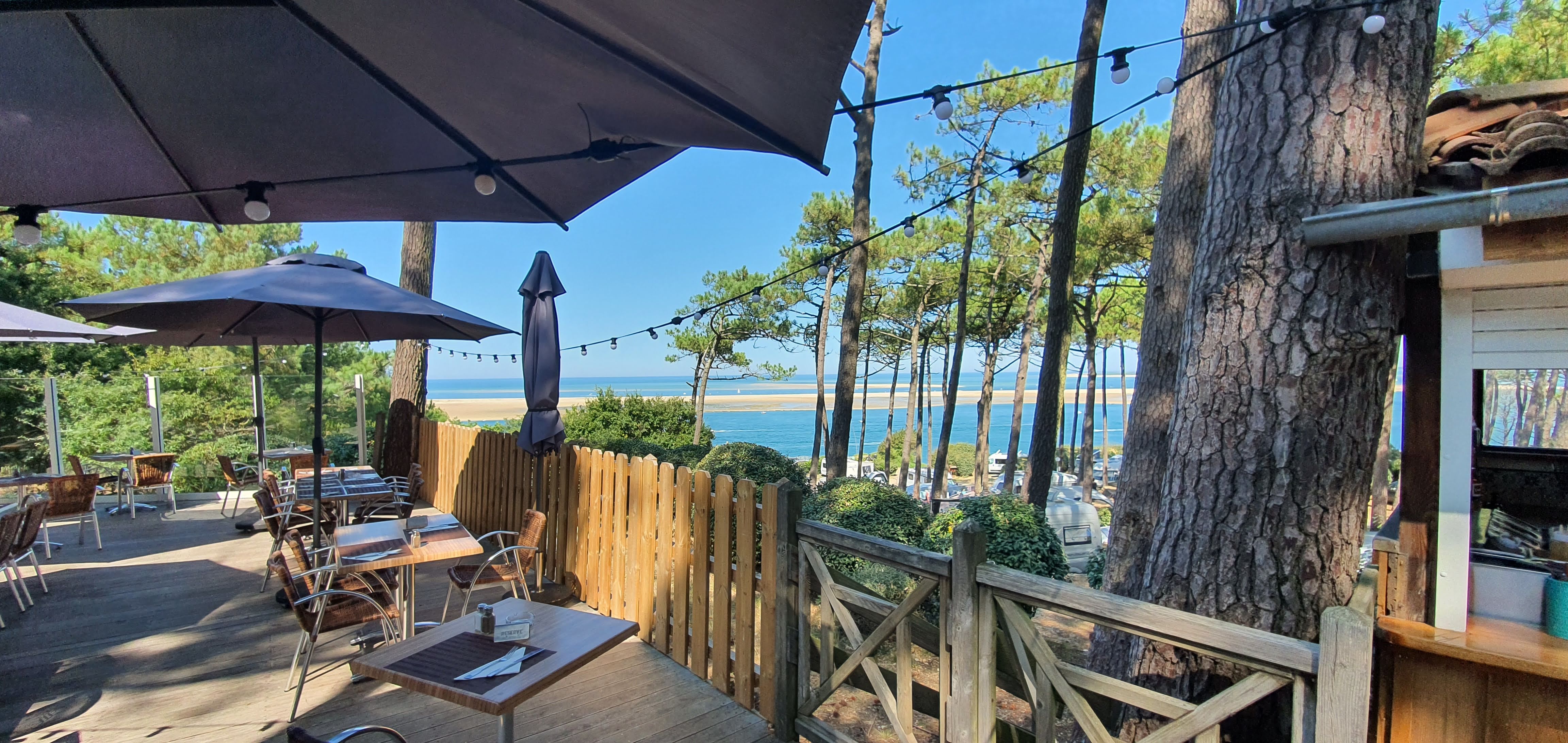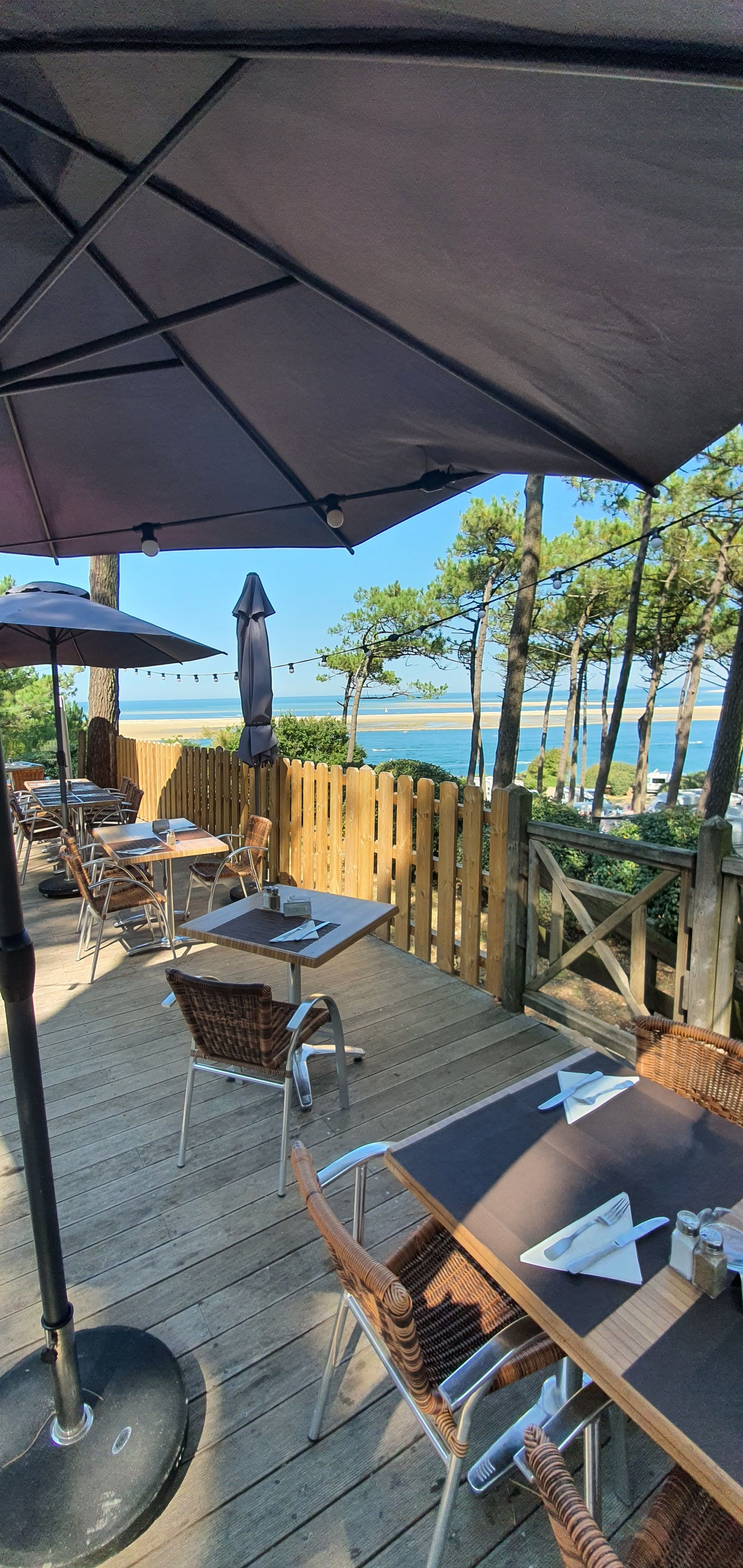On nous avait parlé de cet endroit qui se trouve dans l enceinte d un camping.le cadre est fabuleux ,vu de la dune du banc d Arguin et des parc à huîtres.Etablissement tout en bois . Nous avons été servie par une jeune femme top .Tout était bon et frais.Des crêpes maison en dessert .
