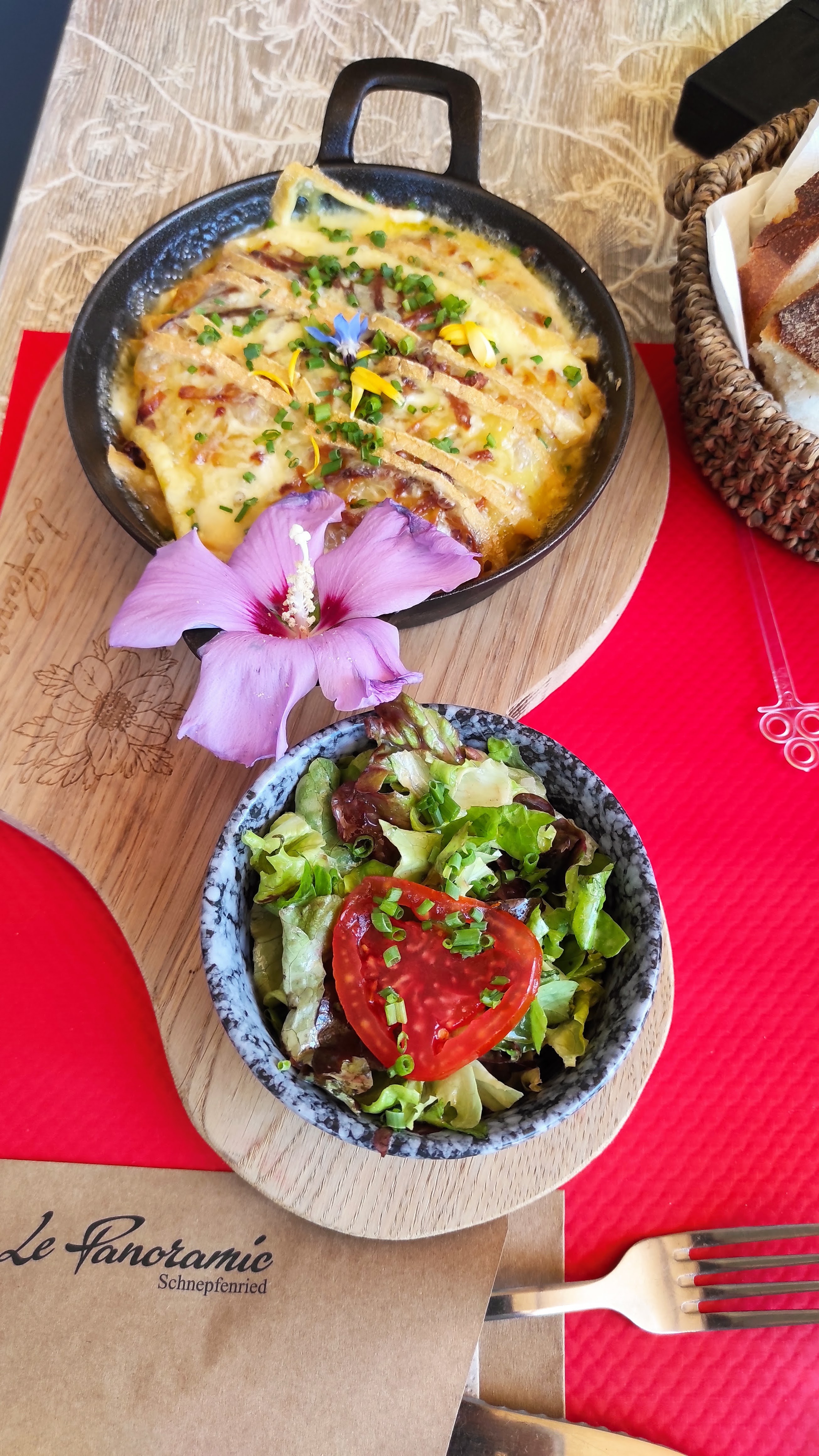 Super service. J'ai pu goûter le Bibalakass, plat traditionnel alsacien. Copieux, joliment présenté et avec beaucoup de goût (le munster est divin). Et une terrasse avec un panorama à couper le souffle. Je conseille fortement.