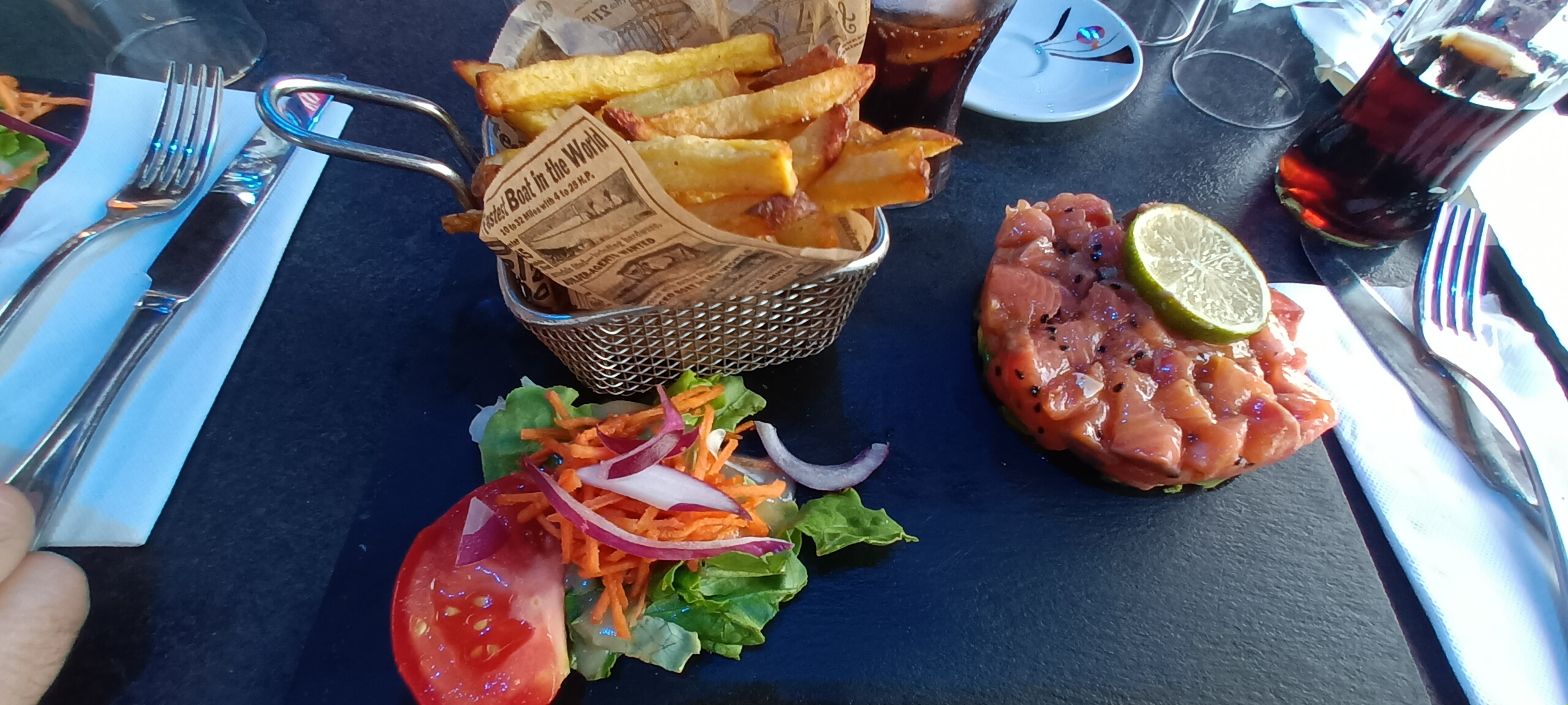 Je suis venue avec mon conjoint, il a commandé un tartare de saumon nickel et moi un tartare de boeuf (j'aurais du faire la photo) service sur ardoise....le tartare pas préparé pas pratiquele mélange surtout avec un oeuf.... Mais alors ce qui m'a choqué c'est que le tartare faisait 4cm de diamètre sur 1 de haut.... Style un menu petit enfant pour 19€ servi avec des frites en caoutchouc et de la salade a moitié cuite.... Bref ....pour vous dire qu'on a pas tenté plus ..... Très déçue je vous conseille d'aller dans Calvisson si vous êtes dans le coin sinon a évité