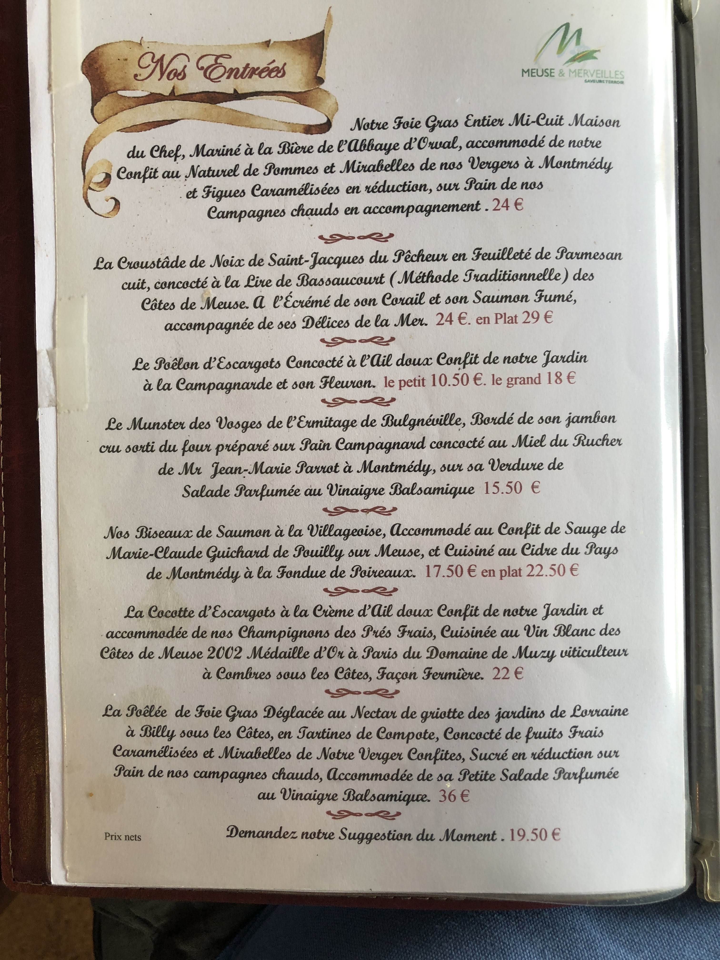 Lieu chargé de plaisirs culinaires et de décoration. L accueil est chaleureux et souriant ; le chef a envie de faire goûter de belles spécialités. En photo : plat d escargot, feuilleté escargots / grenouilles, tartine au Maroilles, pintade, filet de flétan Et en prime amuses bouches, trou lorrain (avec ou sans alcool) plateaux de bouchées sucrées de la région offerts Tout fut bon, à notre regret trop de touches de légumes dans l assiette ( un peu chargée de fait aussi) qui ne permet pas d en apprécier un vraiment plus qu’un autre (et demande certainement au chef une gestion de stock de légumes ) Le lieu vaut le déplacement avec vue sur la rivière et la citadelle de Montmedy. Attention cependant à la note, elle grimpe vite.