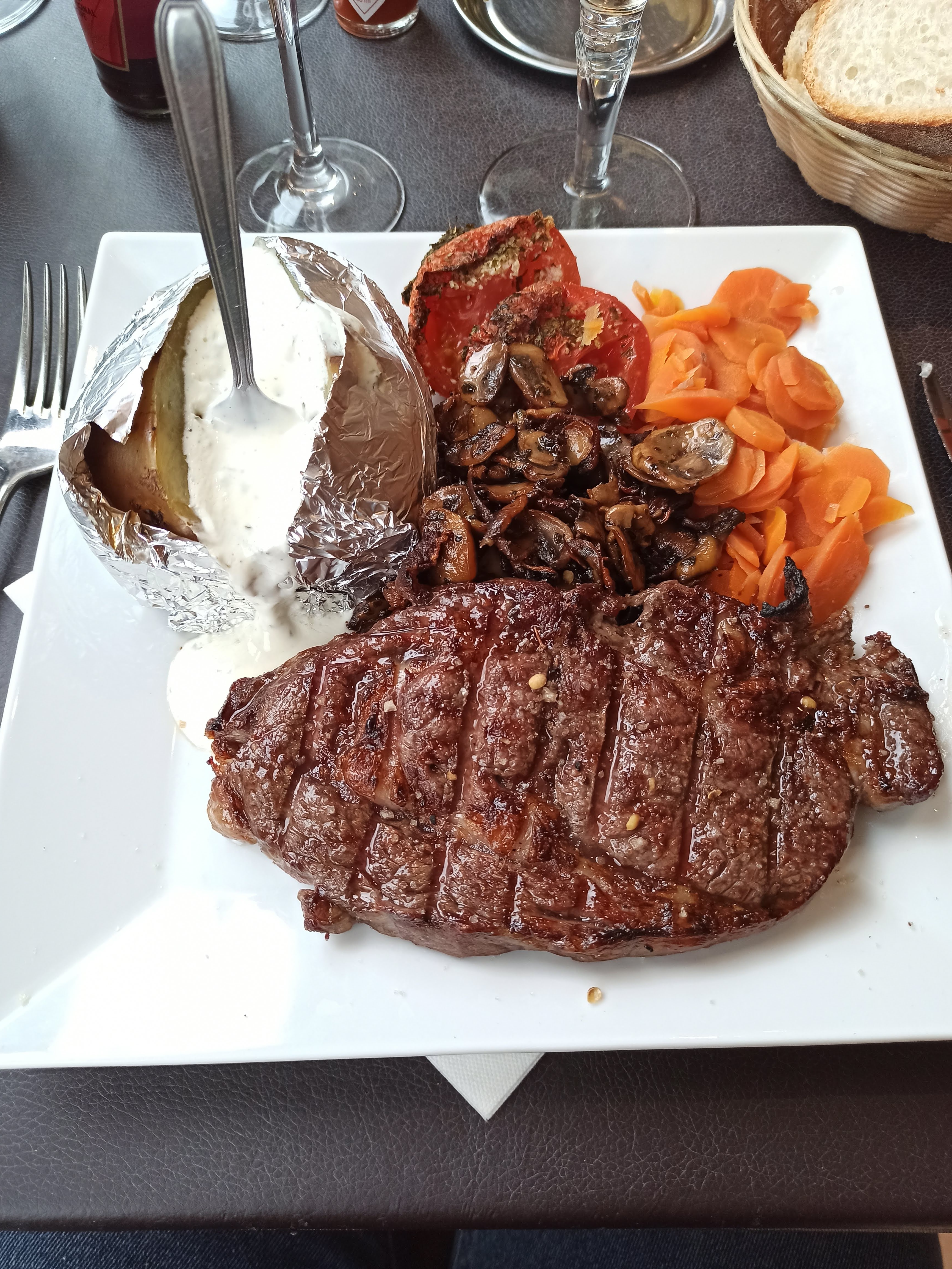 Je me suis régalé , viande parfaitement cuite et légumes excellents . Service impeccable , lieu convivial .