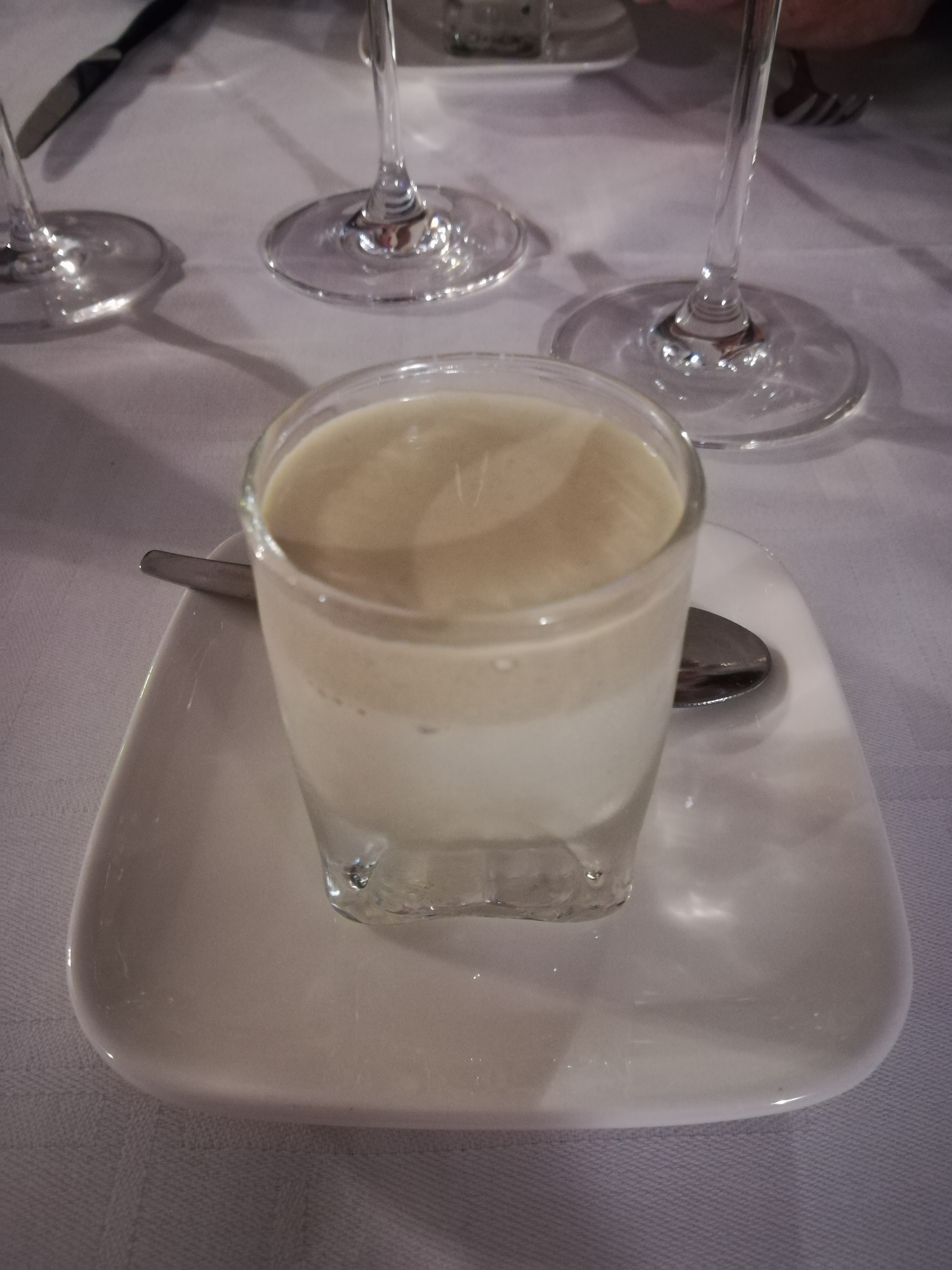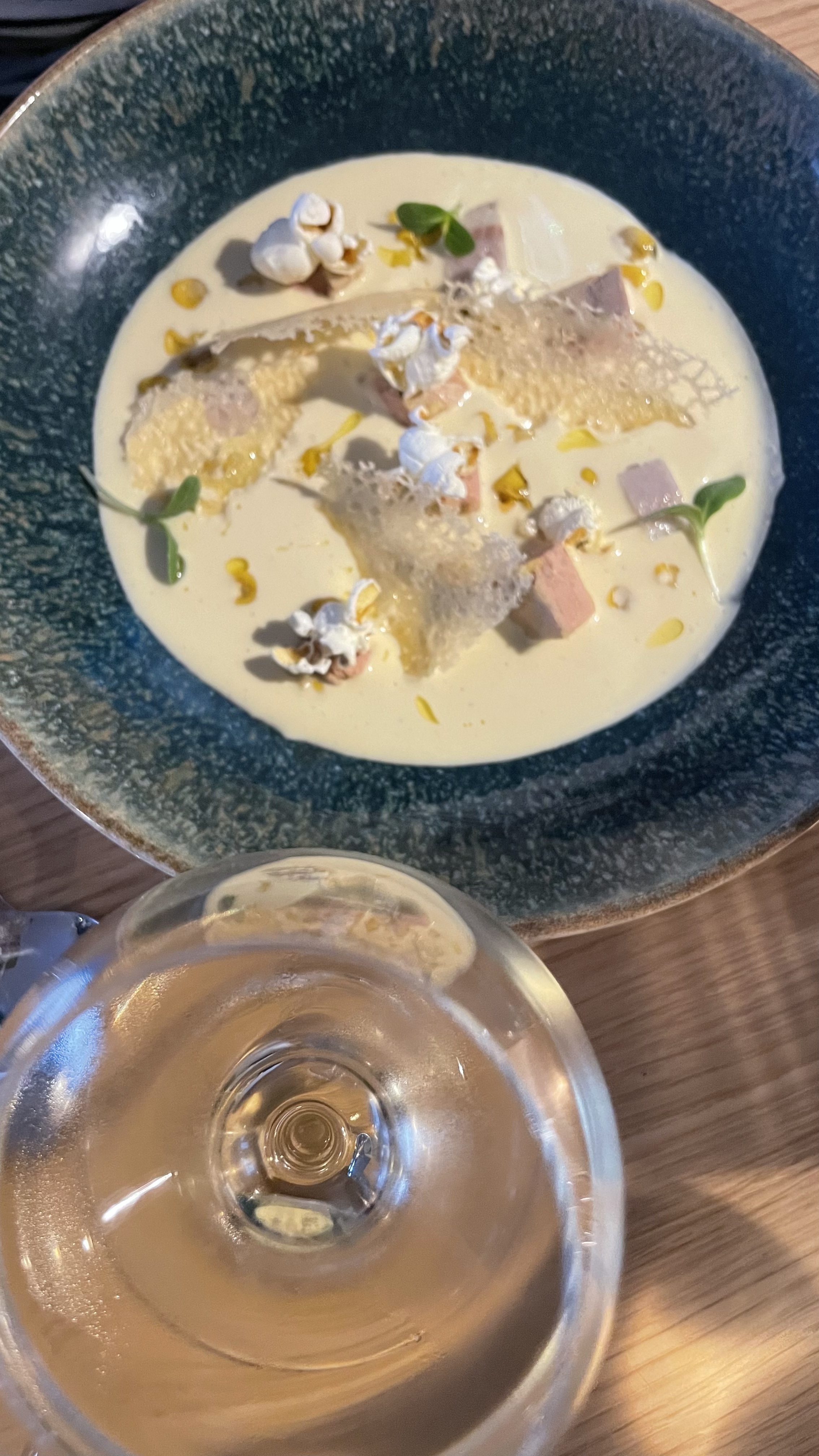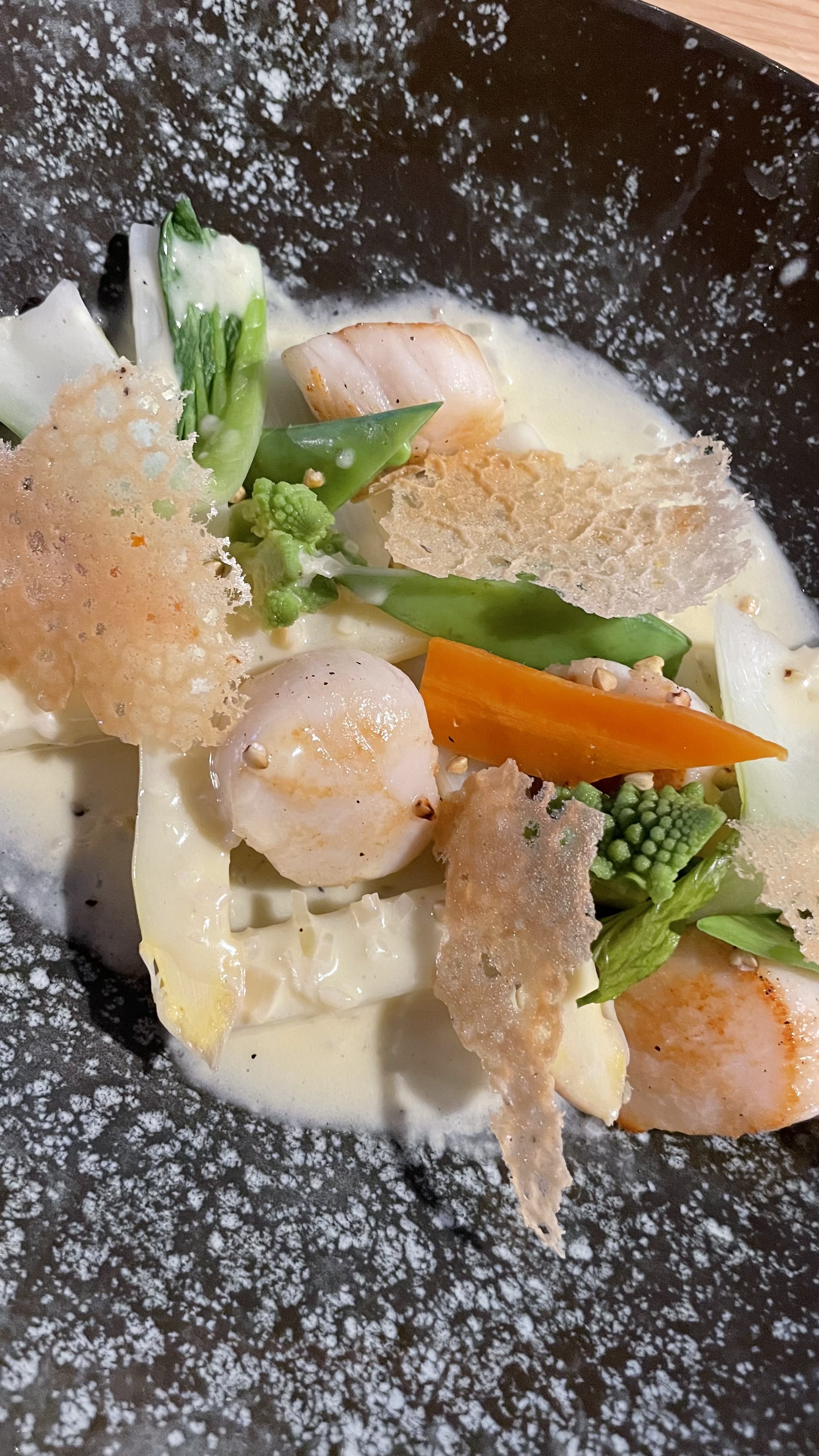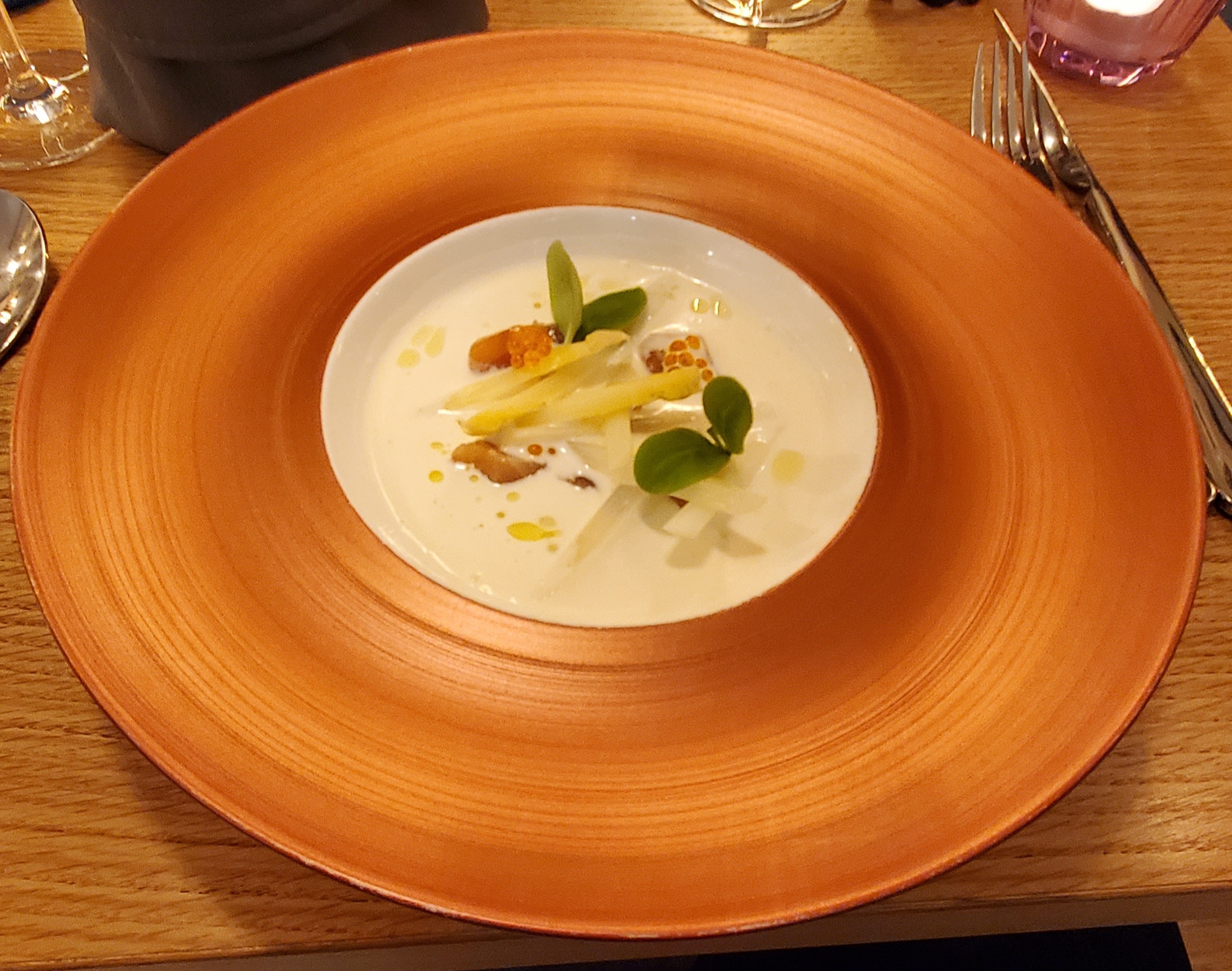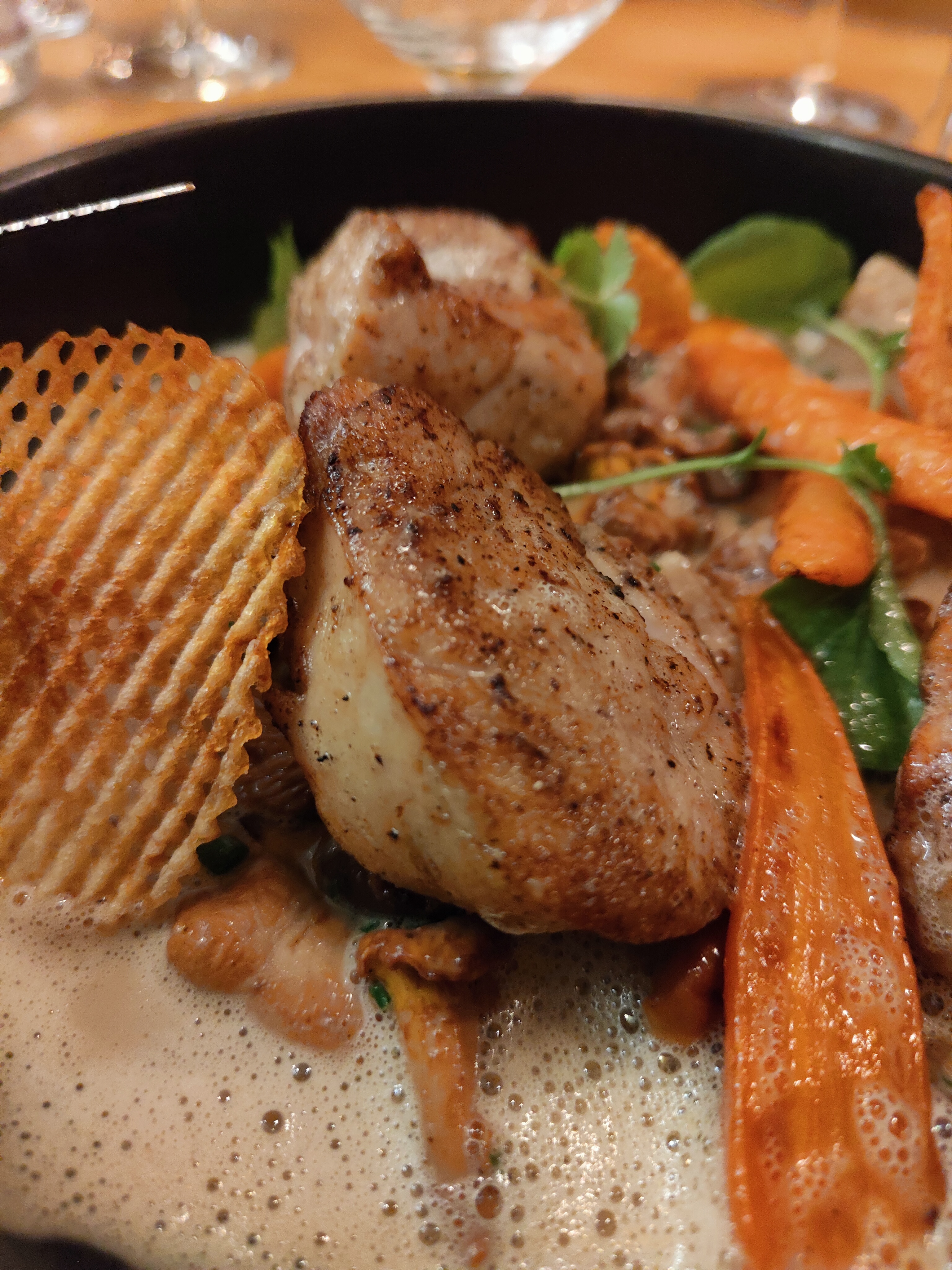 Mise en bouche panacotta de st Jacques et chantilly au chorizo top! Carrément au beurre blanc et petits légumes parfait et dessert tout aussi succulent crème brûlée à la violette et soupe de chocolat blanc. Bref restau que je recommande avec un excellent rapport qualité prix