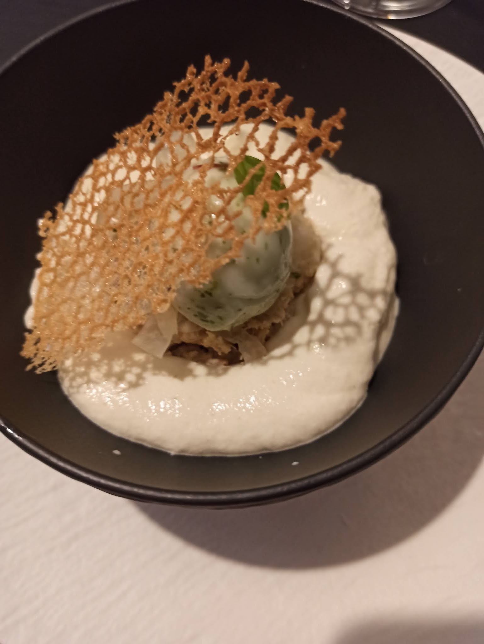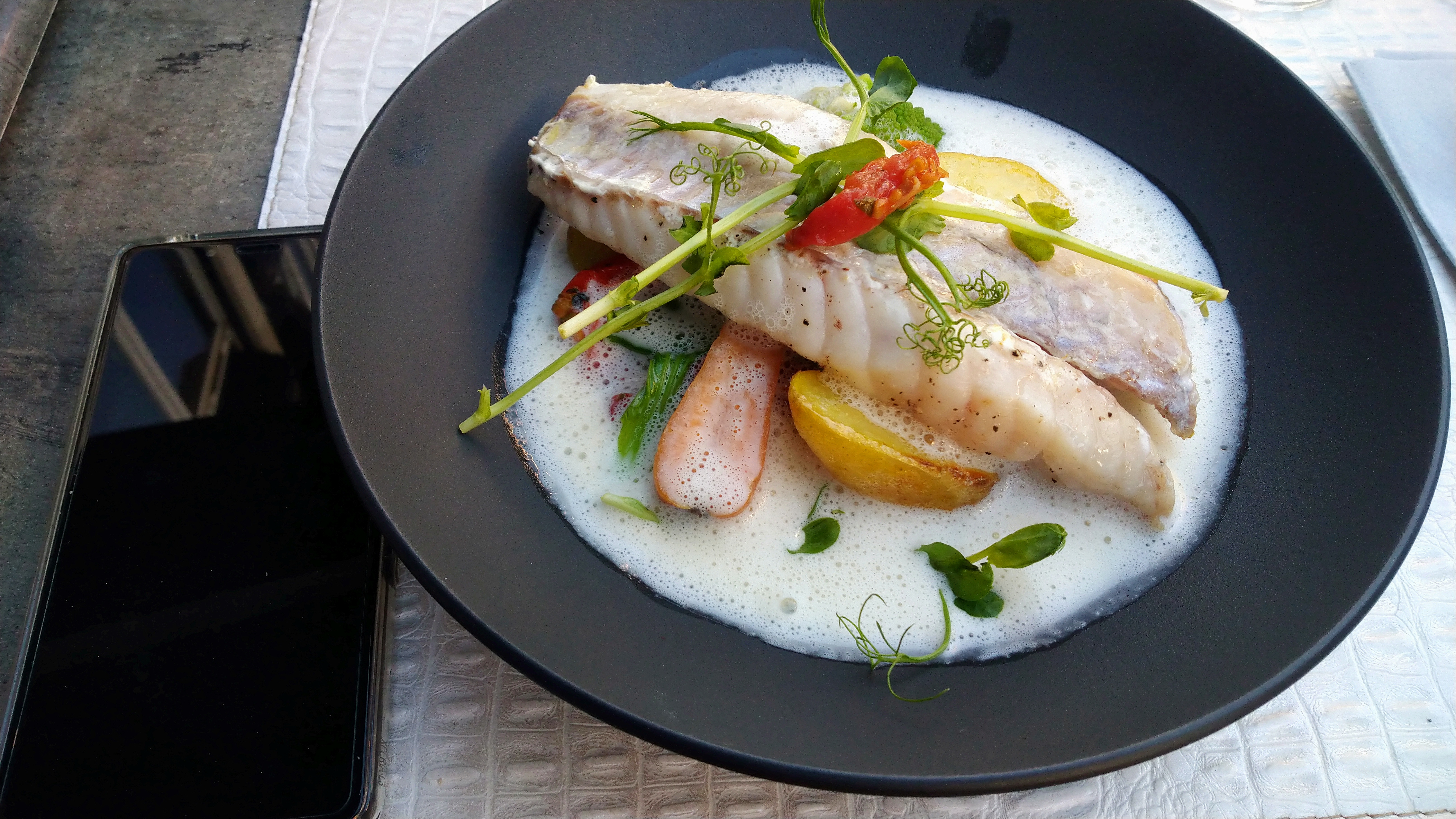 Accueil parfait. Personnel fort sympathique et compétent! Décoration sublime, de goût et de qualité. Les mets sont exquis, de l’entrée au dessert, il n’y a rien à redire… la qualité est présente, nous savourons chaque bouchée ! Tout est divin et nous avons été plus que conquis. En entrée foie gras, velouté de maïs et anguille, pour le plat le cabillaud était remplacé par Saint Jacques, carottes, asperge avec une sauce d’une délicatesse… pour finir, le dessert était Vanille Chocolat sablé. Si vous cherchez à raviver vos papilles par de l’excellence alors ce lieu est fait pour vous… Merci pour ce moment parfait