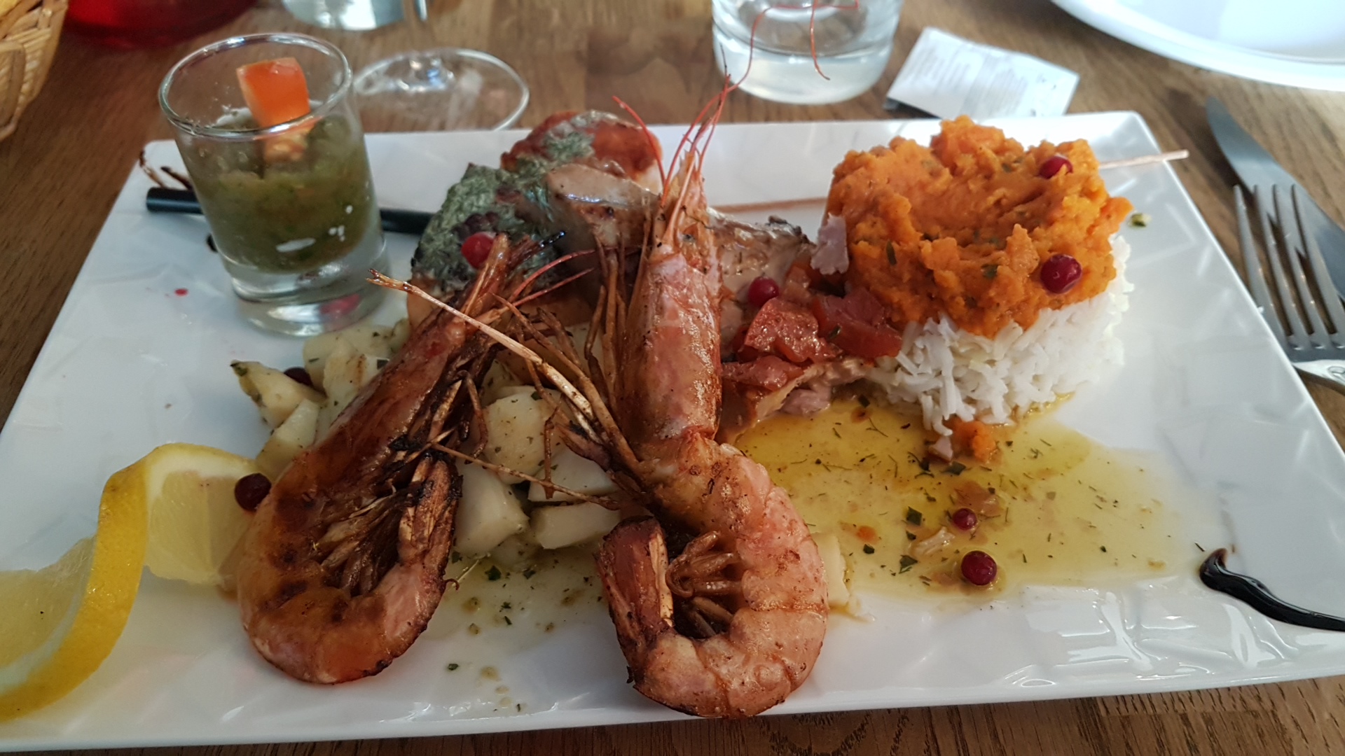 Très bon repas = assiette thon mi cuit, saumon et encornet délicieux. Adaptabilité a mon intolérance au lait de vache (beurre, crème fraiche, fromage) = plat sur mesure substitution de certaines sauces par d'autres. Très bon service et très bon accueil! Terrasse tranquille et ombragée.
