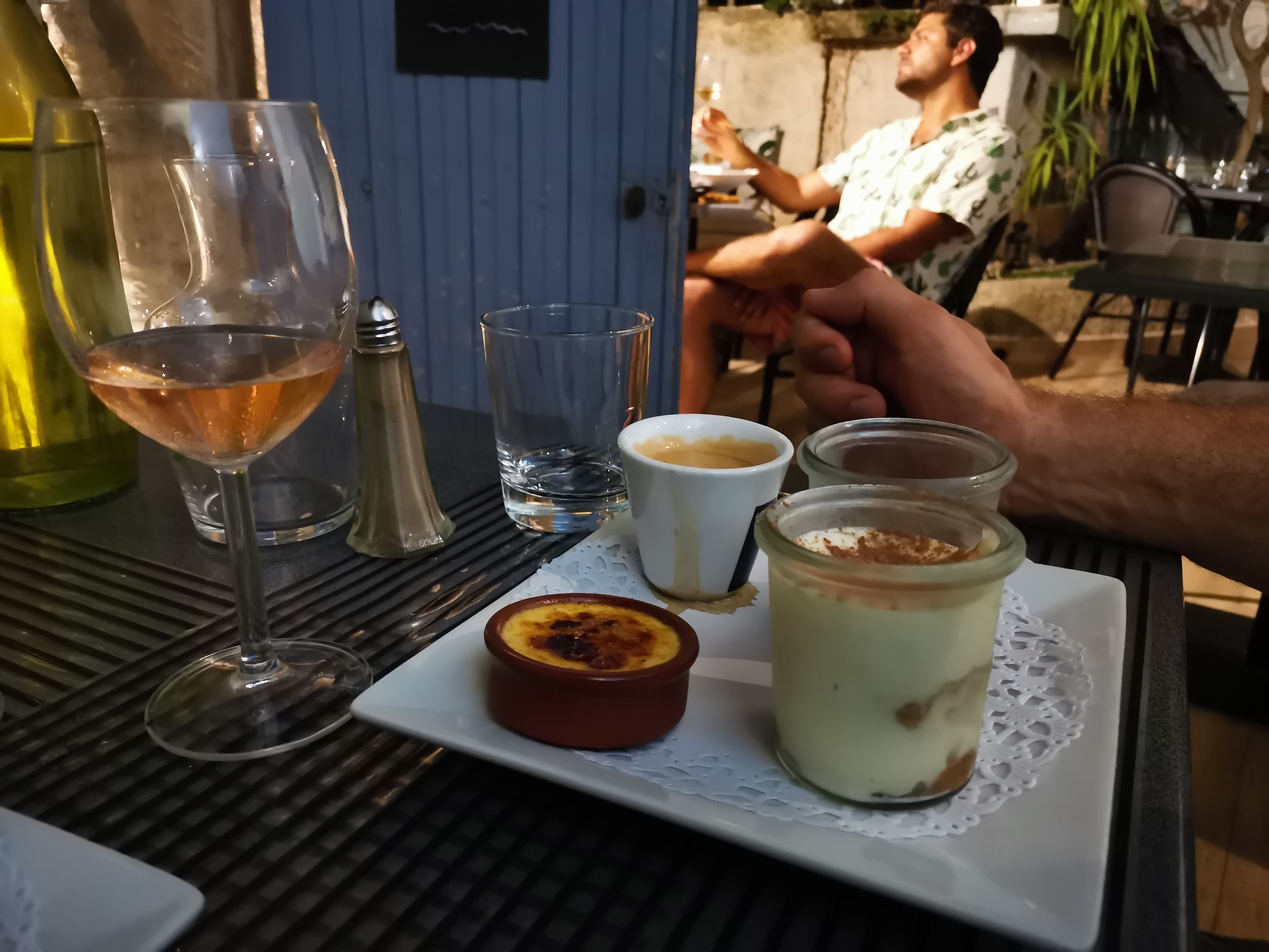 Nous avons dîner à la carte dans ce charmant patio simple mais agréable. Service aimable et sympathique et cuisine à la hauteur de la note Google. Un tartare de thon frais et bien présenté mais, à notre avis, un peu trop d 'acidité masquant le goût général du plat. Une assiette de linguines aux courgettes et gambas plutôt fade, un assaisonnement plus relevé aurait rendu ce plat parfait. Là encore, belle présentation. Un risotto au poulpe excellent, rien à redire, un riz savoureux et poulpe à la cuisson parfaite. Un thé gourmand pour ma femme qui permet de savourer trois desserts : Une mousse chocolat 20/20 Un tiramisu parfait Une panacota caramel parfaite aussi. Le tout arrosé par un cassis blanc, domaine du paternel à la hauteur. Nous y reviendrons sans hésitation. Merci 😉