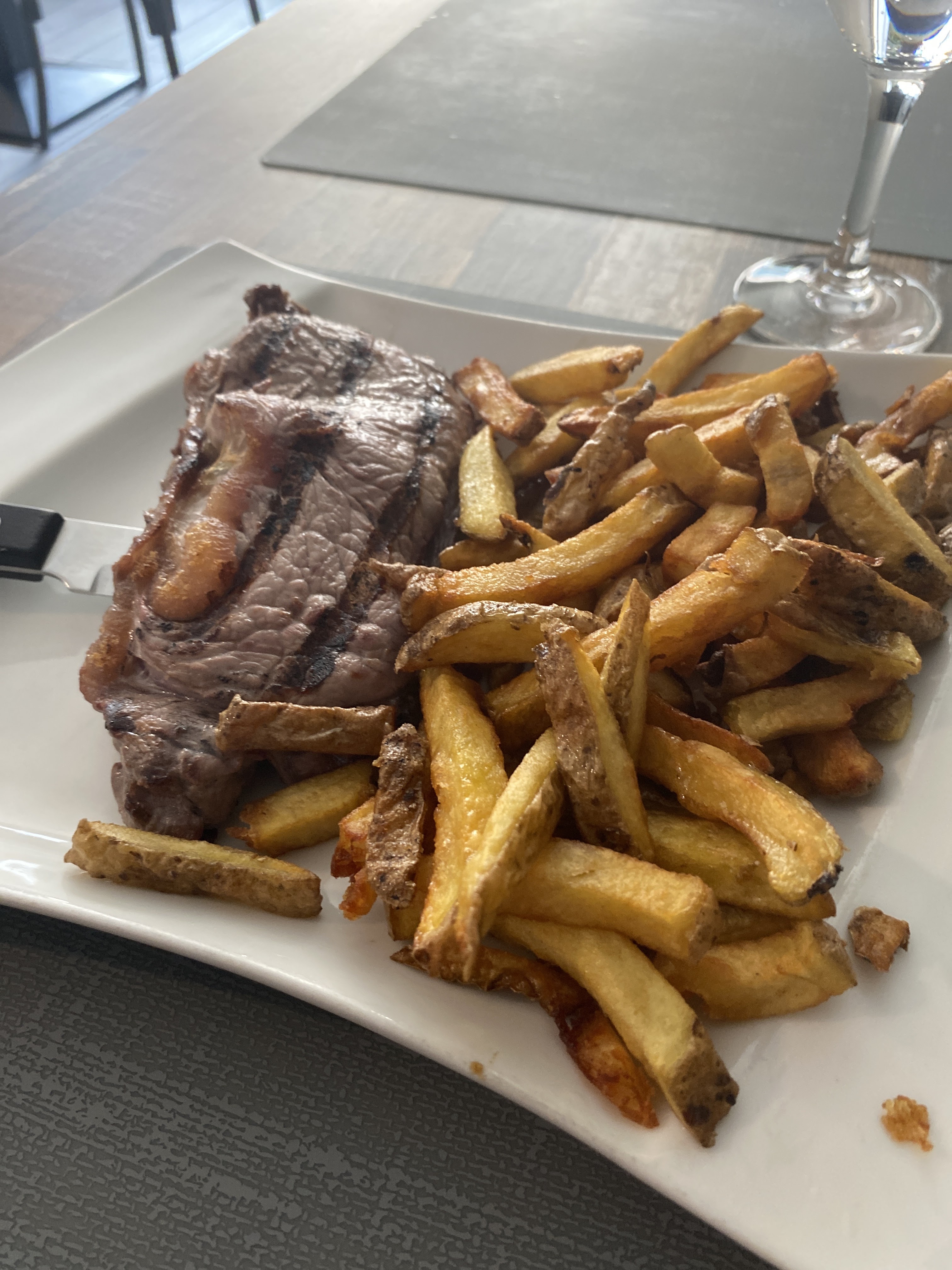 La salle est très propre, la déco froide (les goûts et les couleurs…). Il y avait un peu de monde, c’est très bruyant car les voix résonnent. Pour ceux qui veulent manger rapidement et équilibré pour 17€, c’est parfait. Nous avons mangé à la carte. L’apéritif : muscat température ambiante avec rondelle de citron (pour ma part c’est une première) sans rien à grignoter… soit La pièce du boucher avec frites maison et salade : la viande est insipide (ressemble à du bas de gamme de chez Métro), les frites sont mauvaises. J’ai demandé si elles congelées, la patronne m’a répondu que c’était dû au fait qu’elle étaient précuites le matin. Du coup, nous avons abrégé notre repas en ne se risquant pas sur les desserts. Le café que nous avons laissé est mauvais. Nous sommes peut-être tombés sur un mauvais jour. Nous n’y reviendrons pas. Heureusement que d’autres personnes apprécient l’endroit