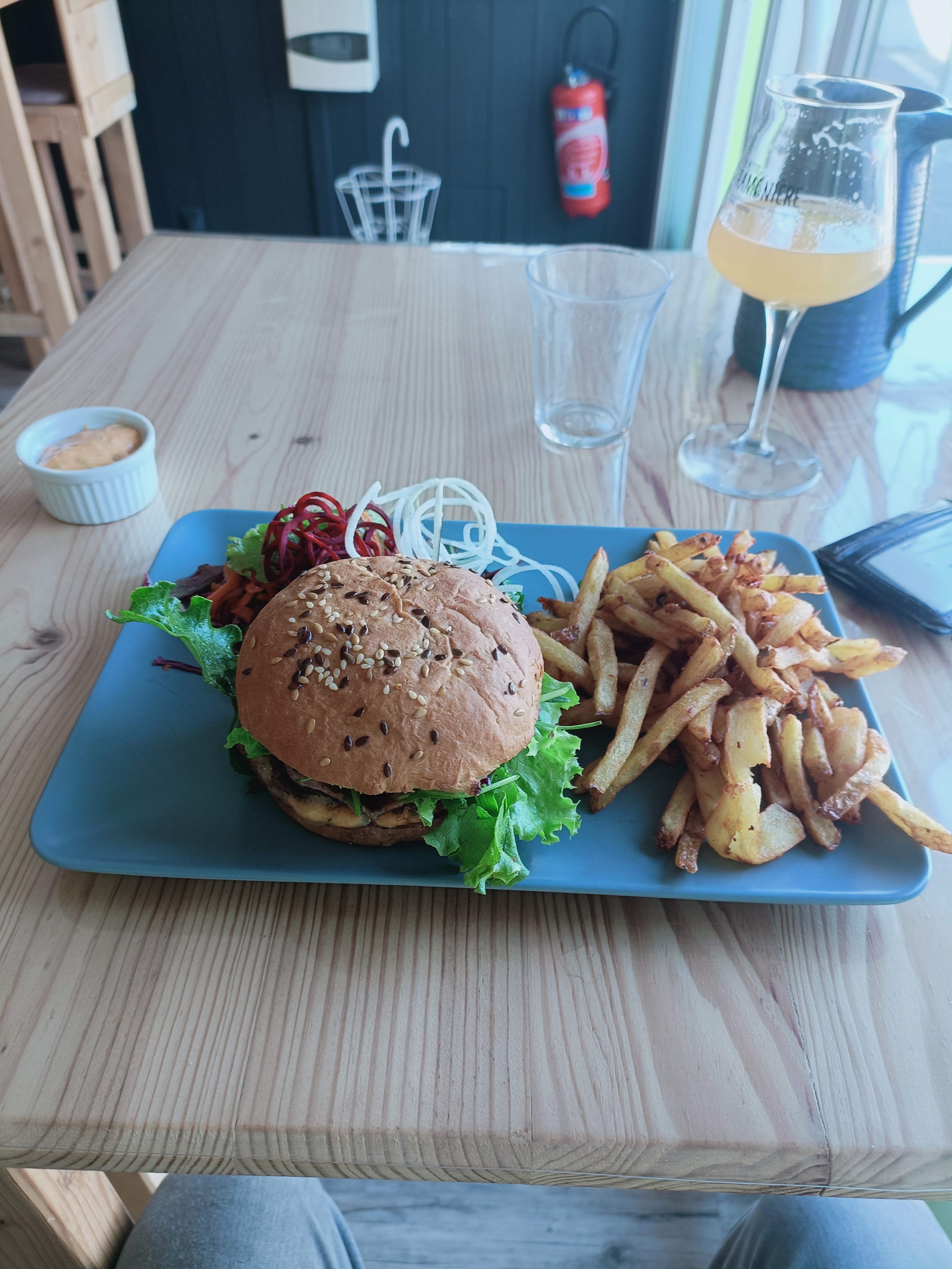 Cadre très agréable, bois clair. Petite salle pour l'hiver avec extensions extérieures couvertes ou non. Très bon accueil. J'ai adoré le Burger patio'nément. Je recommande vivement