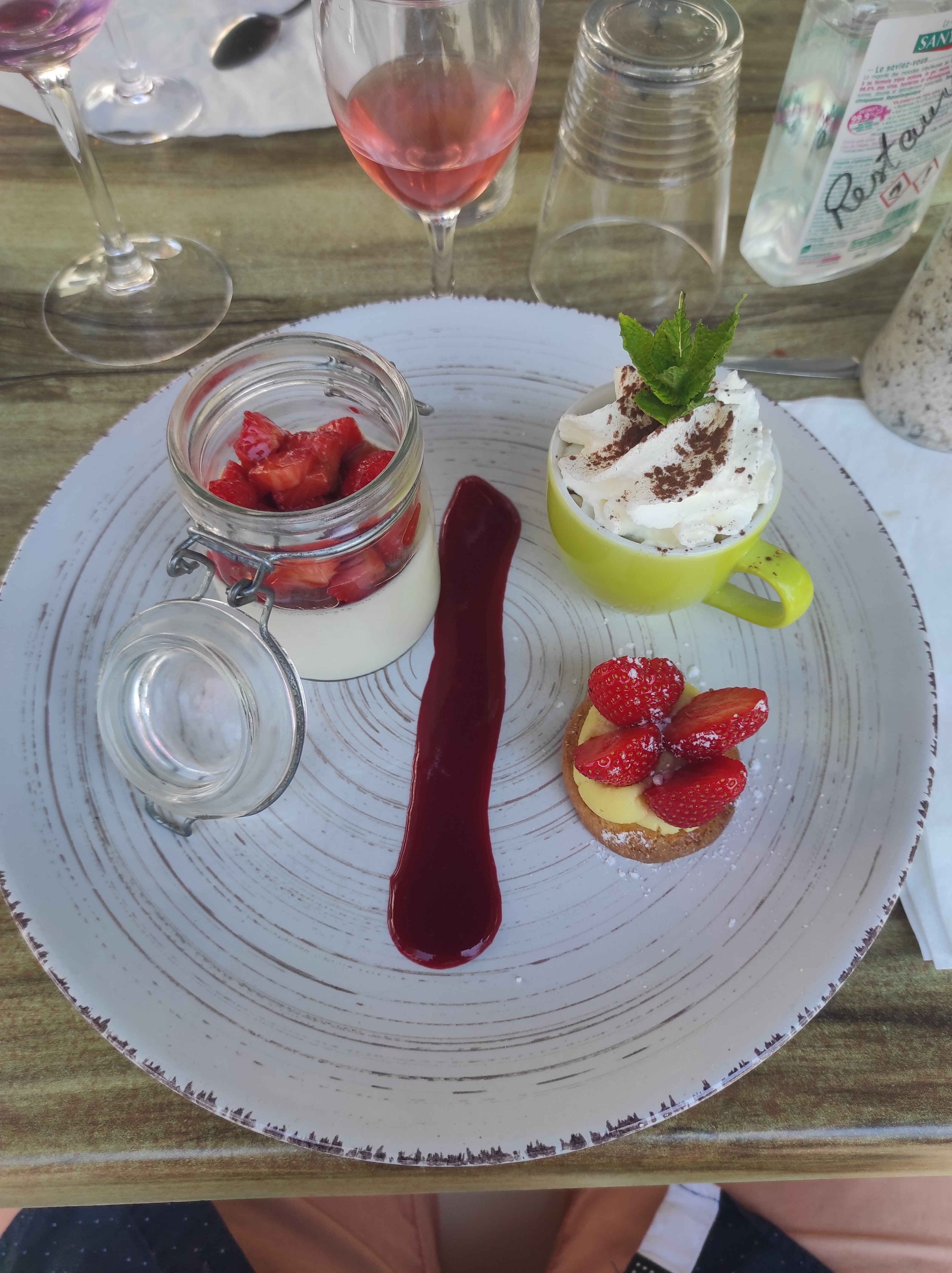 Repas absolument succulent : pana cotta d’asperges, Saint Jacques, capuccino de fraises. Tout est frais et délicieux ! Seul petit bémol : salle bruyante et service un peu lent mais on leur pardonne en raison de la qualité du dîner…