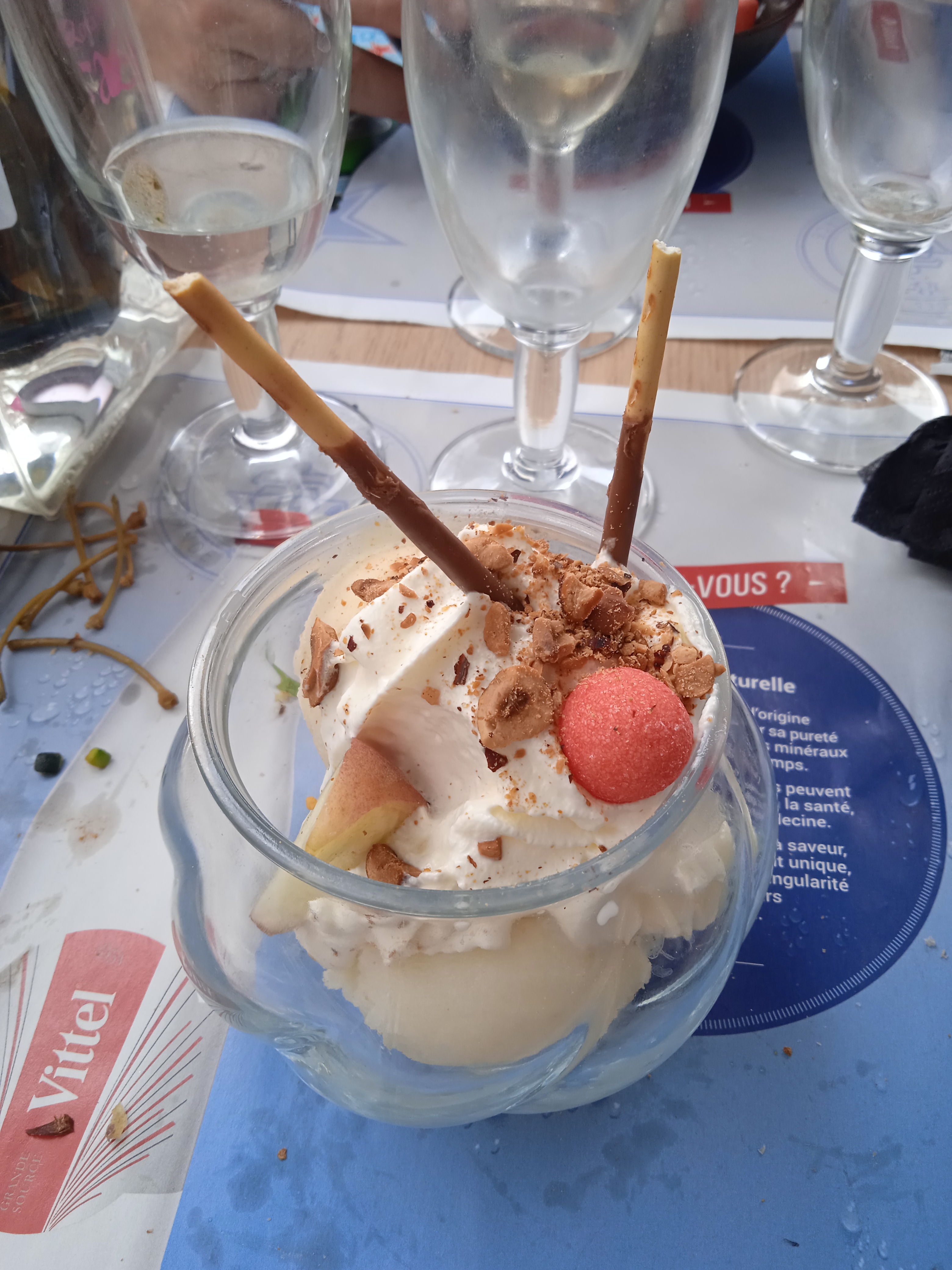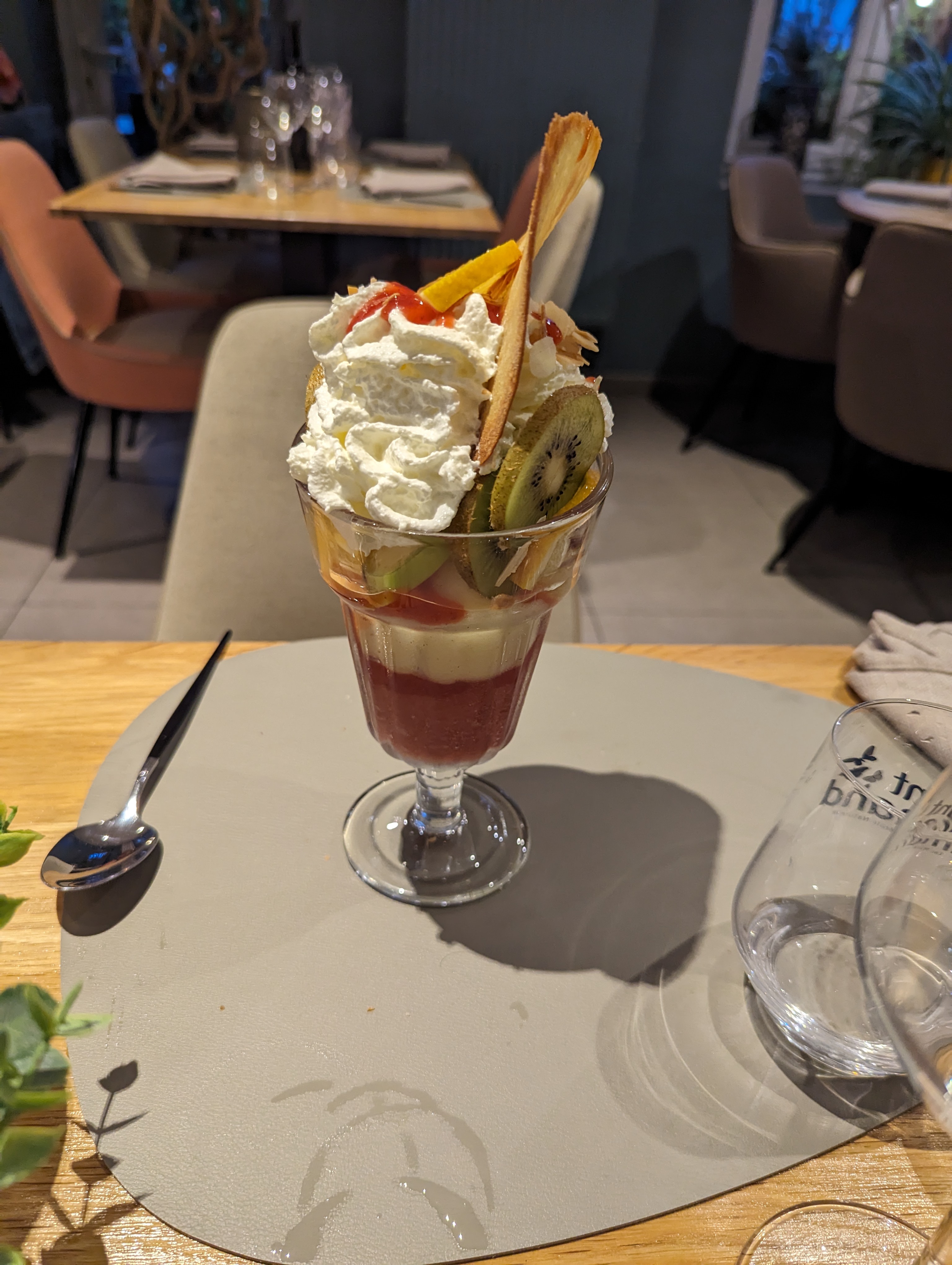 Nous n'avons malheureusement pas apprécié le goût du poisson présent dans la cuisine du menu (49€). Nous avons aimé le canard du menu gourmandise (52€). Le dessert glacé contenait des fruits non pelés, ce qui nous a semblé étrange. Vous devez éplucher vous-même les morceaux de banane et de kiwi.