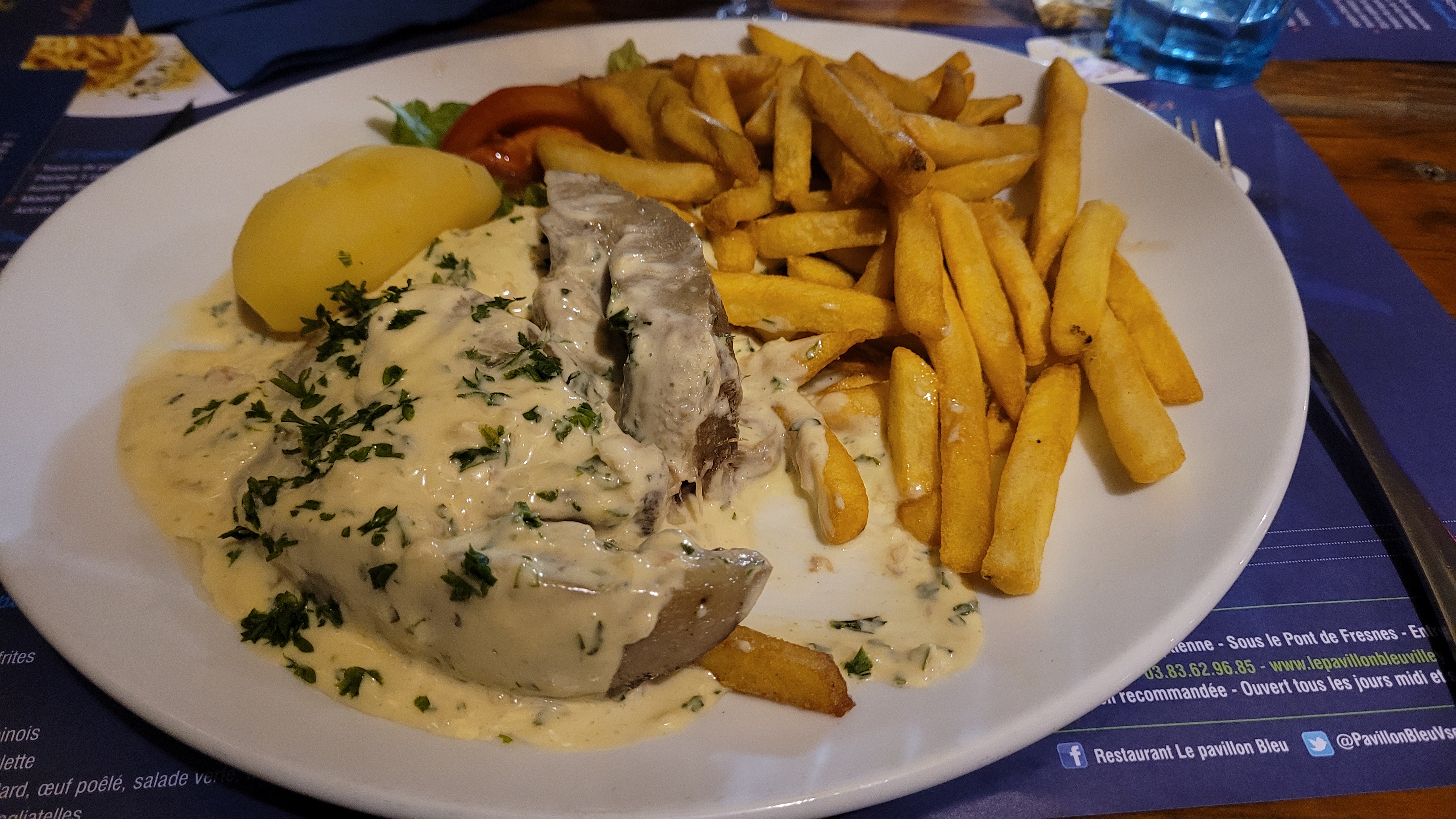 Cadre très agréable, personnel sympathique compétent qui fait le maximum pour vous. Cuisine sans prétention toutefois très bien préparée. Qui vous donne envie de revenir, et de l'inscrire dans vos adresses favorites. Perso, j'ai fixé mon programme avec le pavillon bleu pour les 30 jours prochains. 100 euros pour trois convives, avec une bouteille de vin, entrée plat deux desserts et un irish Coffee, nous sommes satisfait de ce bon moment et nous y retournerons.