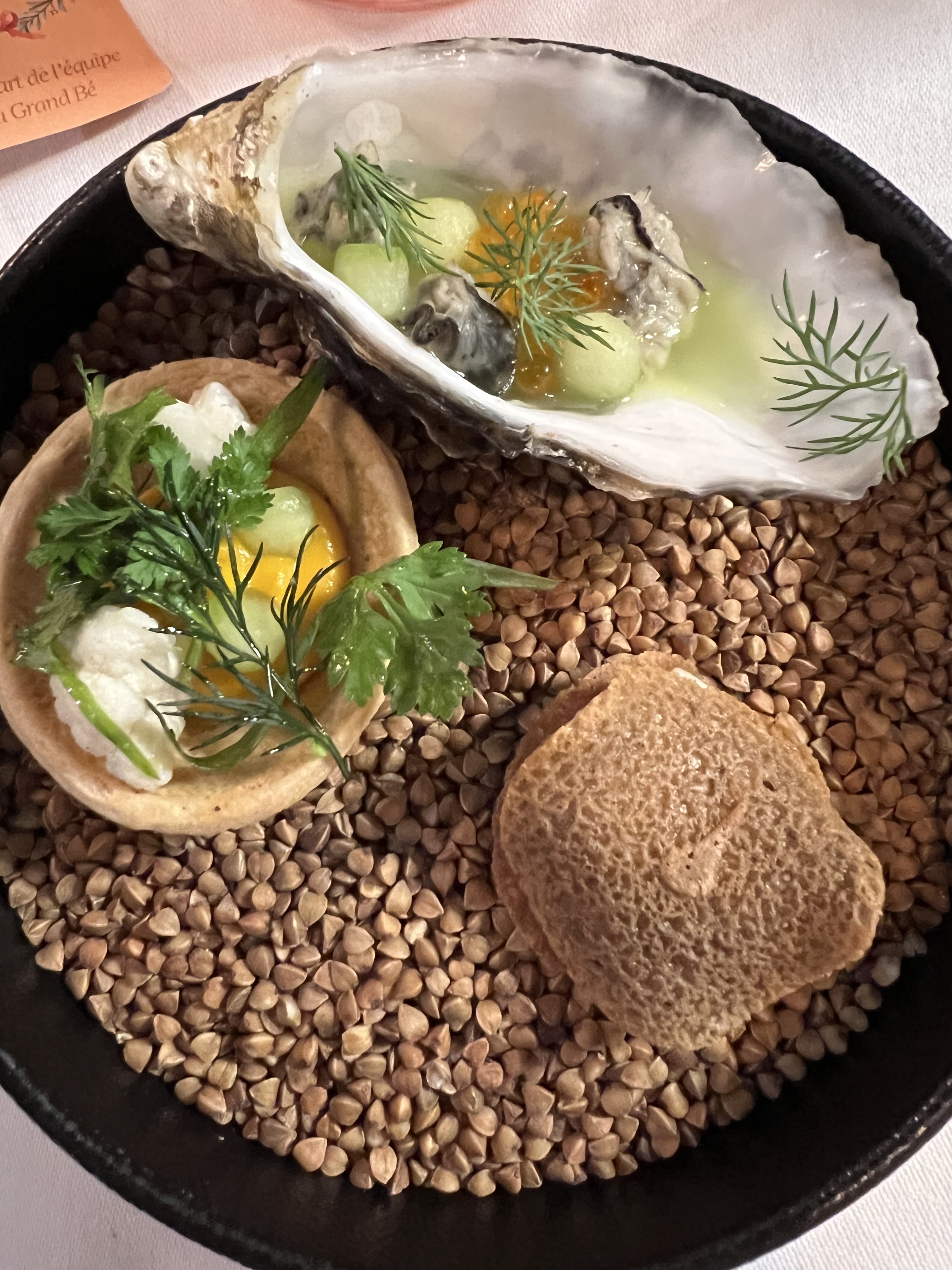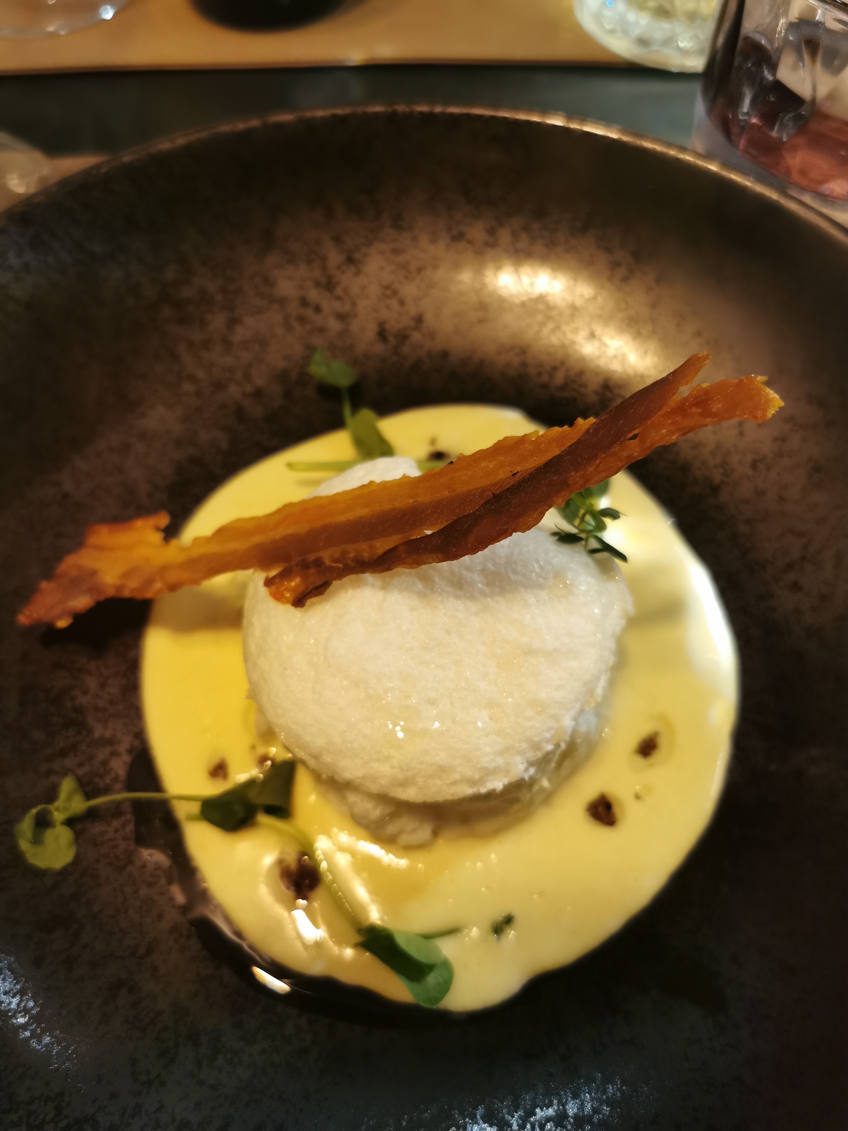 Amuse bouche très sympa,coquilles saint Jacques cuites juste comme il faut et dessert d’antan revisité glace au lait ribot délicieux excellent moment