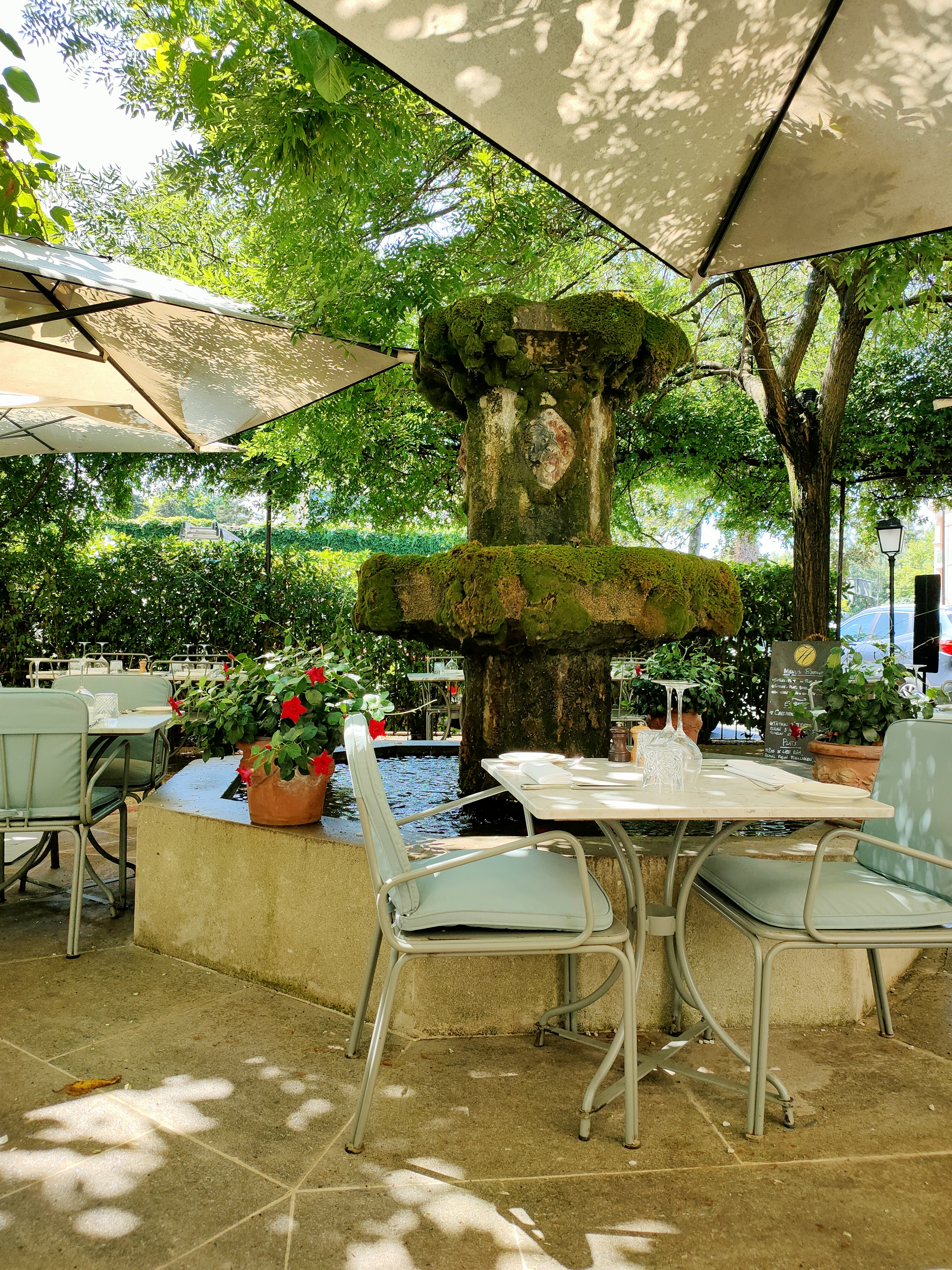 Nous avons passé un super moment au frais à côté de la petite fontaine une jolie table nous attendait après la journée d' été à plus de 40 degrés. Service très attentionné, bonne recommandation pour les vins, une carte superbe avec 3 choix de menus. Les plats étaient d une qualité exceptionnelle. Et la quantité était au rdv ce que l on peut parfois reprocher aux restaurants gastronomiques et ce qui n'est pas le cas ici. Très bon moment et un super rapport qualité prix. A refaire et bravo à toute l' équipe