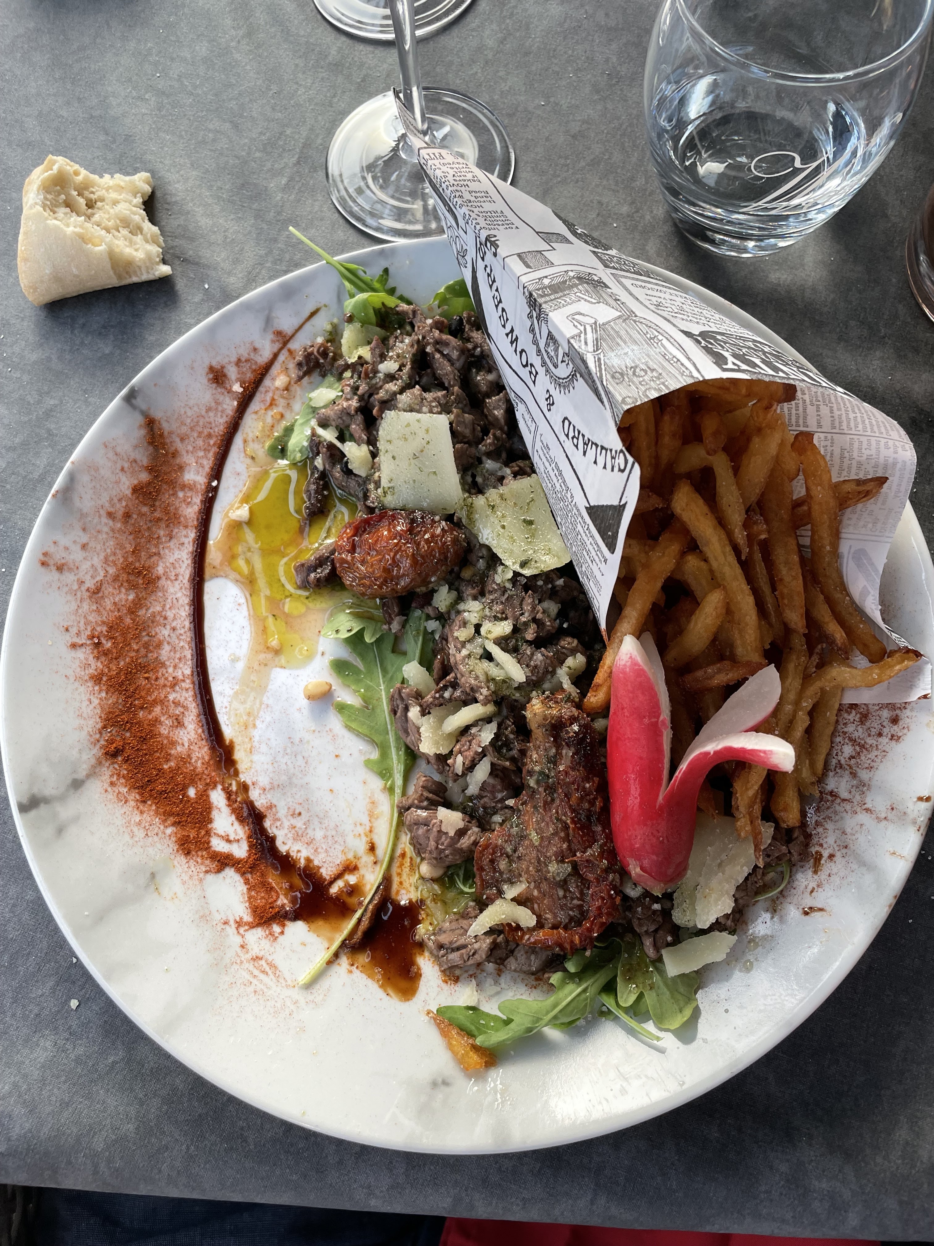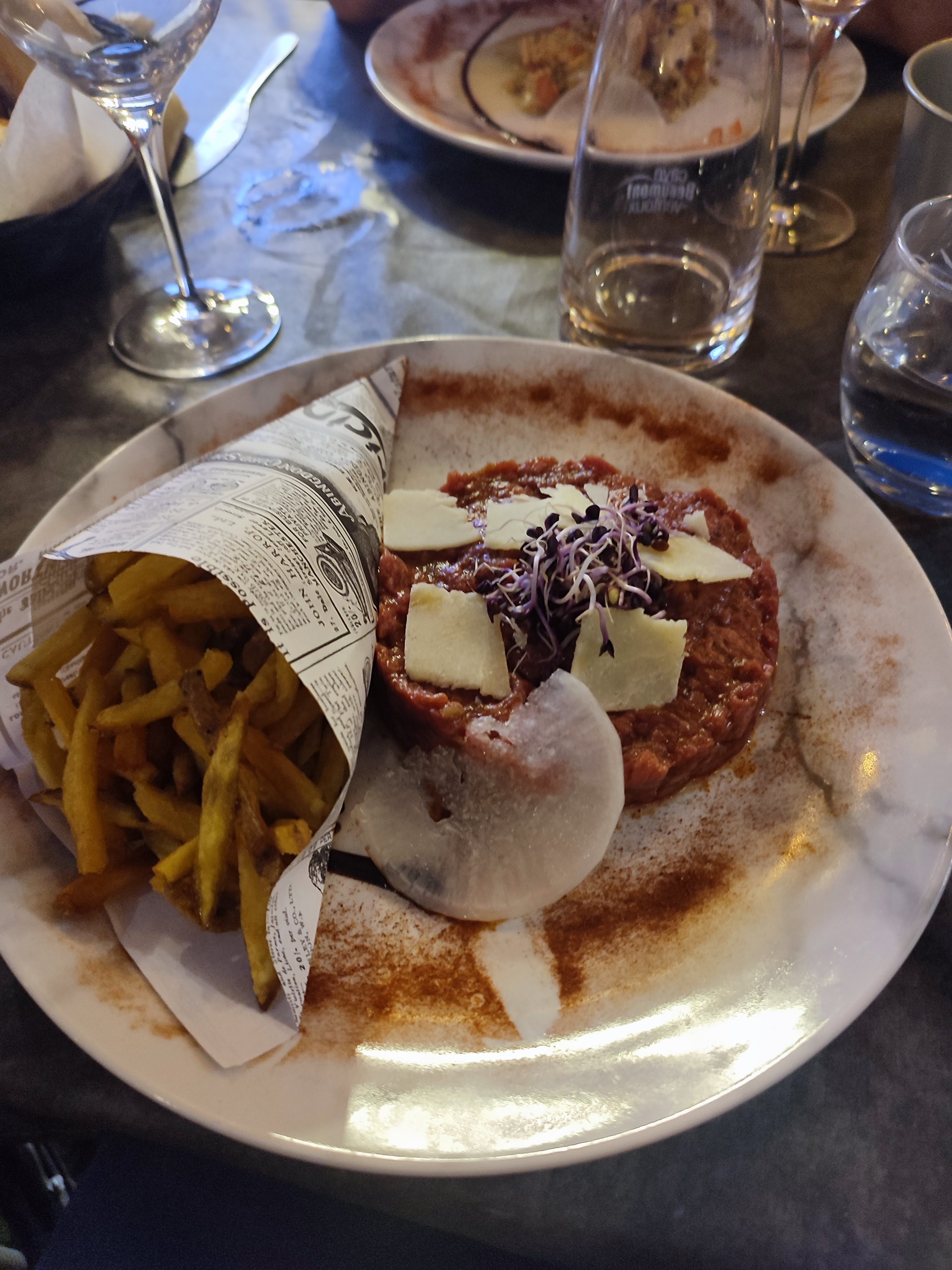 Accueil chaleureux. Personnel sympa. En revanche, évitez absolument le tartare de boeuf !! Il devait être coupé au couteau, il est arrivé une bouillie de viande, impossible de faire ça au couteau. Dans cette bouillie, des morceaux de tomates, de courgettes, de cacahuètes, des pignons de pin !! Bien évidement, pas d'oignon blanc (ou d'échalottes) pas de câpres, pas de ciboulette Le tout arrosé d'une sauce sucrée dégueu. Vraiment pas bon du tout